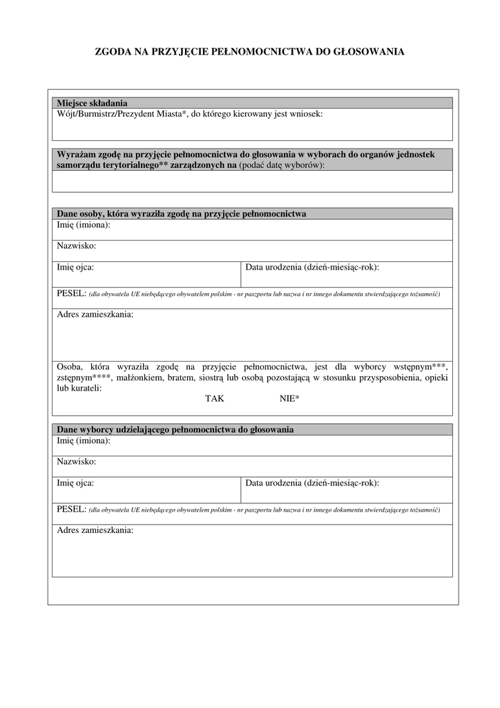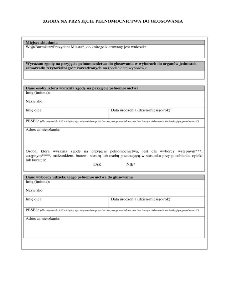 ZGODA NA PRZYJĘCIE PEŁNOMOCNICTWA DO GŁOSOWANIA Miejsce składania Wójt/Burmistrz/Prezydent Miasta*, do którego kierowany jest wniosek: Wyrażam zgodę na przyjęcie pełnomocnictwa do głosowania w wyborach do organów jednostek samorządu terytorialnego** zarządzonych na (podać datę wyborów): Dane osoby, która wyraziła zgodę na przyjęcie pełnomocnictwa Imię (imiona): Nazwisko: Imię ojca: Data urodzenia (dzień-miesiąc-rok): PESEL: (dla obywatela UE niebędącego obywatelem polskim - nr paszportu lub nazwa i nr innego dokumentu stwierdzającego tożsamość) Adres zamieszkania: Osoba, która wyraziła zgodę na przyjęcie pełnomocnictwa, jest dla wyborcy wstępnym***, zstępnym****, małżonkiem, bratem, siostrą lub osobą pozostającą w stosunku przysposobienia, opieki lub kurateli: TAK NIE* Dane wyborcy udzielającego pełnomocnictwa do głosowania Imię (imiona): Nazwisko: Imię ojca: Data urodzenia (dzień-miesiąc-rok): PESEL: (dla obywatela UE niebędącego obywatelem polskim - nr paszportu lub nazwa i nr innego dokumentu stwierdzającego tożsamość) Adres zamieszkania: Oświadczenia i wnioski Proszę o pozostawienie aktu pełnomocnictwa do głosowania do odbioru w urzędzie gminy/doręczenie na wskazany poniżej adres*: …...................................................................................................................................................................................... ........................................................................................................................................................................................ ........................................................................................................................................................................................ ........................................................................................................................................................................................ ........................................................................................................................................................................................ Informuję, że wyraziłam/wyraziłem* już zgodę na przyjęcie pełnomocnictwa do głosowania od (należy podać imię i nazwisko, PESEL, a dla obywatela UE niebędącego obywatelem polskim – nr paszportu lub nazwę i nr innego dokumentu stwierdzającego tożsamość - oraz adres zamieszkania wyborcy): ........................................................................................................................................................................................ ........................................................................................................................................................................................ ........................................................................................................................................................................................ ........................................................................................................................................................................................ ........................................................................................................................................................................................ Oświadczam, że wszystkie powyższe dane są zgodne z prawdą. Data wypełnienia (dzień-miesiąc-rok): - - Podpis osoby, która wyraziła zgodę na przyjęcie pełnomocnictwa ………………………………………………………………………………….. Pouczenie W wyborach wójta, burmistrza, prezydenta miasta akt pełnomocnictwa do głosowania sporządzony: - przed dniem pierwszego głosowania (tzw. I tura) uprawnia również do oddania głosu w głosowaniu ponownym (tzw. II tura), o ile zostanie ono przeprowadzone, - po dniu pierwszego głosowania uprawnia wyłącznie do oddania głosu w głosowaniu ponownym (tzw. II tura), o ile zostanie ono przeprowadzone. W przypadku udzielenia pełnomocnictwa do głosowania przez obywatela UE niebędącego obywatelem polskim, pełnomocnictwo nie obejmuje wyborów do rady powiatu i wyborów do sejmiku województwa. Adnotacje urzędowe Uwagi: Podpis przyjmującego: ……………………………………………………………………………… * Niepotrzebne skreślić ** Rady gminy/miasta, rady miejskiej, rady powiatu, sejmiku województwa, rady dzielnicy m. st. Warszawy oraz wójta, burmistrza i prezydenta miasta. *** Wstępnym jest ojciec, matka, dziadek, babka itd. **** Zstępnym jest syn, córka, wnuk, wnuczka itd.