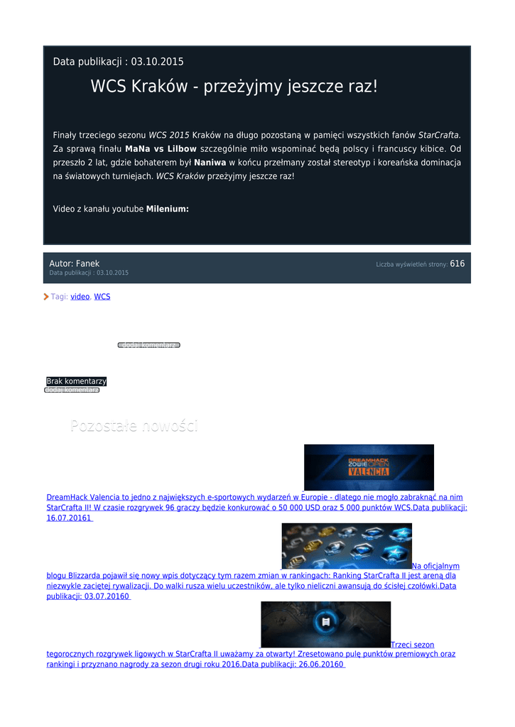 Data publikacji : 03.10.2015 WCS Kraków - przeżyjmy jeszcze raz! Finały trzeciego sezonu WCS 2015 Kraków na długo pozostaną w pamięci wszystkich fanów StarCrafta. Za sprawą finału MaNa vs Lilbow szczególnie miło wspominać będą polscy i francuscy kibice. Od przeszło 2 lat, gdzie bohaterem był Naniwa w końcu przełmany został stereotyp i koreańska dominacja na światowych turniejach. WCS Kraków przeżyjmy jeszcze raz! Video z kanału youtube Milenium: Autor: Fanek Liczba wyświetleń strony: 616 Data publikacji : 03.10.2015 Tagi: video, WCS Komentarz (0) dodaj komentarz Brak komentarzy dodaj komentarz Pozostałe nowości DreamHack Open: Valencia 2016 - Nerchio w półfinale - live! DreamHack Valencia to jedno z największych e-sportowych wydarzeń w Europie - dlatego nie mogło zabraknąć na nim StarCrafta II! W czasie rozgrywek 96 graczy będzie konkurować o 50 000 USD oraz 5 000 punktów WCS.Data publikacji: 16.07.20161 Aktualizacja 3.4 – Duże zmiany w rankingu StarCrafta II Na oficjalnym blogu Blizzarda pojawił się nowy wpis dotyczący tym razem zmian w rankingach: Ranking StarCrafta II jest areną dla niezwykle zaciętej rywalizacji. Do walki rusza wielu uczestników, ale tylko nieliczni awansują do ścisłej czołówki.Data publikacji: 03.07.20160 Rozpoczęcie trzeciego sezonu rankingowego 2016 Trzeci sezon tegorocznych rozgrywek ligowych w StarCrafta II uważamy za otwarty! Zresetowano pulę punktów premiowych oraz rankingi i przyznano nagrody za sezon drugi roku 2016.Data publikacji: 26.06.20160 Filmowy „Warcraft” już wkrótce w księgarniach! Powieść „Warcraft”, której wydanie zbiega się z polską premierą filmu „Warcraft. Początek” w reżyserii Duncana Jonesa, do księgarń trafi już 15 czerwca. Na kartach książki czytelnicy wkroczą w nowy wymiar emocji towarzyszących bohaterom fikcyjnych światów Azeroth i Draenor. Za sprawą Christie Golden, pisarki od lat cenionej przez fanów świata Warcraft, konflikt ludzi i orków nabierze jeszcze większej intensywności.Data publikacji: 13.06.20160 Blokada obecnego sezonu i darmowa zmiana nazwy postaci Jak czytamy na oficjalnym blogu Blizzarda: Obecny sezon rankingowy zbliża się ku końcowi i wkrótce zamknięte zostaną wszystkie ligi i dywizje. Kilka dni przed rozpoczęciem nowego sezonu, darmowa zmiana nazwy postaci w StarCraft II zostanie ponownie dodana do wszystkich kont, dla których funkcja ta nie jest obecnie dostępna.Data publikacji: 12.06.20160 Wszystkie nowości