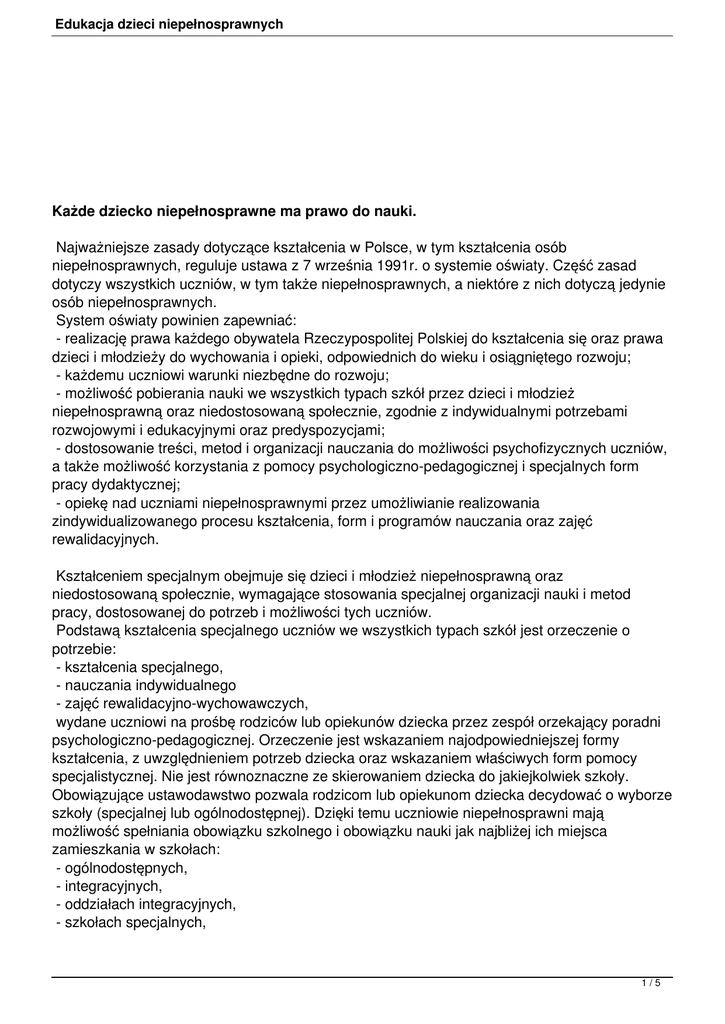 Edukacja dzieci niepełnosprawnych Każde dziecko niepełnosprawne ma prawo do nauki. Najważniejsze zasady dotyczące kształcenia w Polsce, w tym kształcenia osób niepełnosprawnych, reguluje ustawa z 7 września 1991r. o systemie oświaty. Część zasad dotyczy wszystkich uczniów, w tym także niepełnosprawnych, a niektóre z nich dotyczą jedynie osób niepełnosprawnych. System oświaty powinien zapewniać: - realizację prawa każdego obywatela Rzeczypospolitej Polskiej do kształcenia się oraz prawa dzieci i młodzieży do wychowania i opieki, odpowiednich do wieku i osiągniętego rozwoju; - każdemu uczniowi warunki niezbędne do rozwoju; - możliwość pobierania nauki we wszystkich typach szkół przez dzieci i młodzież niepełnosprawną oraz niedostosowaną społecznie, zgodnie z indywidualnymi potrzebami rozwojowymi i edukacyjnymi oraz predyspozycjami; - dostosowanie treści, metod i organizacji nauczania do możliwości psychofizycznych uczniów, a także możliwość korzystania z pomocy psychologiczno-pedagogicznej i specjalnych form pracy dydaktycznej; - opiekę nad uczniami niepełnosprawnymi przez umożliwianie realizowania zindywidualizowanego procesu kształcenia, form i programów nauczania oraz zajęć rewalidacyjnych. Kształceniem specjalnym obejmuje się dzieci i młodzież niepełnosprawną oraz niedostosowaną społecznie, wymagające stosowania specjalnej organizacji nauki i metod pracy, dostosowanej do potrzeb i możliwości tych uczniów. Podstawą kształcenia specjalnego uczniów we wszystkich typach szkół jest orzeczenie o potrzebie: - kształcenia specjalnego, - nauczania indywidualnego - zajęć rewalidacyjno-wychowawczych, wydane uczniowi na prośbę rodziców lub opiekunów dziecka przez zespół orzekający poradni psychologiczno-pedagogicznej. Orzeczenie jest wskazaniem najodpowiedniejszej formy kształcenia, z uwzględnieniem potrzeb dziecka oraz wskazaniem właściwych form pomocy specjalistycznej. Nie jest równoznaczne ze skierowaniem dziecka do jakiejkolwiek szkoły. Obowiązujące ustawodawstwo pozwala rodzicom lub opiekunom dziecka decydować o wyborze szkoły (specjalnej lub ogólnodostępnej). Dzięki temu uczniowie niepełnosprawni mają możliwość spełniania obowiązku szkolnego i obowiązku nauki jak najbliżej ich miejsca zamieszkania w szkołach: - ogólnodostępnych, - integracyjnych, - oddziałach integracyjnych, - szkołach specjalnych, 1/5 Edukacja dzieci niepełnosprawnych - oddziałach specjalnych, - specjalnych ośrodkach szkolno-wychowawczych. Natomiast dzieciom i młodzieży, których stan zdrowia uniemożliwia lub znacznie utrudnia uczęszczanie do szkoły zapewnia się nauczanie indywidualne. Uczniom niepełnosprawnym stworzono możliwość wydłużenia obowiązku szkolnego, jednakże nie dłużej niż do ukończenia przez nich 18 lat na poziomie szkoły podstawowej, do 21 roku życia na poziomie gimnazjum i do 24 lat na poziomie szkoły ponadgimnazjalnej. Rozpoczęcie spełniania obowiązku szkolnego przez dzieci niepełnosprawne może zostać odroczone do końca roku szkolnego w tym roku kalendarzowym, w którym dziecko kończy 10 lat. Dla uczniów niepełnosprawnych można przedłużyć okres nauki na każdym etapie edukacyjnym co najmniej o jeden rok, zwiększając proporcjonalnie liczbę godzin zajęć edukacyjnych. Uczeń niepełnosprawny ma prawo do korzystania z bezpłatnego transportu oraz opieki w czasie przewozu do najbliższej szkoły podstawowej i gimnazjum, a uczniowie z niepełnosprawnością ruchową, upośledzeniem umysłowym w stopniu umiarkowanym lub znacznym - także do najbliższej szkoły ponadgimnazjalnej, nie dłużej jednak niż do ukończenia 21 roku życia. Uczniowie upośledzeni umysłowo w stopniu głębokim uczestniczący w zajęciach rewalidacyjno-wychowawczych oraz dzieci i młodzież z upośledzeniem umysłowym ze sprzężonymi niepełnosprawnościami mają prawo do korzystania z bezpłatnego transportu i opieki w czasie przewozu do ośrodka umożliwiającego tym dzieciom i młodzieży realizację obowiązku szkolnego i obowiązku nauki, nie dłużej jednak niż do ukończenia 25 roku życia. Jeśli gmina nie zapewnia transportu, jej obowiązkiem jest zwrot kosztów przejazdu ucznia oraz jego opiekuna do szkoły lub ośrodka, jeżeli dowożenie i opiekę zapewniają rodzice lub opiekunowie. Uczniowie niepełnosprawni są zobowiązani razem z innymi uczniami przystąpić do sprawdzianu w szkole podstawowej i egzaminu w gimnazjum. Z tego obowiązku zostali zwolnieni jedynie uczniowie z upośledzeniem w stopniu umiarkowanym i znacznym oraz z niepełnosprawnościami sprzężonymi. Dostosowanie sprawdzianu i egzaminów do specjalnych potrzeb edukacyjnych uczniów niepełnosprawnych polega między innymi na: - wprowadzeniu innych arkuszy dla różnych grup uczniów: niewidomi (pisane alfabetem brajlowskim), słabo widzący (pisane powiększonym drukiem), niesłyszący oraz uczniowie z upośledzeniem umysłowym w stopniu lekkim (test dostosowany do ich możliwości); - zaznaczeniu na arkuszu dysleksji stwierdzonej w opinii poradni psychologiczno-pedagogicznej; - pomocy ze strony zespołu nadzorującego; - wydłużeniu czasu zdawania egzaminu; - możliwości skorzystania ze sprzętu specjalizacyjnego; - możliwości korzystania z nieodzownych lekarstw i urządzeń medycznych; - udziale w komisjach egzaminacyjnych specjalistów kształcenia specjalnego. Pomoc materialna 2/5 Edukacja dzieci niepełnosprawnych W celu zmniejszenia różnic w dostępie do edukacji oraz umożliwienia pokonywania barier dostępu do edukacji wynikających z trudnej sytuacji materialnej ucznia udzielana jest uczniom pomoc materialna. Uczniowie niepełnosprawni mogą beneficjentami tej pomocy na równi z innymi uczniami. Świadczeniami pomocy materialnej są: stypendium szkolne - może być przyznane uczniowi, który znajduje się w trudnej sytuacji materialnej wynikającej z niskich dochodów w rodzinie. W ramac