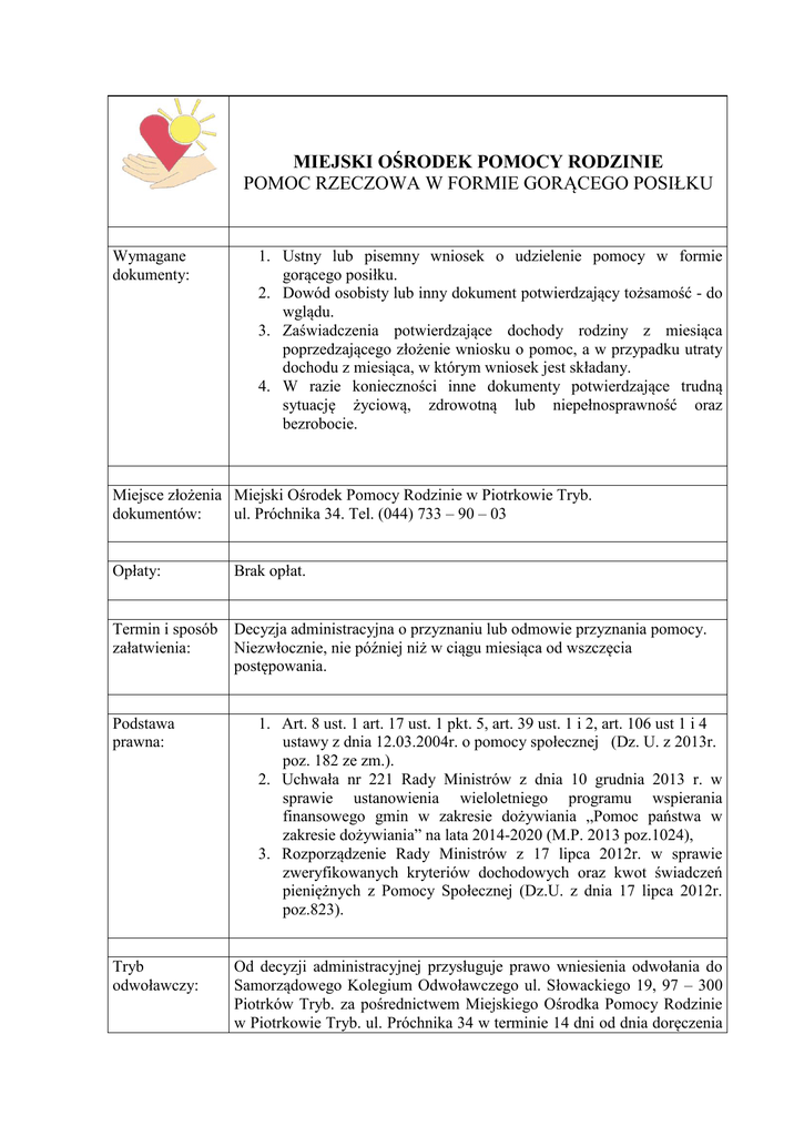 MIEJSKI OŚRODEK POMOCY RODZINIE POMOC RZECZOWA W FORMIE GORĄCEGO POSIŁKU Wymagane dokumenty: 1. Ustny lub pisemny wniosek o udzielenie pomocy w formie gorącego posiłku. 2. Dowód osobisty lub inny dokument potwierdzający tożsamość - do wglądu. 3. Zaświadczenia potwierdzające dochody rodziny z miesiąca poprzedzającego złożenie wniosku o pomoc, a w przypadku utraty dochodu z miesiąca, w którym wniosek jest składany. 4. W razie konieczności inne dokumenty potwierdzające trudną sytuację życiową, zdrowotną lub niepełnosprawność oraz bezrobocie. Miejsce złożenia Miejski Ośrodek Pomocy Rodzinie w Piotrkowie Tryb. dokumentów: ul. Próchnika 34. Tel. (044) 733 – 90 – 03 Opłaty: Brak opłat. Termin i sposób załatwienia: Decyzja administracyjna o przyznaniu lub odmowie przyznania pomocy. Niezwłocznie, nie później niż w ciągu miesiąca od wszczęcia postępowania. Podstawa prawna: Tryb odwoławczy: 1. Art. 8 ust. 1 art. 17 ust. 1 pkt. 5, art. 39 ust. 1 i 2, art. 106 ust 1 i 4 ustawy z dnia 12.03.2004r. o pomocy społecznej (Dz. U. z 2013r. poz. 182 ze zm.). 2. Uchwała nr 221 Rady Ministrów z dnia 10 grudnia 2013 r. w sprawie ustanowienia wieloletniego programu wspierania finansowego gmin w zakresie dożywiania „Pomoc państwa w zakresie dożywiania” na lata 2014-2020 (M.P. 2013 poz.1024), 3. Rozporządzenie Rady Ministrów z 17 lipca 2012r. w sprawie zweryfikowanych kryteriów dochodowych oraz kwot świadczeń pieniężnych z Pomocy Społecznej (Dz.U. z dnia 17 lipca 2012r. poz.823). Od decyzji administracyjnej przysługuje prawo wniesienia odwołania do Samorządowego Kolegium Odwoławczego ul. Słowackiego 19, 97 – 300 Piotrków Tryb. za pośrednictwem Miejskiego Ośrodka Pomocy Rodzinie w Piotrkowie Tryb. ul. Próchnika 34 w terminie 14 dni od dnia doręczenia decyzji. Uwagi: Pomoc w postaci gorącego posiłku może być przyznana bezpłatnie, jeżeli dochód osoby samotnie gospodarującej lub dochód na osobę w rodzinie nie przekracza 150 % kryterium dochodowego, o którym mowa w art. 8 ust. 1 ustawy o pomocy społecznej. Kryterium dochodowe osoby samotnie gospodarującej wynosi 542 zł, a kryterium dochodowe na osobę w rodzinie wynosi 456 zł. Osoba lub rodzina ma prawo do schronienia, posiłku i niezbędnego ubrania, jeżeli jest tego pozbawiona. Pomoc doraźna lub okresowa w postaci jednego gorącego posiłku dziennie przysługuje osobie, która własnym staraniem nie może go sobie zapewnić. Decyzję administracyjną o przyznaniu lub odmowie przyznania świadczenia, wydaje się po przeprowadzeniu rodzinnego wywiadu środowiskowego.