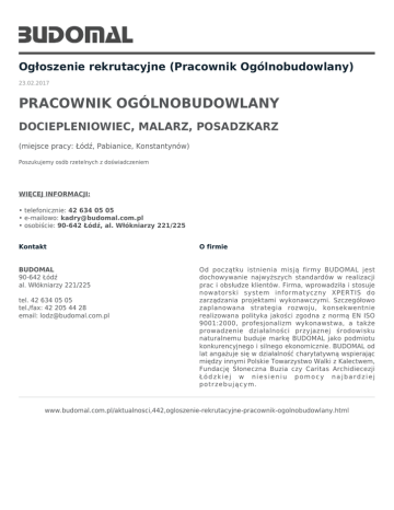 Ogłoszenie rekrutacyjne (Pracownik Ogólnobudowlany) 23.02.2017 PRACOWNIK OGÓLNOBUDOWLANY DOCIEPLENIOWIEC, MALARZ, POSADZKARZ (miejsce pracy: Łódź, Pabianice, Konstantynów) Poszukujemy osób rzetelnych z doświadczeniem WIĘCEJ INFORMACJI: • telefonicznie: 42 634 05 05 • e-mailowo: [email protected] • osobiście: 90-642 Łódź, al. Włókniarzy 221/225 Kontakt O firmie BUDOMAL 90-642 Łódź al. Włókniarzy 221/225 Od początku istnienia misją firmy BUDOMAL jest dochowywanie najwyższych standardów w realizacji prac i obsłudze klientów. Firma, wprowadziła i stosuje nowatorski system informatyczny XPERTIS do zarządzania projektami wykonawczymi. Szczegółowo zaplanowana strategia rozwoju, konsekwentnie realizowana polityka jakości zgodna z normą EN ISO 9001:2000, profesjonalizm wykonawstwa, a także prowadzenie działalności przyjaznej środowisku naturalnemu buduje markę BUDOMAL jako podmiotu konkurencyjnego i silnego ekonomicznie. BUDOMAL od lat angażuje się w działalność charytatywną wspierając między innymi Polskie Towarzystwo Walki z Kalectwem, Fundację Słoneczna Buzia czy Caritas Archidiecezji Łódzkiej w niesieniu pomocy najbardziej potrzebującym. tel. 42 634 05 05 tel./fax: 42 205 44 28 email: [email protected] www.budomal.com.pl/aktualnosci,442,ogloszenie-rekrutacyjne-pracownik-ogolnobudowlany.html