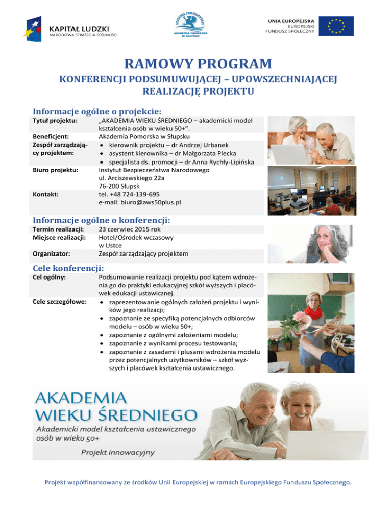 RAMOWY PROGRAM KONFERENCJI PODSUMUWUJĄCEJ – UPOWSZECHNIAJĄCEJ REALIZACJĘ PROJEKTU Informacje ogólne o projekcie: Tytuł projektu: Beneficjent: Zespół zarządzający projektem: Biuro projektu: Kontakt: „AKADEMIA WIEKU ŚREDNIEGO – akademicki model kształcenia osób w wieku 50+”. Akademia Pomorska w Słupsku • kierownik projektu – dr Andrzej Urbanek • asystent kierownika – dr Małgorzata Plecka • specjalista ds. promocji – dr Anna Rychły-Lipińska Instytut Bezpieczeństwa Narodowego ul. Arciszewskiego 22a 76-200 Słupsk tel. +48 724-139-695 e-mail: [email protected] Informacje ogólne o konferencji: Termin realizacji: Miejsce realizacji: Organizator: 23 czerwiec 2015 rok Hotel/Ośrodek wczasowy w Ustce Zespół zarządzający projektem Cele konferencji: Cel ogólny: Cele szczegółowe: Podsumowanie realizacji projektu pod kątem wdrożenia go do praktyki edukacyjnej szkół wyższych i placówek edukacji ustawicznej. • zaprezentowanie ogólnych założeń projektu i wyników jego realizacji; • zapoznanie ze specyfiką potencjalnych odbiorców modelu – osób w wieku 50+; • zapoznanie z ogólnymi założeniami modelu; • zapoznanie z wynikami procesu testowania; • zapoznanie z zasadami i plusami wdrożenia modelu przez potencjalnych użytkowników – szkół wyższych i placówek kształcenia ustawicznego. Projekt współfinansowany ze środków Unii Europejskiej w ramach Europejskiego Funduszu Społecznego. Czas realizacji Punkt programu Osoba odpowiedzialna I. OTWARCIE KONFERENCJI 10.00-10.15 Rejestracja uczestników dr Małgorzata Plecka – asystent kierownika projektu 10.15-10.20 Przywitanie uczestników dr Andrzej Urbanek – kierownik projektu 10.20-10.25 Zapoznanie z celami i planem obrad 10.25-10.30 Uroczyste otwarcie konferencji prof. dr hab. Roman Drozd – rektor Akademii Pomorskiej 10.30-10.45 Wręczenie dyplomów i pamiątek osobom zaangażowa- prof. dr hab. Roman Drozd, nym w realizację projektu dr Andrzej Urbanek II. OBRADY PLENARNE Sesja pierwsza 10.45-11.15 Ogólne założenia i stan realizacji projektu dr Małgorzata Plecka – asystent kierownika projektu 11.15-11.30 Ogólne założenia akademickiego modelu kształcenia dr Andrzej Urbanek – kierownik ustawicznego osób w wieku 50+ projektu 11.30-12.00 Akademicki model kształcenia ustawicznego w świetle dr Robert Parol – przewodnicząbadań ewaluacyjnych cy zespołu ds. ewaluacji 12.00-12.30 Przerwa kawowa Sesja druga 12.30-13.00 Dorośli 50+ – charakterystyka rozwojowa potencjalnych dr Andrzej Urbanek – kierownik odbiorców projektu projektu 13.00-13.30 Dorośli 50+ w świetle badań diagnostycznych – meryto- dr Robert Parol – przewodnicząryczne uzasadnienie realizacji projektu cy zespołu diagnostycznego 13.30-14.00 Nauczyciel dorosłych – uwagi i wnioski z etapu diagnozo- mgr Ewa Olszówka – ekspert wania i testowania projektu w zakresie edukacji dorosłych 14.00-15.00 Obiad III. DYSKUSJA 15.00-15.15 Możliwości zaimplementowania modelu przez uczelnie dr Andrzej Urbanek – kierownik wyższe i placówki kształcenia ustawicznego – wprowa- projektu dzenie do dyskusji 15.15-15.45 Dyskusja panelowa nt. możliwości zaimplementowania dr Robert Parol - moderator modelu przez uczelnie wyższe i placówki kształcenia ustawicznego 15.45-16.30 Wolne wnioski i dyskusja ogólna dr Andrzej Urbanek - moderator IV. ZAKOŃCZENIE KONFERENCJI 16.30-17.00 Podsumowanie konferencji dr Andrzej Urbanek – kierownik projektu 17.00-17.15 Uroczyste zakończenie konferencji mgr inż. Ewa Sobolewska – kanclerz Akademii Pomorskiej Projekt współfinansowany ze środków Unii Europejskiej w ramach Europejskiego Funduszu Społecznego.