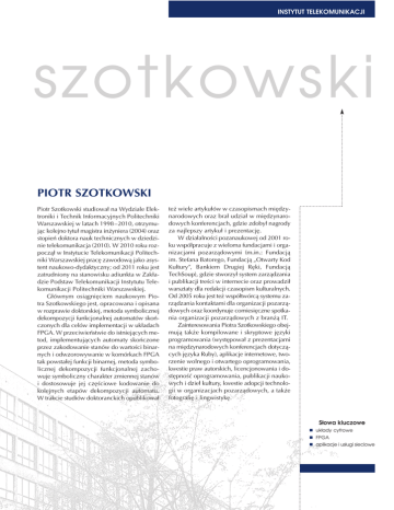 INSTYTUT TELEKOMUNIKACJI szotkowski PIOTR SZOTKOWSKI Piotr Szotkowski studiował na Wydziale Elektroniki i Technik Informacyjnych Politechniki Warszawskiej w latach 1998 –2010, otrzymując kolejno tytuł magistra inżyniera (2004) oraz stopień doktora nauk technicznych w dziedzinie telekomunikacja (2010). W 2010 roku rozpoczął w Instytucie Telekomunikacji Politechniki Warszawskiej pracę zawodową jako asystent naukowo-dydaktyczny; od 2011 roku jest zatrudniony na stanowisku adiunkta w Zakładzie Podstaw Telekomunikacji Instytutu Telekomunikacji Politechniki Warszawskiej. Głównym osiągnięciem naukowym Piotra Szotkowskiego jest, opracowana i opisana w rozprawie doktorskiej, metoda symbolicznej dekompozycji funkcjonalnej automatów skończonych dla celów implementacji w układach FPGA. W przeciwieństwie do istniejących metod, implementujących automaty skończone przez zakodowanie stanów do wartości binarnych i odwzorowywanie w komórkach FPGA tak powstałej funkcji binarnej, metoda symbolicznej dekompozycji funkcjonalnej zachowuje symboliczny charakter zmiennej stanów i dostosowuje jej częściowe kodowanie do kolejnych etapów dekompozycji automatu. W trakcie studiów doktoranckich opublikował też wiele artykułów w czasopismach międzynarodowych oraz brał udział w międzynarodowych konferencjach, gdzie zdobył nagrody za najlepszy artykuł i prezentację. W działalności pozanaukowej od 2001 roku współpracuje z wieloma fundacjami i organizacjami pozarządowymi (m.in.: Fundacją im. Stefana Batorego, Fundacją „Otwarty Kod Kultury”, Bankiem Drugiej Ręki, Fundacją TechSoup), gdzie stworzył system zarządzania i publikacji treści w internecie oraz prowadził warsztaty dla redakcji czasopism kulturalnych. Od 2005 roku jest też współtwórcą systemu zarządzania kontaktami dla organizacji pozarządowych oraz koordynuje comiesięczne spotkania organizacji pozarządowych z branżą IT. Zainteresowania Piotra Szotkowskiego obejmują także kompilowane i skryptowe języki programowania (występował z prezentacjami na międzynarodowych konferencjach dotyczących języka Ruby), aplikacje internetowe, tworzenie wolnego i otwartego oprogramowania, kwestie praw autorskich, licencjonowania i dostępność oprogramowania, publikacji naukowych i dzieł kultury, kwestie adopcji technologii w organizacjach pozarządowych, a także fotografię i lingwistykę. Słowa kluczowe n układy cyfrowe n FPGA n aplikacje i usługi sieciowe