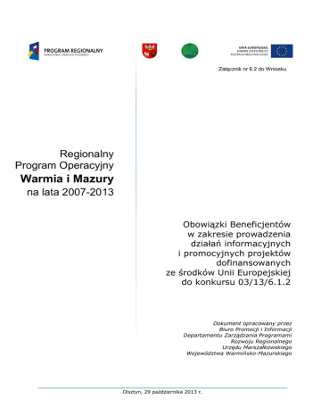 Załącznik nr 6.2 do Wniosku Regionalny Program Operacyjny Warmia i Mazury na lata 2007-2013 Obowiązki Beneficjentów w zakresie prowadzenia działań informacyjnych i promocyjnych projektów dofinansowanych ze środków Unii Europejskiej do konkursu 03/13/6.1.2 Dokument opracowany przez Biuro Promocji i Informacji Departamentu Zarządzania Programami Rozwoju Regionalnego Urzędu Marszałkowskiego Województwa Warmińsko-Mazurskiego Olsztyn, 29 października 2013 r. Obowiązki Beneficjentów w zakresie prowadzenia działań informacyjnych i promocyjnych projektów dofinansowanych ze środków Unii Europejskiej Spis treści Spis treści ................................................................................... 2 1. Jak zaplanować działania informacyjne i promocyjne na etapie przygotowywania wniosku? ........................................ 3 2. W jaki sposób w praktyce promować i informować o projekcie? ........................................................................... 5 3. Wytyczne w sprawie obowiązkowych działań informacyjnych i promocyjnych .................................................................... 11 3.1. Tablica informacyjna ......................................................................................................11 3.2. Tablica pamiątkowa ........................................................................................................13 3.3. Plakietka informacyjna....................................................................................................16 3.4. Serwis internetowy.........................................................................................................17 3.5. Spotkania informacyjne ..................................................................................................18 3.6. Publikacje i narzędzia komunikacji wizualnej i audiowizualnej ..............................................19 3.7. Zestawienia znaków graficznych/logotypów .......................................................................20 4. Stosowanie tablic informacyjnych, pamiątkowych oraz plakietek informacyjnych .................................................... 22 5. Założenia końcowe .............................................................. 23 6. Dobre i złe praktyki, przykłady ............................................ 24 2 Obowiązki Beneficjentów w zakresie prowadzenia działań informacyjnych i promocyjnych projektów dofinansowanych ze środków Unii Europejskiej 1. Jak zaplanować działania informacyjne i promocyjne na etapie przygotowywania wniosku? Podstawy prawne określające zakres działań informacyjnych i promocyjnych Podstawowe założenia związane z prowadzeniem działań informacyjnych i promocyjnych określono w artykułach 60 oraz 69 Rozporządzenia Rady (WE) nr 1083/2006 z dnia 11 lipca 2006 roku ustanawiającego przepisy ogólne dotyczące Europejskiego Funduszu Rozwoju Regionalnego, Europejskiego Funduszu Społecznego oraz Funduszu Spójności i uchylającego rozporządzenie (WE) nr 1260/1999 (Dz. U. UE L Nr 210, str. 25 z późn. zm.). Artykuł 60 lit. j nakłada obowiązki w zakresie informacji i promocji na Instytucję Zarządzającą (IZ), natomiast Artykuł 69 określa podstawowe założenia prowadzenia działań informacyjnych i promocyjnych dla wnioskodawców Funduszy Europejskich. Obowiązki Beneficjentów w zakresie działań informacyjnych i promocyjnych skierowanych do opinii publicznej wynikają z artykułów 8-9 Rozporządzenia Komisji (WE) nr 1828/2006 z dnia 8 grudnia 2006 r. oraz Rozporządzenia Komisji (WE) nr 846/2009 z dnia 1 września 2009 r., jak również obowiązków informacyjnych i promocyjnych stosowanych przez Państwa Członkowskie, wynikających z faktu dofinansowania projektów ze środków funduszy strukturalnych (Europejski Fundusz Rozwoju Regionalnego, Europejski Fundusz Społeczny) bądź z Funduszu Spójności. W myśl tych przepisów Beneficjenci są odpowiedzialni za informowanie opinii publicznej o pomocy otrzymanej z Funduszy Europejskich poprzez wykorzystanie określonych narzędzi i kanałów informacyjno-promocyjnych. Zgodnie z oficjalnym stanowiskiem Komisji Europejskiej z dnia 3 marca 2010 r. w sprawie kwalifikowalnych kosztów inwestycyjnych w rozumieniu Rozporządzenia Komisji (WE) nr 800/2008 z dnia 6 sierpnia 2008 r. uznającego niektóre rodzaje pomocy za zgodne ze wspólny rynkiem w zastosowaniu art. 87 i 88 Traktatu /ogólne rozporządzenie w sprawie wyłączeń blokowych/ (Dz. Urz. UE L 214 z 9.8.2008) oraz Wytycznych w sprawie krajowej pomocy regionalnej na lata 2007-2013 (Dz. Urz. EU C 54 z 4.3.2006), wydatki poniesione m.in. na informację i promocję w projektach objętych pomocą publiczną są niekwalifikowalne. Od dnia 13 maja 2010 r. koszty promocji projektu zaplanowane we wniosku o dofinansowanie nie mogą przekroczyć 2% wartości projektu brutto, z zastrzeżeniem, że ta kwota nie może być wyższa niż 100 000 złotych brutto. Ponadto w ramach przewidzianych na promocję kosztów obowiązuje zasada, iż koszt gadżetów promocyjnych i organizacji konferencji nie może przekroczyć 10% (oddzielnie na każdą z wymienionych kategorii wydatków) całości środków zarezerwowanych na promocję danego projektu. Ogólne zasady prowadzenia działań informacyjnych i promocyjnych Beneficjent zobowiązuje się do przestrzegania zasad dotyczących informacji i promocji w momencie podpisania umowy o dofinansowanie projektu lub podjęcia uchwały o dofinansowaniu projektu. Beneficjent zobowiązuje się do: – informowania społeczeństwa o dofinansowaniu realizacji projektu przez Unię Europejską zgodnie z wymogami rozporządzenia Komisji nr 1828/2006 oraz wytycznymi i zaleceniami Instytucji Zarządzającej Regionalnym Programem Operacyjnym Warmia i Mazury na lata 2007-2013, – wypełniania obowiązków informacji i promocji w zakresie określonym we wniosku o dofinansowanie, 3 Obowiązki Beneficjentów w zak