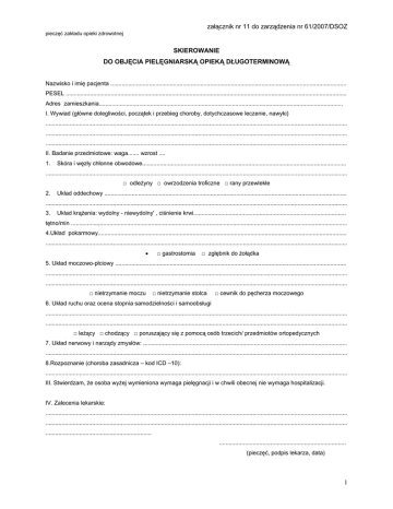 załącznik nr 11 do zarządzenia nr 61/2007/DSOZ pieczęć zakładu opieki zdrowotnej SKIEROWANIE DO OBJĘCIA PIELĘGNIARSKĄ OPIEKĄ DŁUGOTERMINOWĄ Nazwisko i imię pacjenta ................................................................................................................................................... PESEL ............................................................................................................................................................................... Adres zamieszkania........................................................................................................................................................ I. Wywiad (główne dolegliwości, początek i przebieg choroby, dotychczasowe leczenie, nawyki) ............................................................................................................................................................................................ ............................................................................................................................................................................................ ............................................................................................................................................................................................ II. Badanie przedmiotowe: waga....... wzrost .... 1. Skóra i węzły chłonne obwodowe............................................................................................................................... ............................................................................................................................................................................................ □ odleżyny □ owrzodzenia troficzne □ rany przewlekłe 2. Układ oddechowy ....................................................................................................................................................... ............................................................................................................................................................................................ 3. Układ krążenia: wydolny - niewydolny' , ciśnienie krwi............................................................................................... tętno/min .................,.......................................................................................................................................................... 4.Układ pokarmowy........................................................................................................................................................... ............................................................................................................................................................................................ • □ gastrostomia □ zgłębnik do żołądka 5. Układ moczowo-płciowy ................................................................................................................................................ ............................................................................................................................................................................................ ............................................................................................................................................................................................ □ nietrzymanie moczu □ nietrzymanie stolca □ cewnik do pęcherza moczowego 6. Układ ruchu oraz ocena stopnia samodzielności i samoobsługi ............................................................................................................................................................................................ ............................................................................................................................................................................................ □ leżący □ chodzący □ poruszający się z pomocą osób trzecich/ przedmiotów ortopedycznych 7. Układ nerwowy i narządy zmysłów: ............................................................................................................................... ............................................................................................................................................................................................ 8.Rozpoznanie (choroba zasadnicza – kod ICD –10): ............................................................................................................................................................................................ III. Stwierdzam, że osoba wyżej wymieniona wymaga pielęgnacji i w chwili obecnej nie wymaga hospitalizacji. IV. Zalecenia lekarskie: ............................................................................................................................................................................................ ............................................................................................................................................................................................ .................................................................. ............................................................................... (pieczęć, podpis lekarza, data) 1
