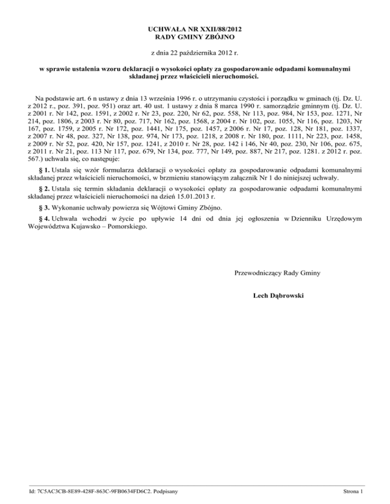 UCHWAŁA NR XXII/88/2012 RADY GMINY ZBÓJNO z dnia 22 października 2012 r. w sprawie ustalenia wzoru deklaracji o wysokości opłaty za gospodarowanie odpadami komunalnymi składanej przez właścicieli nieruchomości. Na podstawie art. 6 n ustawy z dnia 13 września 1996 r. o utrzymaniu czystości i porządku w gminach (tj. Dz. U. z 2012 r., poz. 391, poz. 951) oraz art. 40 ust. 1 ustawy z dnia 8 marca 1990 r. samorządzie gminnym (tj. Dz. U. z 2001 r. Nr 142, poz. 1591, z 2002 r. Nr 23, poz. 220, Nr 62, poz. 558, Nr 113, poz. 984, Nr 153, poz. 1271, Nr 214, poz. 1806, z 2003 r. Nr 80, poz. 717, Nr 162, poz. 1568, z 2004 r. Nr 102, poz. 1055, Nr 116, poz. 1203, Nr 167, poz. 1759, z 2005 r. Nr 172, poz. 1441, Nr 175, poz. 1457, z 2006 r. Nr 17, poz. 128, Nr 181, poz. 1337, z 2007 r. Nr 48, poz. 327, Nr 138, poz. 974, Nr 173, poz. 1218, z 2008 r. Nr 180, poz. 1111, Nr 223, poz. 1458, z 2009 r. Nr 52, poz. 420, Nr 157, poz. 1241, z 2010 r. Nr 28, poz. 142 i 146, Nr 40, poz. 230, Nr 106, poz. 675, z 2011 r. Nr 21, poz. 113 Nr 117, poz. 679, Nr 134, poz. 777, Nr 149, poz. 887, Nr 217, poz. 1281. z 2012 r. poz. 567.) uchwala się, co następuje: § 1. Ustala się wzór formularza deklaracji o wysokości opłaty za gospodarowanie odpadami komunalnymi składanej przez właścicieli nieruchomości, w brzmieniu stanowiącym załącznik Nr 1 do niniejszej uchwały. § 2. Ustala się termin składania deklaracji o wysokości opłaty za gospodarowanie odpadami komunalnymi składanej przez właścicieli nieruchomości na dzień 15.01.2013 r. § 3. Wykonanie uchwały powierza się Wójtowi Gminy Zbójno. § 4. Uchwała wchodzi w życie po upływie 14 dni od dnia jej ogłoszenia w Dzienniku Urzędowym Województwa Kujawsko – Pomorskiego. Przewodniczący Rady Gminy Lech Dąbrowski ————————————————————————————————————————————————————————— Id: 7C5AC3CB-8E89-428F-863C-9FB0634FD6C2. Podpisany Strona 1 Załącznik Nr 1 Do Uchwały Nr XXII/88/2012 Rady Gminy Zbójno Pola jasne wypełnia właściciel nieruchomości, należy wypełnić drukowanymi literami, kolorem czarnym lub granatowym DEKLARACJA O WYSOKOŚCI OPŁATY ZA GOSPODAROWANIE ODPADAMI KOMUNALNYMI SKŁADANA PRZEZ WŁAŚCICIELI NIERUCHOMOŚCI POŁOŻONYCH NA OBSZARZE GMINY ZBÓJNO Ustawa z dnia 13 września 1996r. o utrzymaniu czystości i porządku w gminach (tj. Dz. U. z 2012 r., poz. 391) Podstawa prawna: Formularz przeznaczony jest dla właścicieli nieruchomości zamieszkałych, na których powstają odpady komunalne, położonych na terenie Gminy Zbójno Składający: Miejsce składania deklaracji: Nazwa i adres siedziby organu właściwego do złożenia deklaracji: Urząd Gminy Zbójno, Zbójno 35 A, 87 – 645 Zbójno lub pocztą na wskazany wyżej adres Wójt Gminy Zbójno Urząd Gminy Zbójno Zbójno 35 A 87 – 645 Zbójno A. OBOWIĄZEK ZŁOŻENIA DEKLARACJI (proszę zaznaczyć właściwy kwadrat) pierwsza deklaracja zmiana danych zawartych w pierwszej deklaracji data zmiany (____-____-______) B. SKŁADAJĄCY DEKLARACJĘ (proszę zaznaczyć właściwy kwadrat) właściciel, użytkownik wieczysty, posiadacz współwłaściciel, współposiadacz jednostka organizacyjna lub osoba posiadająca nieruchomość w zarządzie inny podmiot władający nieruchomością C. DANE SKŁADAJĄCEGO DEKLARACJĘ Rodzaj składającego (proszę zaznaczyć właściwy kwadrat) osoba fizyczna Imię i nazwisko osoba prawna (dotyczy osób fizycznych) / nieposiadających osobowości prawnej) Pełna nazwa jednostka organizacyjna nieposiadająca osobowości prawnej (dotyczy osób prawnych oraz jednostek organizacyjnych 1. Pesel (dotyczy osób fizycznych) / NIP (dotyczy osób prawnych oraz jednostek organizacyjnych nieposiadających osobowości prawnej) 2. ————————————————————————————————————————————————————————— Id: 7C5AC3CB-8E89-428F-863C-9FB0634FD6C2. Podpisany Strona 2 Adres zamieszkania / Adres siedziby Kraj Województwo Powiat 3. 4. 5. Gmina Ulica nr domu / nr lokalu 6. 7. 8. Miejscowość Kod pocztowy Nr telefonu 9. 10. 11. D. ADRES NIERUCHOMOŚCI NA KTOREJ POWSTAJĄ ODPADY KOMUNALNE Gmina Ulica nr domu / nr lokalu / nr działki (w przypadku nie nadania nr domu) 12. 13. 14. Miejscowość Kod pocztowy Nr telefonu 15. 16. 17. Dotyczy właścicieli nieruchomości na której zamieszkują mieszkańcy Oświadczam, że na terenie nieruchomości wskazanej w części D 18. niniejszej deklaracji zamieszkuje: (należy podać liczbę mieszkańców) Imię i nazwisko osób zamieszkujących na terenie nieruchomości wskazanej w części D (w przypadku większej liczby mieszkańców, dane należy zamieścić w odrębnym załączniku). Pole nie dotyczy budynków wielomieszkaniowych. 1…………………………………………………………………………………………………… 2…………………………………………………………………………………………………… 3………………………………..………………………………………………………………… 4…………………………………………………………………………………………………… 5…………………………………………………………………………………………………… 6…………………………………………………………………………………………………… 7........................................................................................................ 8........................................................................................................ 9........................................................................................................ 10..............................................................................