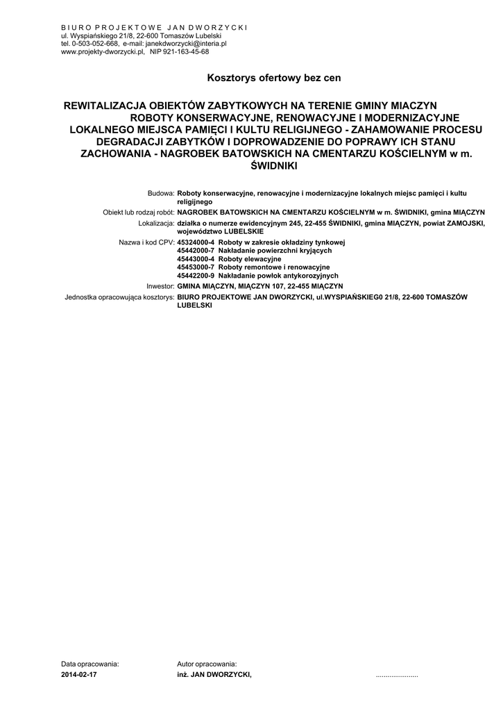 BIURO PROJEKTOWE JAN DWORZYCKI ul. Wyspiańskiego 21/8, 22-600 Tomaszów Lubelski tel. 0-503-052-668, e-mail: [email protected] www.projekty-dworzycki.pl, NIP 921-163-45-68 Kosztorys ofertowy bez cen REWITALIZACJA OBIEKTÓW ZABYTKOWYCH NA TERENIE GMINY MIACZYN ROBOTY KONSERWACYJNE, RENOWACYJNE I MODERNIZACYJNE LOKALNEGO MIEJSCA PAMIĘCI I KULTU RELIGIJNEGO - ZAHAMOWANIE PROCESU DEGRADACJI ZABYTKÓW I DOPROWADZENIE DO POPRAWY ICH STANU ZACHOWANIA - NAGROBEK BATOWSKICH NA CMENTARZU KOŚCIELNYM w m. ŚWIDNIKI Budowa: Roboty konserwacyjne, renowacyjne i modernizacyjne lokalnych miejsc pamięci i kultu religijnego Obiekt lub rodzaj robót: NAGROBEK BATOWSKICH NA CMENTARZU KOŚCIELNYM w m. ŚWIDNIKI, gmina MIĄCZYN Lokalizacja: działka o numerze ewidencyjnym 245, 22-455 ŚWIDNIKI, gmina MIĄCZYN, powiat ZAMOJSKI, województwo LUBELSKIE Nazwa i kod CPV: 45324000-4 45442000-7 45443000-4 45453000-7 45442200-9 Roboty w zakresie okładziny tynkowej Nakładanie powierzchni kryjących Roboty elewacyjne Roboty remontowe i renowacyjne Nakładanie powłok antykorozyjnych Inwestor: GMINA MIĄCZYN, MIĄCZYN 107, 22-455 MIĄCZYN Jednostka opracowująca kosztorys: BIURO PROJEKTOWE JAN DWORZYCKI, ul.WYSPIAŃSKIEG0 21/8, 22-600 TOMASZÓW LUBELSKI Data opracowania: 2014-02-17 Autor opracowania: inż. JAN DWORZYCKI, ...................... 5-nagrobek batowskich_dz-245 ZUZIA11 (C) Datacomp 1994-2014 (lic. 0004FD53) strona nr: 2 Ogólna charakterystyka obiektów lub robót Przedmiotem inwestycji są roboty konserwacyjne, renowacyjne i modernizacyjne lokalnych miejsc pamięci i kultu religijnego. Zakres inwestycji obejmuje remont nagrobku batowskich na cmentarzu kościelnym w m. Świdniki: Zakres robót: Obiekt należy w całości odczyścić ręcznie z zachowaniem szczególnej ostrożności i staranności z wtórnych powłok malarskich, brudu, mchów i porostów oraz z zanieczyszczeń związanych z opadami oraz z odchodów ptactwa. Prace należy prowadzić z wykorzystaniem drobnoziarnistego papieru ściernego oraz mosiężnych szczotek drucianych. Należy zachować szczególną ostrożność podczas oczyszczania wszelkich elementów zdobniczych takich jak herb, putta, kamienna tablica, głowica oraz kamienny krzyż tak, aby nie naruszyć ich kształtu i wykończenia. Wszelkie ubytki w tynkach, cegle i kamieniu należy oczyścić z luźnych elementów a następnie uzupełnić materiałem odpowiadającym ubytkowi. Piaskowiec należy zaimpregnować odpowiednim preparatem do konserwacji tego typu kamienia zgodnie z technologią producenta. Ubytki w tynkach należy wypełnić zaprawą renowacyjną zgodnie z technologią producenta. Należy uwidocznić napisy na kamiennej pamiątkowej tablicy. Następnie elementy należy pomalować farbami emulsyjnymi lub akrylowymi zewnętrznego stosowania w kolorze jasnoszarym, poprzez dwukrotne nałożenie warstwy malarskiej pędzlem lub wałkiem malarskim. Założenia wyjściowe do kosztorysowania Wycenę sporządzono na podstawie: 1. biuletynu cen robót remontowo-budowlanych - Sekocenbud, 2. biuletynu robót budowlanych inwestycyjnych - Sekocenbud, Poziom cen: IV kwartał 2013 rok. - ceny średnie Stawka robocizny: 11,67 zł/r-g. Narzuty: Koszty pośrednie - 64,60% do R i S, Zysk - 10,80% do R, S i Kp. REWITALIZACJA OBIEKTÓW ZABYTKOWYCH NA TERENIE GMINY MIACZYN ROBOTY KONSERWACYJNE, RENOWACYJ... 5-nagrobek batowskich_dz-245 ZUZIA11 (C) Datacomp 1994-2014 (lic. 0004FD53) strona nr: 3 Przedmiar robót <-NR-> <-PODST-> Nr Podstawa Kosztorys <-OPIS-> <-JEDN-> Opis robót Jm <-ILOSC-> Ilość REWITALIZACJA OBIEKTÓW ZABYTKOWYCH NA TERENIE GMINY MIACZYN ROBOTY KONSERWACYJNE, RENOWACYJNE I MODERNIZACYJNE LOKALNEGO MIEJSCA PAMIĘCI I KULTU RELIGIJNEGO - ZAHAMOWANIE PROCESU DEGRADACJI ZABYTKÓW I DOPROWADZENIE DO POPRAWY ICH STANU ZACHOWANIA - NAGROBEK BATOWSKICH NA CMENTARZU KOŚCIELNYM w m. ŚWIDNIKI 1 1 Element ROBOTY KONSERWACYJNE I RENOWACYJNE KNR 201/307/1 Roboty ziemne, ręczne odkopanie części podstawy, kategoria gruntu I-II Wyliczenie ilości robót: 1,0*1,0*0,3 0,300000 RAZEM: 0,300000 2 TZKNBK 4/201/ Pogłębienie (podbicie) istniejącej podstawy nagrobku, z cegły budowlanej 1 analogia Wyliczenie ilości robót: 0,3*0,5*0,5 0,075000 RAZEM: 0,075000 3 KNR 201/501/1 Ręczne zasypywanie wykopów, kategoria gruntu I-III Wyliczenie ilości robót: 0,300-0,075 0,225000 RAZEM: 0,225000 4 KNR 1323/501/1 Przecieranie starych tynków z usunieciem farby analogia Wyliczenie ilości robót: 1,4*0,3*4+1,15*0,25*4+0,9*0,7*4+0,55*1,15*4+0,75*0, 15*4+0,55*0,55+2,00 10,632500 RAZEM: 10,632500 5 KNR 23/2611/1 Przygotowanie podłoża, oczyszczenie mechaniczne i zmycie analogia 6 KNR 17/2608/2 Przygotowanie podłoża pod tynki renowacyjne i gładź renowacyjną, impregnacja środkiem analogia gruntującym 7 KNR 26/642/1 Uzupełnienie tynków - tynki renowacyjne wykonywane ręcznie analogia Wyliczenie ilości robót: 10,633*0,20 2,126600 RAZEM: 2,126600 8 KNR 401/1204/8 Przygotowanie powierzchni z poszpachlowaniem nierówności (sfalowań) powierzchni kamienia i analogia krzyża 9 Kalkulacja Konserwacja poprzez oczyszczenie i naprawę ubytków: herb, putta,głowica, krzyż indywidualna 10 ZKNR C 2/119/1 Malowanie elewacji farbą akrylową, dwukrotnie, tynk gładki (1) 11 Kalkulacja Konserwacja napisów na kamiennej pamiątkowej tablicy indywidualna 2 Element ROBOTY PORZĄDKOWE 12 KNR 221/101/4 Oczyszczenie terenu z resztek budowlanych gruzu i śmieci wywiezienie zanieczyszczeń samochodami do 1.0 m3 0,300 m3 0,075 m3 0,225 m2 10,633 m2 10,633 m2 10,633 m2 2,127 m2 10,633 kpl 1,000 m2 10,633 kpl 1,000 m3 0,500 REWITALIZACJA OBIEKTÓW ZABYTKOWYCH NA TERENIE GMINY MIACZYN ROBOTY KONSERWACYJNE, RENOWACYJ... 5-nagrobek batowskich_dz-245 ZUZIA11 (C) Datacomp 1994-2014 (lic. 0004FD53) strona nr: 4 Kosztorys inwestorski <-NR-> <-PODST-> Nr <-OPIS-> Kosztorys 1 1 2 <-JEDN-> Podstawa Element KNR 201/307/1 TZKNBK 4/201/ 1 analogia 3 KNR 201/501/1 4 KNR 1323/501/1 analogia 5 KNR 23/2611/1 analogia 6 KNR 17/