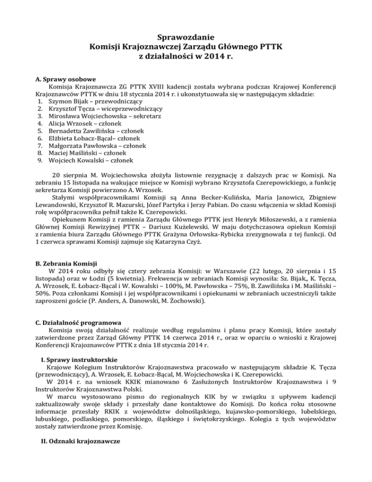 Sprawozdanie Komisji Krajoznawczej Zarządu Głównego PTTK z działalności w 2014 r. A. Sprawy osobowe Komisja Krajoznawcza ZG PTTK XVIII kadencji została wybrana podczas Krajowej Konferencji Krajoznawców PTTK w dniu 18 stycznia 2014 r. i ukonstytuowała się w następującym składzie: 1. Szymon Bijak – przewodniczący 2. Krzysztof Tęcza – wiceprzewodniczący 3. Mirosława Wojciechowska – sekretarz 4. Alicja Wrzosek – członek 5. Bernadetta Zawilińska – członek 6. Elżbieta Łobacz-Bącal– członek 7. Małgorzata Pawłowska – członek 8. Maciej Maśliński – członek 9. Wojciech Kowalski – członek 20 sierpnia M. Wojciechowska złożyła listownie rezygnację z dalszych prac w Komisji. Na zebraniu 15 listopada na wakujące miejsce w Komisji wybrano Krzysztofa Czerepowickiego, a funkcję sekretarza Komisji powierzono A. Wrzosek. Stałymi współpracownikami Komisji są Anna Becker-Kulińska, Maria Janowicz, Zbigniew Lewandowski, Krzysztof R. Mazurski, Józef Partyka i Jerzy Pabian. Do czasu włączenia w skład Komisji rolę współpracownika pełnił także K. Czerepowicki. Opiekunem Komisji z ramienia Zarządu Głównego PTTK jest Henryk Miłoszewski, a z ramienia Głównej Komisji Rewizyjnej PTTK – Dariusz Kużelewski. W maju dotychczasowa opiekun Komisji z ramienia biura Zarządu Głównego PTTK Grażyna Orłowska-Rybicka zrezygnowała z tej funkcji. Od 1 czerwca sprawami Komisji zajmuje się Katarzyna Czyż. B. Zebrania Komisji W 2014 roku odbyły się cztery zebrania Komisji: w Warszawie (22 lutego, 20 sierpnia i 15 listopada) oraz w Łodzi (5 kwietnia). Frekwencja w zebraniach Komisji wynosiła: Sz. Bijak,, K. Tęcza, A. Wrzosek, E. Łobacz-Bącal i W. Kowalski – 100%, M. Pawłowska – 75%, B. Zawilińska i M. Maśliński – 50%. Poza członkami Komisji i jej współpracownikami i opiekunami w zebraniach uczestniczyli także zaproszeni goście (P. Anders, A. Danowski, M. Żochowski). C. Działalność programowa Komisja swoją działalność realizuje według regulaminu i planu pracy Komisji, które zostały zatwierdzone przez Zarząd Główny PTTK 14 czerwca 2014 r., oraz w oparciu o wnioski z Krajowej Konferencji Krajoznawców PTTK z dnia 18 stycznia 2014 r. I. Sprawy instruktorskie Krajowe Kolegium Instruktorów Krajoznawstwa pracowało w następującym składzie K. Tęcza (przewodniczący), A. Wrzosek, E. Łobacz-Bącal, M. Wojciechowska i K. Czerepowicki. W 2014 r. na wniosek KKIK mianowano 6 Zasłużonych Instruktorów Krajoznawstwa i 9 Instruktorów Krajoznawstwa Polski. W marcu wystosowano pismo do regionalnych KIK by w związku z upływem kadencji zaktualizowały swoje składy i przesłały dane kontaktowe do Komisji. Do końca roku stosowne informacje przesłały RKIK z województw dolnośląskiego, kujawsko-pomorskiego, lubelskiego, lubuskiego, podlaskiego, pomorskiego, śląskiego i świętokrzyskiego. Kolegia z tych województw zostały zatwierdzone przez Komisję. II. Odznaki krajoznawcze W skład Zespołu ds. odznak krajoznawczych weszli M. Maśliński (przewodniczący), J. Pabian, W. Kowalski i Z. Lewandowski. Zespół zaopiniował przesłane do Komisji regulaminy odznak: Śladami błogosławionego Edmunda Bojanowskiego i Odznaka Pawła Brylińskiego oraz aktualizację regulaminu odznaki Szlakiem zabytków światowego dziedzictwa UNESCO w Polsce. W związku z kanonizacją papieża Jana Pawła II, Komisja opracowała, z inicjatywy W. Kowalskiego regulamin odznaki „Miejsca kultu św. Jana Pawła II”, który został następnie zatwierdzony przez Prezydium Zarządu Głównego PTTK (uchwała nr XX/XVIII/2014). Autorem znaku graficznego odznaki jest Włodzimierz Majdewicz. Z okazji przypadającej w 2015 r. 40. rocznicy ustanowienia Odznaki Krajoznawczej PTTK, z inicjatywy Sz. Bijaka i Z. Lewandowskiego, przygotowano regulamin odznaki okolicznościowej. Jej wizerunek opracowuje W. Majdewicz. W 2014 r. przyznano 62 Odznaki Krajoznawcze Polski, w tym: 18 brązowych, 21 srebrnyche, 12 złotych i 11 złotych z szafirem. Najwyższy stopień odznaki zdobyli: Monika i Grzegorz Kowalscy ze Skarżyska Kamiennej, Stanisław Kukowski z Elbląga, Helena Maszczyk z Zawiercia, Czesław Wodecki z Jastrzębia Zdrój, Leon Jański z Elbląga, Stanisław Strojny z Gdańska, Ewa i Marek Botulińscy z Zabrza, Barbara Ząbczyk-Chmielewska z Gdańska oraz Marek Szot z Wrocławia. Zespoły Weryfikacyjne ROK w 2014 r. zweryfikowały 1040 brązowe i 411 srebrne ROK (wyniki częściowe). Najwięcej odznak zweryfikowały ZW w oddziałach Wojskowym w Chełmie i Międzyuczelnianym w Warszawie. Powołano dwa nowe zespoły weryfikacyjne w Malborku i Busku Zdrój. III. Sprawy Regionalnych Pracowni Krajoznawczych Zespół ds. Regionalnych Pracowni Krajoznawczych tworzą M. Pawłowska (przewodnicząca), B. Zawilińska, A. Becker-Kulińska, M. Janowicz oraz Sz. Bijak. Zespół koordynował podziału środków z budżetu ZG PTTK przeznaczonych na dofinansowanie RPK. Zaproponowano utworzenie dwóch strumieni finansowania działalności RPK (działania programowe i rozwój kadry programowej) i opracowano stosowne dokumenty (regulaminy i wzory wniosków) do przeprowadzenia konkursów na dofinansowanie. Łącznie w dwóch konkursach (wiosna i jesień) przyznano 2050 zł w ramach funduszu rozwoju osobistego kadry RPK i 7000 zł w ramach funduszu programowego. Beneficjentami tych środków było 4 kierowników pracowni i 10 RPK. Planowana jest kontynuacja tego rozwiązania w latach kolejnych. W kwietniu odbyło się w Łodzi szkolenie kierowników RPK, w którym wzięło udział około 30 osób, w tym przedstawiciele 15 pracowni. Za organizację spotkania odpowiadał A. Danowski z CFK PTTK. Szczególny nacisk położono na sprawy archiwizacji oraz fotografii. IV. Sprawy kolekcjonerskie Podkomisja ds. kolekcjonerstwa krajoznawczego pracowała w składzie W. Kowalski (przewodniczący), M. Maśliński, H. Paciej, J. Motyka i M.Tokarski. Na wniosek Podkomisji dokonano 5 kolejnych mi