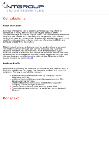 Cel szkolenia About this Course Business intelligence (BI) is becoming increasingly important for companies of many different sizes and types because of the competitive edge it can help to give them. The combined capabilities of Microsoft SQL Server 2012 and Microsoft SharePoint 2010 make it easier than ever for companies to develop a BI solution that meets their specific needs, provides reduced total cost of ownership (TCO), and achieves a faster time to solution. This five-day instructor-led course teaches students how to empower information workers through self-service analytics and reporting. Students will learn how to implement multidimensional analysis solutions, create PowerPivot and tabular data models, deliver rich data visualizations with PowerView and SQL Server Reporting Services, and discover business insights by using data mining. This course helps people prepare for exam 70-466. Audience Profile This course is intended for database professionals who need to fulfill a Business Intelligence Developer role to create analysis and reporting solutions. Primary responsibilities include: Implementing reporting solutions by using SQL Server Reporting Services. Implementing multidimensional databases by using SQL Server Analysis Services. Creating tabular semantic data models for analysis by using SQL Server Analysis Services. Create visualizations of data by using PowerView. Create data mining solutions by using SQL Server Analysis Services. Konspekt At Course Completion After completing this course, students will be able to: Describe the components, architecture, and nature of a BI solution. Create reports with Reporting Services. Create reusable report items that simplify self-service reporting. Manage report execution and delivery. Create a multidimensional database with Analysis Services. Nazwa: Implement dimensions in a cube. Implement measures and measure groups in a cube. Use MDX Syntax. Customize a cube. Implement a Tabular Data Model in PowerPivot. Use DAX to query a tabular model. Implement a Tabular Database. Use PowerView to create interactive data visualizations. Use Data Mining for Predictive Analysis. Czas trwania: 5 dni Ilość godzin: 40 Język: Dodatkowe informacje W cenę szkolenia wliczony jest: Certyfikat Microsoft Kawa, herbata, sładki poczęstunek . Obiad Firma posiada wpis w Urzędzie Miasta Łodzi jako placówka kształcenia ustawicznego. Szkolenie MS 10778 Implementing Data Models and Reports with Microsoft SQL Server 2012 Prowadzący: Autoryzowany trener Microsoft Lokalizacja: Siedziba NT Group lub wybrana przez klienta przy szkoleniu dedykowanym Cena szkolenia: Cena do uzgodnienia. Prosimy o kontakt: 801 011 684 Dostępne terminy NT GROUP Sp. z o.o. 90-418 Łódź, Al. T. Kościuszki 39 III piętro infolina 801 011 684 Tel.: +48 42 655-33-77; Fax: +48 42 630-15-63 e-mail: [email protected] NT Group Systemy Informatyczne Sp. z o.o. Krajowy Rejestr Sądowy Konto Bankowe 90-418 Łódź, Al. T. Kościuszki 39 III piętro KRS 0000214993 Kredyt Bank S.A. tel.: +42 6553377 Sąd Rejonowy dla Łodzi-Śródmieścia Rozliczenie Krajowe: tel. / fax. +42 6301563 w Łodzi, XX Wydział KRS 71 1500 1246 1215 4005 5991 0000 e-mail: [email protected] www.ntgroup.pl Rozliczenie Zagraniczne: Regon: 470557218 PL 71 1500 1246 1215 4005 5991 0000 NIP: 7251888624 KRDBPLPW