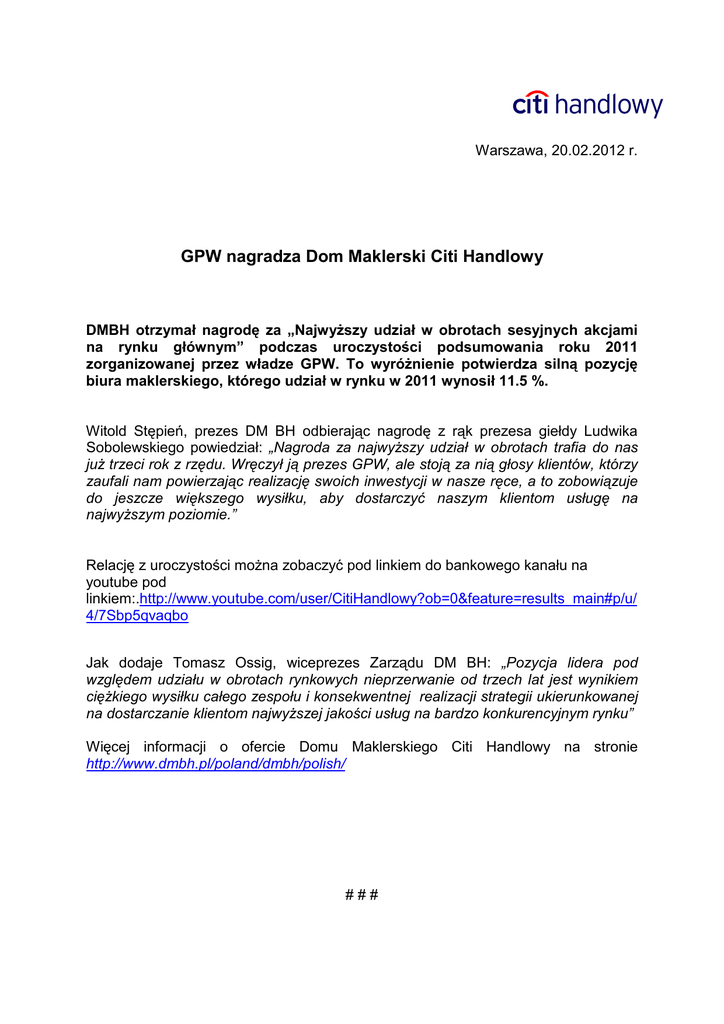 Warszawa, 20.02.2012 r. GPW nagradza Dom Maklerski Citi Handlowy DMBH otrzymał nagrodę za „NajwyŜszy udział w obrotach sesyjnych akcjami na rynku głównym” podczas uroczystości podsumowania roku 2011 zorganizowanej przez władze GPW. To wyróŜnienie potwierdza silną pozycję biura maklerskiego, którego udział w rynku w 2011 wynosił 11.5 %. Witold Stępień, prezes DM BH odbierając nagrodę z rąk prezesa giełdy Ludwika Sobolewskiego powiedział: „Nagroda za najwyŜszy udział w obrotach trafia do nas juŜ trzeci rok z rzędu. Wręczył ją prezes GPW, ale stoją za nią głosy klientów, którzy zaufali nam powierzając realizację swoich inwestycji w nasze ręce, a to zobowiązuje do jeszcze większego wysiłku, aby dostarczyć naszym klientom usługę na najwyŜszym poziomie.” Relację z uroczystości moŜna zobaczyć pod linkiem do bankowego kanału na youtube pod linkiem:.http://www.youtube.com/user/CitiHandlowy?ob=0&feature=results_main#p/u/ 4/7Sbp5qvaqbo Jak dodaje Tomasz Ossig, wiceprezes Zarządu DM BH: „Pozycja lidera pod względem udziału w obrotach rynkowych nieprzerwanie od trzech lat jest wynikiem cięŜkiego wysiłku całego zespołu i konsekwentnej realizacji strategii ukierunkowanej na dostarczanie klientom najwyŜszej jakości usług na bardzo konkurencyjnym rynku” Więcej informacji o ofercie Domu Maklerskiego Citi Handlowy na stronie http://www.dmbh.pl/poland/dmbh/polish/ ### Dodatkowych informacji udziela: Paweł Zegarłowicz, Dyrektor Biura Prasowego, tel. (0-22) 657 72 97 E-mail: [email protected] Agata Charuba-Chadryś, Kierownik ds. Kontaktów z Mediami, tel. (0-22) 692-90 52 E-mail: [email protected] Bank Handlowy w Warszawie SA to jedna z największych instytucji finansowych w Polsce, oferująca pod marką Citi Handlowy bogaty i nowoczesny asortyment produktów i usług bankowości korporacyjnej, inwestycyjnej i detalicznej. Bank Handlowy obsługuje 20 tys. klientów korporacyjnych i 965 000 klientów indywidualnych poprzez nowoczesne kanały dystrybucji oraz sieć ponad 153 oddziałów. W skład grupy kapitałowej Banku wchodzą takie podmioty jak: Dom Maklerski Banku Handlowego i Handlowy Leasing. PrzynaleŜność do Citigroup, największej na świecie instytucji finansowej, zapewnia klientom Banku Handlowego dostęp do usług finansowych w ponad 100 krajach. Dodatkowe informacje moŜna uzyskać na stronie internetowej www.citihandlowy.pl. Citi (NYSE:C) to wiodąca globalna instytucja finansowa, mająca około 200 milionów klientów w ponad 140 krajach. Poprzez swoje dwie odrębne jednostki operacyjne: Citicorp i Citi Holdings, Citi obsługuje klientów indywidualnych, korporacyjnych, rządowych i instytucjonalnych zapewniając im bogaty wachlarz produktów i usług finansowych w zakresie bankowości detalicznej, bankowości korporacyjnej i inwestycyjnej, usług maklerskich i zarządzania aktywami. Dodatkowe informacje moŜna uzyskać na stronie internetowej www.citigroup.com lub or www.citi.com.