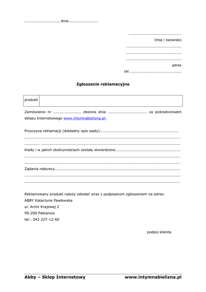 ..........................., dnia........................ .......................................... Imię i nazwisko ............................................ ............................................ ............................................ adres tel. ........................................ Zgłoszenie reklamacyjne produkt Zamówienie nr ...................... złożone dnia ............................... za pośrednictwem sklepu Internetowego www.intymnabielizna.pl; Przyczyna reklamacji (dokładny opis wady)............................................................... ............................................................................................................................ ............ ............................................................................................................... Kiedy i w jakich okolicznościach zostały stwierdzone.................................................... ............................................................................................................................ ............................................................................................................................ Żądania nabywcy.................................................................................................... ............................................................................................................................ ............................................................................................................................ Reklamowany produkt należy odesłać wraz z podpisanym zgłoszeniem na adres: ABBY Katarzyna Pawłowska ul. Armii Krajowej 2 95-200 Pabianice tel.: 042 227-12-60 podpis klienta Abby – Sklep Internetowy www.intymnabielizna.pl Decyzja sprzedawcy Opinia rzeczoznawcy: .......................................................................................... ............................................................................................................................ ............................................................................................................................ ............................................................................................................................ ............................................................................................................................ Sposób załatwienia reklamacji: ........................................................................... ............................................................................................................................ ............................................................................................................................ ............................................................................................................................ ............................................................................................................................ Uzasadnienie: ..................................................................................................... ............................................................................................................................ ............................................................................................................................ ............................................................................................................................ ............................................................................................................................ ............................................................................................................................ ............................................................................................................................ Pieczęć i podpis sprzedawcy Abby – Sklep Internetowy www.intymnabielizna.pl