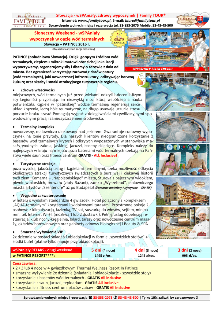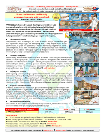 Słowacja - wSPAniały, zdrowy wypoczynek | Family TOUR® Internet: www.familytour.pl, E-mail: [email protected] Sprawdzenie wolnych miejsc i rezerwacja tel. 33-853-2075 Mobile. 53-43-43-500 Słoneczny Weekend - wSPAniały wypoczynek w oazie wód termalnych Słowacja – PATINCE 2016 r. (Dojazd własny lub zorganizowany) PATINCE (południowa Słowacja). Dzięki gorącym źródłom wód termalnych, ciepłemu mikroklimatowi oraz cichej lokalizacji – wypoczywamy, regenerujemy siły i dbamy o zdrowie z dala od miasta. Bez ograniczeń korzystając zarówno z darów natury (wód termalnych), jaki nowoczesnej infrastruktury, odkrywając barwną kulturę oraz skarby i smaki atrakcyjnego turystycznie regionu. Zdrowe właściwości miejscowych, wód termalnych już przed wiekami odkryli i docenili Rzymscy Legioniści przypisując im niezwykłą moc, którą współczesna nauka potwierdziła. Kąpiele w "patińskiej" wodzie termalnej: regenerują serce i układ krążenia, leczą bóle reumatyczne, na długo usuwają uczucie stresu i poczucie braku czasu! Pomagają wygrać z dolegliwościami cywilizacyjnymi spowodowanymi pracą i zanieczyszczeniem środowiska. Termalny kompleks nowoczesny, malowniczo ulokowany nad jeziorem. Gwarantuje cudowny wypoczynek na łonie przyrody. Dla naszych klientów nieograniczone korzystanie z basenów wód termalnych krytych i odkrytych wyposażonych w stanowiska masaży wodnych, zakola, jaskinię, jacuzzi, baseny dziecięce. Kompleks należy do najlepszych w kraju na miejscu poza basenami wód termalnych czekają na Państwa wiele saun oraz fitness centrum GRATIS - ALL Inclusive! Turystyczne atrakcje poza wysoką, jakością usług i kąpielami termalnymi, czeka możliwość odkrycia okolicznych atrakcji turystycznych świadczących o burzliwej i ciekawej historii tych ziem! Komarna – „Napoleońskiego” miasta, Sturova z bajecznym widokiem, piwnic winiarskich, browaru (złoty Bażant), zamku „Wyszehrad”, malowniczego miasta artystów „Szentendre” aż po Budapeszt (Pomocne materiały turystyczne – GRATIS) Wygodne zakwaterowanie w hotelu o wysokim standardzie 4 gwiazdek! Hotel połączony z kompleksem „AQUA-termalnym” korytarzami i widokowymi tarasami. Przestronne pokoje 2 osobowe z klimatyzacją, łazienką, TV-sat, suszarką do włosów, sejfem, minibarem, tel. Internet WI-FI, (możliwa 1 lub 2 dostawki). Pełnię usług dopełniają restauracja, klub nocny-kręgielnia, bilard, tarasy oraz nowoczesne centrum masaży, okładów borowinowych oraz gabinety odnowy biologicznej i Beauty & SPA. Smaczne wyżywienie VIP 2x dziennie w postaci śniadań i obiadokolacji w formie „szwedzkich stołów” + słodki bufet (płatne tylko napoje przy obiadokolacji). wSPAniały RELAKS - długi weekend w PATINCE RESORT****: 5 dni (4 noce) 4 dni (3 noce) 3 dni (2 noce) 1495 zł/os. 1245 zł/os. 995 zł/os. Cena zawiera: • 2 / 3 lub 4 noce w 4 gwiazdkowym Thermal Wellness Resort In Patince • smaczne wyżywienie 2x dziennie (śniadania i obiadokolacje - szwedzkie stoły) • korzystanie z basenów wód termalnych - GRATIS All inclusive • korzystanie z saun, jacuzzi, tepidarium- GRATIS All inclusive • korzystanie z fitness centrum, placów zabaw - GRATIS All inclusive Sprawdzenie wolnych miejsc i rezerwacja 33-853-2075 53-43-43-500 | Tylko 10% zaliczki by zarezerwować! 2|Strona wSPAniały, zdrowy wypoczynek w oazie wód termalnych.. PATINCE – długi weekend 2016 r. • stanowiska masaży i biczów wodnych w basenach - GRATIS All inclusive • infrastruktura (tarasy, leżaki, zjeżdżalnie wodne..)- GRATIS All inclusive • możliwość udziału w animacjach i AQUA Aerobiku - GRATIS All inclusive • kupon wartości 10 E do wykorzystania na zabiegi - GRATIS All inclusive • 1x klasyczny masaż (dorośli), 1x biopedikiur (od 5 dni) - GRATIS • 1x minigolf, 1x rowery wodne/pokój, 1x diagnostyka organizmu – GRATIS • szlafrok na czas wypoczynku, kosmetyki hotelowe, suszarka do włosów • Internet WI-FI w pokoju i lobby barze, całodobowa recepcja • faktura VAT (polski rachunek) pozwalający skorzystać z funduszu socjalnego i odliczeń • pakiet ubezpieczeń KL + NNW Signal Iduna z KL i NNW chorób przewlekłych do 10 000 € • parkowanie samochodu przy hotelu (teren dozorowany) • przed wypoczynkiem zestaw pomocnych informatorów– turystycznych • mapa z planem dojazdu i atrakcji turystycznych Cena nie zawiera: opłaty klimatycznej 0,82 €/os/dzień, pokój jednoosobowy +20%, Superior (2-4 os.) +25%. Zniżki: dzieci do lat 6 - GRATIS do lat 15 na dostawce -40%. Karta F&T® -45 zł, wczesna rezerwacja (>35 dni) -2%. Sprawdzenie wolnych miejsc i rezerwacja 33-853-2075 53-43-43-500 | Tylko 10% zaliczki by zarezerwować!