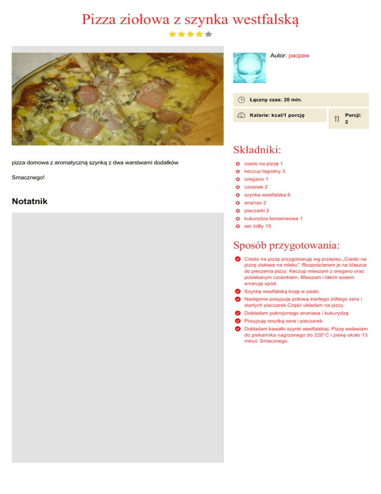 Pizza ziołowa z szynka westfalską Autor: pacpaw Łączny czas: 20 min. Kalorie: kcal/1 porcję Porcji: 2 Składniki: pizza domowa z aromatyczną szynką z dwa warstwami dodatków ciasto na pizzę 1 keczup łagodny 3 Smacznego! oregano 1 czosnek 2 szynka westfalska 6 Notatnik ananas 2 pieczarki 2 kukurydza konserwowa 1 ser żółty 15 Sposób przygotowania: Ciasto na pizzę przygotowuję wg przepisu „Ciasto na pizzę ziołowe na mleku”. Rozpościeram je na blaszce do pieczenia pizzy. Keczup mieszam z oregano oraz posiekanym czosnkiem. Mieszam i takim sosem smaruję spód. Szynkę westfalską kroję w paski. Następnie posypuję połową startego żółtego sera i startych pieczarek.Część układam na pizzy. Dokładam pokrojonego ananasa i kukurydzę. Posypuję resztką sera i pieczarek. Dokładam kawałki szynki westfalskiej. Pizzę wstawiam do piekarnika nagrzanego do 220°C i piekę około 13 minut. Smacznego.