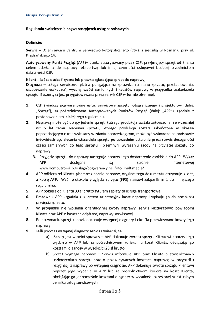 Regulamin świadczenia pogwarancyjnych uslug