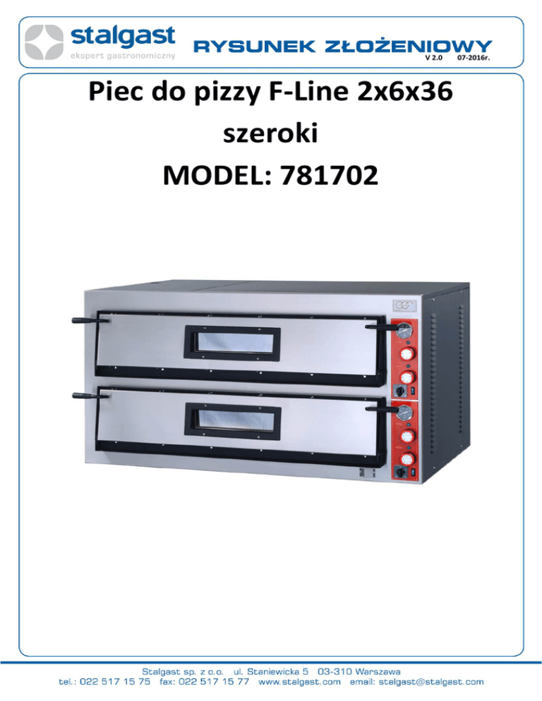 V 2.0 Piec do pizzy F-Line 2x6x36 szeroki MODEL: 781702 07-2016r. LP. Numer katalogowy 1 V781702-01 2 V781702-02 3 V781702-03 4 V781702-04 5 V781702-05 6 V781702-06 7 V781702-07 8 V781702-08 9 V781702-09 10 V781702-10 11 V781702-11 12 V781702-12 13 V781702-13 14 V781702-14 15 V781702-15 16 V781702-16 17 V781702-17 18 V781702-18 19 V781702-19 20 V781702-20 21 V781702-21 22 V781702-22 23 V781702-23 24 V781702-24 25 V781702-25 26 V781702-26 27 V781702-27 28 V781702-28 29 V781702-29 30 V781702-30 31 V781702-31 32 V781702-32 33 V781702-33 34 V781702-34 35 V781702-35 36 V781702-36 37 V781702-37 38 V781702-38 39 V781702-39 40 V781702-40 41 V781702-41 42 V781702-42 43 V781702-43 Nazwa części Ramka szkła Szkło ochronne Wspornik Rękojeść Zestaw montażowy rączkę Rama drzwi Panel przedni drzwi Płyta szamotowa Kominek Obudowa wewnętrzna Obudowa lewa Lewy panel obudowy Materiał izolujący Obudowa zewnętrzna Wspornik Listwa zacisków Uszczelka Szkło ochronne Lampka halogenowa Oprawka Transformator Zestaw oświetlenia Wspornik Wspornik do lampy Prawa obudowa zewnętrzna pieca Panel z włókna ceramicznego Element grzewczy Folia panelu sterowania Ramka drzwi Drzwi Obudowa zewnętrzna drzwi Uszczelka Termostat Termometr Lampka sygnalizacji Pokrętło regulacji termostatu Główny przełącznik Włącznik światła Panel sterowania Sterownik elektryczny Kontaktron Sprężyna lampy Sterownik elektryczny