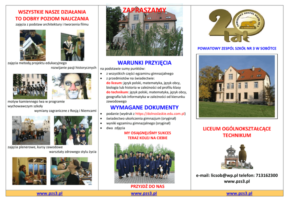 WSZYSTKIE NASZE DZIAŁANIA TO DOBRY POZIOM NAUCZANIA ZAPRASZAMY zajęcia z podstaw architektury i tworzenia filmu POWIATOWY ZESPÓL SZKÓŁ NR 3 W SOBÓTCE WARUNKI PRZYJĘCIA zajęcia metodą projektu edukacyjnego rozwijanie pasji historycznych na podstawie sumy punktów: z wszystkich części egzaminu gimnazjalnego z przedmiotów na świadectwie: do liceum: język polski, matematyka, język obcy, biologia lub historia w zależności od profilu klasy do technikum: język polski, matematyka, język obcy, geografia lub informatyka w zależności od kierunku zawodowego motyw kamiennego lwa w programie wychowawczym szkoły wymiany zagraniczne z Rosją i Niemcami podanie (wydruk z https://dolnoslaskie.edu.com.pl) świadectwo ukończenia gimnazjum (oryginał) wyniki egzaminu gimnazjalnego (oryginał) dwa zdjęcia WYMAGANE DOKUMENTY MY OSIĄGNĘLIŚMY SUKCES TERAZ KOLEJ NA CIEBIE LICEUM OGÓLNOKSZTAŁCĄCE TECHNIKUM zajęcia plenerowe, kursy zawodowe warsztaty zdrowego stylu życia e-mail: [email protected] telefon: 713162300 www.pzs3.pl www.pzs3.pl PRZYJDŹ DO NAS www.pzs3.pl www.pzs3.pl LICEUM OGÓLNOKSZTAŁCĄCE TECHNIKUM Nauka trwa 3 lata Nauka trwa 4 lata Dobre przygotowanie do egzaminu maturalnego i zawodowego Dobre przygotowanie do egzaminu maturalnego NASZE ATUTY TECHNIK INFORMATYK przedmioty rozszerzone: geografia język angielski KLASA BIOLOGICZNO – DIETETYCZNA przedmioty rozszerzone: biologia wiedza o społeczeństwie język angielski warsztaty zdrowego stylu życia pracownia przyrodniczo – fotograficzna KLASA HUMANISTYCZNO – FILMOWA przedmioty rozszerzone: historia wiedza o społeczeństwie język polski warsztaty filmowo – fotograficzne pracownia prawa i małego biznesu Uczymy praktycznie języków obcych: angielski rozszerzony niemiecki podstawowy rosyjski podstawowy Prowadzimy pilotaż warsztatów z dziedziny wojskowości i ratownictwa medycznego przy współpracy z Wyższą Szkołą Oficerską Wojsk Lądowych we Wrocławiu www.pzs3.pl absolwent zdobędzie umiejętności: posługiwania się grafiką 3D projektowania i tworzenia systemów baz danych obsługi komputerów w różnych systemach operacyjnych przeprowadzania prac konserwacyjnych oprogramowania konfigurowania sprzętu komputerowego tworzenia aplikacji oraz interaktywnych stron www TECHNIK OBSŁUGI TURYSTYCZNEJ przedmioty rozszerzone: geografia język angielski absolwent zdobędzie umiejętności: prowadzenia własnych firm hotelarskich, agroturystycznych i biur podróży opracowywania programów imprez turystycznych organizowania imprez turystycznych przygotowywania ofert turystycznych kalkulowania kosztów zamawianych świadczeń obsługiwania klienta. promowania usług przedsiębiorstwa udzielania informacji turystycznej www.pzs3.pl jesteśmy blisko ciebie, dzięki nam ekonomicznie gospodarujesz swoim czasem zajęcia prowadzą doświadczeni nauczyciele oferujący interaktywne metody nauczania profesjonalnie przygotowujemy do egzaminów: maturalnego i zawodowego zdawalność i jakość egzaminów naszych absolwentów koresponduje z wynikami regionu dolnośląskiego oferujemy stypendia dyrektora dla uczniów osiągających wysokie średnie w każdym semestrze organizujemy odpłatne kursy prawa jazdy rozwijamy zainteresowania młodzieży uzdolnionej w systemie indywidualnym pomagamy w rozwoju młodzieży tymczasowo zagubionej, w sytuacjach kryzysowych organizujemy ciekawe zajęcia pozalekcyjne prowadzone metodą projektów edukacyjnych dbamy o edukację europejską, możesz uczestniczyć w wyjazdach zagranicznych do Niemiec, Rosji i na Ukrainę nie jesteśmy anonimowi, posiadamy najwyższe notowania z ewaluacji zewnętrznej www.pzs3.pl