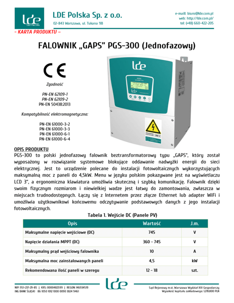LDE Polska Sp. z o.o. e-maill: [email protected] web: http://lde.com.pl/ tel: (+48) 660-422-205 02-843 Warszawa, ul. Tukana 9B - KARTA PRODUKTU – FALOWNIK „GAPS” PGS-300 (Jednofazowy) Zgodność PN-EN 62109-1 PN-EN 62109-2 PN-EN 50438:2013 Kompatybilność elektromagnetyczna: PN-EN 61000-3-2 PN-EN 61000-3-3 PN-EN 61000-6-1 PN-EN 61000-6-4 OPIS PRODUKTU PGS-300 to polski jednofazowy falownik beztransformatorowy typu „GAPS”, który został wyposażony w rozwiązanie systemowe blokujące oddawanie nadwyżki energii do sieci elektrycznej. Jest to urządzenie polecane do instalacji fotowoltaicznych wykorzystujących maksymalną moc z paneli do 4,5kW. Menu w języku polskim pokazywane jest na wyświetlaczu LCD 3”, a ergonomiczna klawiatura umożliwia skuteczną i szybką komunikację. Falownik dzięki swoim fizycznym rozmiarom i niewielkiej wadze jest łatwy do zamontowania, zwłaszcza w miejscach trudnodostępnych. Łączy się z Internetem przez złącze Ethernet lub adapter WiFi i umożliwia użytkownikowi końcowemu odczytywanie podstawowych danych z jego instalacji fotowoltaicznych. Tabela 1. Wejście DC (Panele PV) Opis Wartość J.m. 745 V 360 - 745 V Maksymalny prąd wejściowy falownika 10 A Maksymalna moc zainstalowanych paneli 4,5 kW 12 - 18 szt. Maksymalne napięcie wejściowe (DC) Napięcie działania MPPT (DC) Rekomendowana ilość paneli w szeregu NIP: 951-237-29-85 | KRS: 0000482599 | REGON: 146934519 ING BANK ŚLĄSKI 86 1050 1012 1000 0090 3024 9461 Rev. 3.0 Sąd Rejonowy m.st. Warszawa Wydział XIII Gospodarczy Wysokość kapitału zakładowego: 1.278.800 PLN LDE Polska Sp. z o.o. e-maill: [email protected] web: http://lde.com.pl/ tel: (+48) 660-422-205 02-843 Warszawa, ul. Tukana 9B Tabela 2. Wyjście AC odbiornik/sieć Opis Wartość J.m. 195 – 253 V Znamionowy prąd wyjściowy AC falownika 16 A Maksymalny prąd wyjściowy AC falownika 18 A 49 – 51 Hz 0 – 4000 W 0,95 C – 0,95 L - jednofazowa L / N / PE - ~ 10 W Znamionowe napięcie wyjściowe AC RMS Częstotliwość Maksymalna moc wyjściowa AC falownika Współczynnik mocy Typ sieci Pobór mocy na potrzeby własne Tabela 3. Dane ogólne Opis Wartość Gabaryty (szer. x wys. x gł.) – [cm] 28,2 x 37,1 x 15,1 Waga netto [kg] 9 kg Temperatura ciągłej pracy Wilgotność względna 0 - 40°C 5 – 75% niekondensująca Topologia Beztransformatorowa Metoda chłodzenia Radiator + wentylator Klasa izolacji I Typ ochrony IP IP 20 Monitoring zdalny Ethernet Komunikacja (opcja) RS485; RS232 (ISO); CAN Gwarancja producenta NIP: 951-237-29-85 | KRS: 0000482599 | REGON: 146934519 ING BANK ŚLĄSKI 86 1050 1012 1000 0090 3024 9461 5 lat Rev. 3.0 Sąd Rejonowy m.st. Warszawa Wydział XIII Gospodarczy Wysokość kapitału zakładowego: 1.278.800 PLN