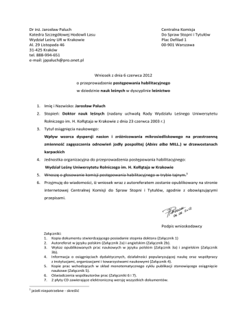 Dr inż. Jarosław Paluch Katedra Szczegółowej Hodowli Lasu Wydział Leśny UR w Krakowie Al. 29 Listopada 46 31-425 Kraków tel. 888-994-651 e-mail: [email protected] Centralna Komisja Do Spraw Stopni i Tytułów Plac Defilad 1 00-901 Warszawa Wniosek z dnia 6 czerwca 2012 o przeprowadzenie postępowania habilitacyjnego w dziedzinie nauk leśnych w dyscyplinie leśnictwo 1. Imię i Nazwisko: Jarosław Paluch 2. Stopień: Doktor nauk leśnych (nadany uchwałą Rady Wydziału Leśnego Uniwersytetu Rolniczego im. H. Kołłątaja w Krakowie z dnia 23 czerwca 2003 r.) 3. Tytuł osiągnięcia naukowego: Wpływ wzorca dyspersji nasion i zróżnicowania mikrosiedliskowego na przestrzenną zmienność zagęszczenia odnowień jodły pospolitej (Abies alba MILL.) w drzewostanach karpackich 4. Jednostka organizacyjna do przeprowadzenia postępowania habilitacyjnego: Wydział Leśny Uniwersytetu Rolniczego im. H. Kołłątaja w Krakowie 5. Wnoszę o głosowanie komisji postępowania habilitacyjnego w trybie tajnym.1 6. Przyjmuję do wiadomości, iż wniosek wraz z autoreferatem zostanie opublikowany na stronie internetowej Centralnej Komisji do Spraw Stopni i Tytułów, zgodnie z obowiązującymi przepisami. Podpis wnioskodawcy Załączniki: 1. Kopia dokumentu stwierdzającego posiadanie stopnia doktora (Załącznik 1) 2. Autoreferat w języku polskim (Załącznik 2a) i angielskim (Załącznik 2b). 3. Wykaz opublikowanych prac naukowych w języku polskim (Załącznik 3a) i angielskim (Załącznik 3b). 4. Informacja o osiągnięciach dydaktycznych, działalności popularyzującej naukę oraz współpracy z instytucjami, organizacjami i towarzystwami naukowymi (Załącznik 4). 5. Kopie prac wchodzących w skład monotematycznego cyklu publikacji stanowiącego osiągnięcie naukowe (Załącznik 5). 6. Oświadczenia współautorów prac (Załączniki 6 i 7). 7. 2 płyty CD zawierające elektroniczną wersję wszystkich dokumentów. 1 jeżeli niepotrzebne - skreślić