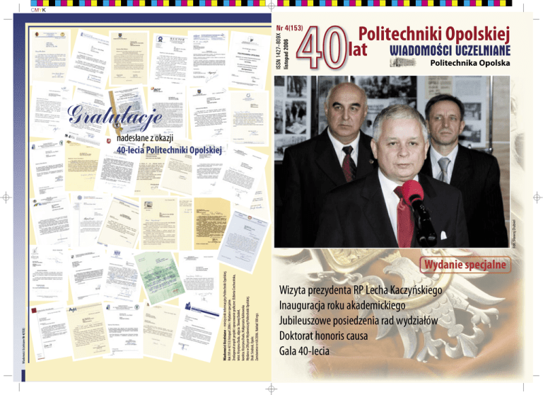 Wiadomości Uczelniane – miesięcznik informacyjny Politechniki Opolskiej. Rok XVI nr 4(153) listopad 2006 r. Wydanie specjalne. Zredagował zespół: projekt i opracowanie graficzne: Elżbieta Ciechocińska, tekst: Krystyna Duda, zdjęcia: Sławoj Dubiel, korekta: Krystyna Duda, Małgorzata Kalinowska Wydano w Oficynie Wydawniczej Politechniki Opolskiej. Druk: Sindruk, Opole. Zamówienie nr 68/2006. Nakład 500 egz. Wiadomości Uczelniane Nr 4(153) Fot. Sławoj Dubiel Nr 4(153) 16 Wizyta prezydenta RP Lecha Kaczyńskiego Inauguracja roku akademickiego Jubileuszowe posiedzenia rad wydziałów Doktorat honoris causa Gala 40-lecia Wiadomości Uczelniane Nr 4(153) ISSN 1427–809X listopad 2006 CMYK Politechniki Opolskiej lat Politechnika Opolska Gratulacje nadesłane z okazji 40-lecia Politechniki Opolskiej Wydanie specjalne CMYK Za nami uroczystości jubileuszowe C Czterdziestolecie działalności obchodzone w Politechnice Opolskiej w roku 2006 zaznaczone zostało szeregiem imprez akademickich i ważnych dla uczelni wydarzeń. W roku jubileuszu – 40 lat od podjęcia decyzji o utworzeniu w Opolu samodzielnej uczelni technicznej odbywały się konferencje naukowe, sympozja, wystawy, Politechnika Opolska przyjęła nowy statut, jednak najważniejsze obchody rocznicowe miały miejsce jesienią i rozpoczęła je inauguracja roku akademickiego, która tym razem odbyła się w nowo wybudowanej hali sportowej na terenie II kampusu uczelni przy ul. Prószkowskiej. Po raz pierwszy uroczystość zgromadziła tak licznie publiczność i studentów, którzy zajęli nawet trybuny hali. Inaugurując kolejny rok akademicki na terenie II kampusu odstąpiono od wieloletniej tradycji odbywania uroczystości w auli przy ul. Katowickiej. Goście inauguracji byli pod wrażeniem miejsca, a więc zarówno nowo wybudowanej nowoczesnej hali sportowej jak i diametralnej zmiany przeznaczenia dawnych koszar przeobrażonych w obiekt akademicki służący dydaktyce i nauce – i jak zauważył w przemówieniu gość inauguracji ks. abp A. Nossol, na politechnice naocznie „miecze zostały przekute na lemiesze”. iespełna miesiąc wcześniej politechnika podjęła się organizacji kolejnej – czwartej już edycji opolskiego festiwalu nauki. Kiedy trwał festiwal, Polski Związek Filatelistów Zarząd w Opolu N Przemawia wiceminister, prof. Stefan Jurga podczas ceremonii wręczenia doktoratu honorowego przygotował Międzyokręgową Wystawę Filatelistyczną „40 lat Politechniki Opolskiej” – warto podkreślić, że 77 koło PZF powstało przy uczelni już w roku 1977. Wystawa znajdująca się w holu budynku głównego obok eksponatów filatelistycznych prezentowała także pamiątki filatelistyczne – kartki pocztowe, stemple okolicznościowe dokumentujące ważne w życiu uczelni wydarzenia. T ydzień później, 30 listopada rada wydziału – po raz pierwszy – przeprowadziła kolokwium habilitacyjne. Sylwetkę habilitanta, dr. inż. Dariusza Zmarzłego z Instytutu Elektroenergetyki przedstawił dziekan prof. Ryszard Rojek. Dr. Zmarzły omówił tezy i wyniki naukowe zawarte w rozprawie habilitacyjnej pt. Modelowanie elektryzacji strumieniowej, następnie recenzenci przedstawili konkluzje swoich ocen, wobec których ustosunkować musiał się habilitant. Recenzje rozprawy habilitacyjnej przygotowali prof. Jerzy Skubis oraz prof. Janusz Fleszyński z Politechniki Wrocławskiej. Dwóch recenzentów – prof. Kazimierza Zakrzewskiego z Politechniki Łódzkiej i Mirosława Dąbrowskiego z Instytutu Elektrotechniki w Warszawie wyznaczyła Centralna Komisja. Po dyskusji rada wydziału w głosowaniu ustosunkowała się do tego, co przedstawił dr Zmarzły, a także wybrała temat wykładu habilitacyjnego. Po wykładzie rada wydziału przystąpiła do głosowania w sprawie nadania stopnia naukowego doktora habilitowanego. Trwającą 5 godzin procedurę zakończyło głosowanie. Decyzja była pomyślna dla habilitanta, uzyskał 23 głosy popierające, przy 2 głosach przeciw. Od lewej Marian Łukaniszyn, Janusz Fleszyński, Jerzy Skubis Od lewej Piotr Wach, Ryszard Rojek, Dariusz Zmarzły, Jerzy Skubis, Janusz Fleszyński Prof. Aleksandr W. Szymanowski wręcza różę z tytanu wykonaną w Instytucie Naukowo-Badawczym i Projektowania Konstrukcji Stalowych w Kijowie ▶ Habilitant odbiera gratulacje od współpracowników Prof. Martin Stohrer odczytuje podczas gali dokument, w którym przekazuje Politechniece Opolskiej osobistą nagrodę 2 G ratulacje i kwiaty zakończyły emocjonującą – nie tylko dla habilitanta – procedurę, gdyż w myśl ustawy decyzja Rady Wydziału Elektrotechniki, Automatyki i Informatyki jest prawomocna. Warto dodać, że dr hab. inż. Dariusz Zmarzły (30 lat) jest absolwentem Politechniki Opolskiej, a dotychczasową karierę naukową rozwijał pod kierunkiem prof. Jerzego Skubisa. Wiadomości Uczelniane Nr 4(153) Wiadomości Uczelniane Nr 4(153) Tomasz Boczar, Dariusz Zmarzły 15 CMYK Od lewej Barbara Kaszowska, Krystyna Macek-Kamińska, Jan Sadecki, Zdzisław Kabza Od lewej Barbara Kaszowska, Krystyna Macek-Kamińska, Jan Sadecki ▶ Ryszard Rojek Wiadomości Uczelniane Nr 4(153) Wydział Elektrotechniki, Automatyki i Informatyki posiada uprawnienia do nadawania stopnia naukowego doktora nauk technicznych w dyscyplinie elektrotechnika oraz automatyka i robotyka, a także uprawnienia do nadawania stopnia naukowego doktora habilitowanego nauk technicznych w dyscyplinie elektrotechnika. Stopień doktora nauk technicznych uzyskało na wydziale 27 osób, doktora habilitowanego – 1 osoba, przygotowano 1 wniosek o tytuł profesorski. Od lewej Tomasz Boczar, ▶ Jan Sadecki, Włodzimierz Stanisławski 14 J ubileusz czterdziestolecia przygotowały także wydziały, 24 października sesję jubileuszową miał Wydział Mechaniczny, dwa dni później Wydział Elektrotechniki, Automatyki i Informatyki, a 8 listopada Wydział Budownictwa. Te trzy jednostki funkcjonują od zarania uczelni. Ogó