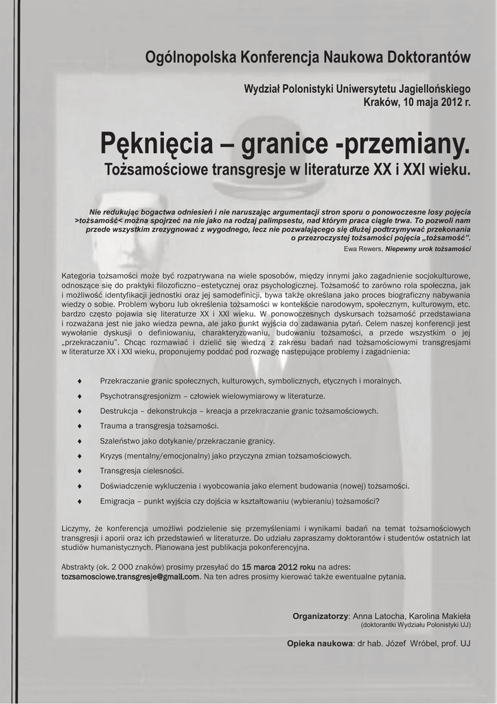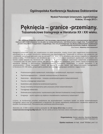 Ogólnopolska Konferencja Naukowa Doktorantów Wydział Polonistyki Uniwersytetu Jagiellońskiego Kraków, 10 maja 2012 r. Pęknięcia – granice -przemiany. Tożsamościowe transgresje w literaturze XX i XXI wieku. Nie redukując bogactwa odniesień i nie naruszając argumentacji stron sporu o ponowoczesne losy pojęcia >tożsamość< można spojrzeć na nie jako na rodzaj palimpsestu, nad którym praca ciągle trwa. To pozwoli nam przede wszystkim zrezygnować z wygodnego, lecz nie pozwalającego się dłużej podtrzymywać przekonania o przezroczystej tożsamości pojęcia „tożsamość”. Ewa Rewers, Niepewny urok tożsamości Kategoria tożsamości może być rozpatrywana na wiele sposobów, między innymi jako zagadnienie socjokulturowe, odnoszące się do praktyki filozoficzno–estetycznej oraz psychologicznej. Tożsamość to zarówno rola społeczna, jak i możliwość identyfikacji jednostki oraz jej samodefinicji, bywa także określana jako proces biograficzny nabywania wiedzy o sobie. Problem wyboru lub określenia tożsamości w kontekście narodowym, społecznym, kulturowym, etc. bardzo często pojawia się literaturze XX i XXI wieku. W ponowoczesnych dyskursach tożsamość przedstawiana i rozważana jest nie jako wiedza pewna, ale jako punkt wyjścia do zadawania pytań. Celem naszej konferencji jest wywołanie dyskusji o definiowaniu, charakteryzowaniu, budowaniu tożsamości, a przede wszystkim o jej „przekraczaniu”. Chcąc rozmawiać i dzielić się wiedzą z zakresu badań nad tożsamościowymi transgresjami w literaturze XX i XXI wieku, proponujemy poddać pod rozwagę następujące problemy i zagadnienia: ¨ Przekraczanie granic społecznych, kulturowych, symbolicznych, etycznych i moralnych. ¨ Psychotransgresjonizm – człowiek wielowymiarowy w literaturze. ¨ Destrukcja – dekonstrukcja – kreacja a przekraczanie granic tożsamościowych. ¨ Trauma a transgresja tożsamości. ¨ Szaleństwo jako dotykanie/przekraczanie granicy. ¨ Kryzys (mentalny/emocjonalny) jako przyczyna zmian tożsamościowych. ¨ Transgresja cielesności. ¨ Doświadczenie wykluczenia i wyobcowania jako element budowania (nowej) tożsamości. ¨ Emigracja – punkt wyjścia czy dojścia w kształtowaniu (wybieraniu) tożsamości? Liczymy, że konferencja umożliwi podzielenie się przemyśleniami i wynikami badań na temat tożsamościowych transgresji i aporii oraz ich przedstawień w literaturze. Do udziału zapraszamy doktorantów i studentów ostatnich lat studiów humanistycznych. Planowana jest publikacja pokonferencyjna. Abstrakty (ok. 2 000 znaków) prosimy przesyłać do 15 marca 2012 roku na adres: [email protected]. Na ten adres prosimy kierować także ewentualne pytania. Organizatorzy: Anna Latocha, Karolina Makieła (doktorantki Wydziału Polonistyki UJ) Opieka naukowa: dr hab. Józef Wróbel, prof. UJ