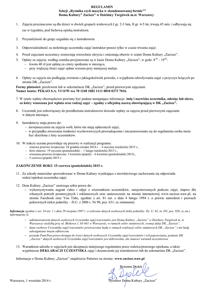 REGULAMIN Sekcji „Rytmika czyli muzyka w skondensowanej formie”” Domu Kultury” Zacisze” w Dzielnicy Targówek m.st. Warszawy 1. Zajęcia przeznaczone są dla dzieci w dwóch grupach wiekowych I gr. 2-3 lata, II gr. 4-5 lat, trwają 45 min. i odbywają się raz w tygodniu, pod fachową opieką instruktora. 2. Przynależność do grupy uzgadnia się z instruktorem. 3. Odpowiedzialność za nieletniego uczestnika zajęć instruktor ponosi tylko w czasie trwania zajęć. 4. Przed zajęciami uczestnicy zostawiają wierzchnie okrycia i zmieniają obuwie w szatni Domu Kultury „Zacisze”. 5. Opłaty za zajęcia, według cennika przyjmowane są w kasie Domu Kultury „Zacisze”, w godz. 8 30 – 1930: kwota 40 zł jest opłatą za cztery spotkania w miesiącu, przy większej ilości zajęć opłata wzrasta-przy mniejszej maleje. Opłaty za zajęcia nie podlegają zwrotom z jakiegokolwiek powodu, z wyjątkiem odwoływania zajęć z przyczyn leżących po stronie DK „Zacisze”. Formy płatności: przelewem lub w sekretariacie DK „Zacisze”, przed pierwszymi zajęciami. Numer konta: PEKAO S.A. VI O/W-wa 70 1240 1082 1111 0010 0373 7016. 6. 7. W tytule wpłaty obowiązkowo powinny być podane następujące informacje: imię i nazwisko uczestnika, miesiąc lub okres, za który wnoszona jest wpłata oraz rodzaj zajęć – zgodny z oficjalną nazwą obowiązującą w DK „Zacisze”. 8. Uczestnik jest zobowiązany do przedłożenia instruktorowi dowodu wpłaty za zajęcia przed pierwszymi zajęciami w danym miesiącu. 9. Instruktorzy maja prawo do: niewpuszczenia na zajęcia osób, które nie mają opłaconych zajęć, w przypadku stwarzania trudności wychowawczych prowadzącemu i niezastosowania się do regulaminu osoba może być skreślona z listy uczestników. 10. W trakcie sezonu przewiduje się przerwy w realizacji programu: – – – – zimowa przerwa świąteczna: 24 grudnia (środa) 2014 r. – 4 stycznia (niedziela) 2015 r., ferie zimowe: 19 stycznia (poniedziałek) – 1 lutego (niedziela) 2015 r., wiosenna przerwa świąteczna: 3 kwietnia (piątek) – 6 kwietnia (poniedziałek) 2015r., 5 czerwca (piątek) 2015 r. ZAKOŃCZENIE ROKU 15 czerwca (poniedziałek) 2015 r. 11. Za szkody materialne spowodowane w Domu Kultury wynikające z niewłaściwego zachowania się odpowiada rodzic/opiekun uczestnika zajęć. 12. Dom Kultury „Zacisze” zastrzega sobie prawo do: wykorzystywania nagrań video i zdjęć z wizerunkiem uczestników, zarejestrowanych podczas zajęć, imprez dla własnych potrzeb promocyjnych i reklamowych oraz umieszczenie na stronie internetowej www.zacisze.waw.pl, na stronie Facebook oraz You Tube, zgodnie z art. 81 ust. z dnia 4 lutego 1994 r. o prawie autorskim i prawach pokrewnych (tekst jednolity – D.U. z 2006 r. Nr 90, poz. 631; ze zmianami). Informacja zgodnie z art. 24 ust. 1 z dnia 29 sierpnia 1997 r. o ochronie danych osobowych (tekst jednolity: Dz. U. 02, nr 101, poz. 926, ze zm.) informujemy iż: administratorem danych osobowych Uczestnika zajęć/warsztatów jest Domu Kultury „Zacisze” w Dzielnicy Targówek m. st. Warszawyz siedzibą przy ul. Blokowa 1, 03-641 w Warszawie, w ramach celów statutowych, zwanej dalej DK „Zacisze”, dane osobowe Uczestnika zajęć/warsztatów przetwarzane będą w ramach realizacji celów statutowych DK „Zacisze” i nie będą udostępniane innym odbiorcom, posiada Pani/Pan prawo dostępu do treści danych osobowych Uczestnika zajęć/warsztatów i ich poprawiania, podanie DK „Zacisze” danych osobowych Uczestnika zajęć/warsztatów jest dobrowolne, ale stanowi warunek uczestnictwa. 13. Warunkiem udziału w zajęciach jest akceptacja niniejszego regulaminu przez rodzica/prawnego opiekuna, a także wypełnienie DEKLARACJI UCZESTNIKA zajęć i dostarczenie jej instruktorowi lub do sekretariatu DK „Zacisze”. Informacje o Domu Kultury „Zacisze” znajdziecie Państwo na stronie: www.zacisze.waw.pl Bożenna Dydek Warszawa, 1 września 2014 r. Dyrektor Domu Kultury „Zacisze”