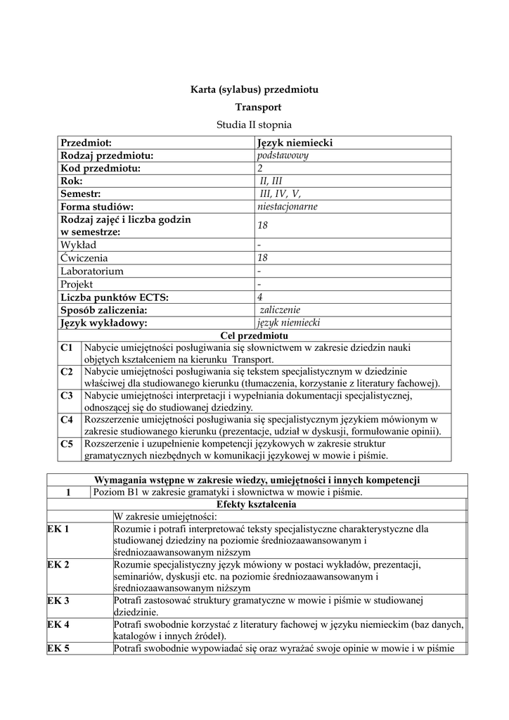 Karta (sylabus) przedmiotu Transport Studia II stopnia Przedmiot: Rodzaj przedmiotu: Kod przedmiotu: Rok: Semestr: Forma studiów: Rodzaj zajęć i liczba godzin w semestrze: Wykład Ćwiczenia Laboratorium Projekt Liczba punktów ECTS: Sposób zaliczenia: Język wykładowy: C1 C2 C3 C4 C5 1 EK 1 EK 2 EK 3 EK 4 EK 5 Język niemiecki podstawowy 2 II, III III, IV, V, niestacjonarne 18 18 4 zaliczenie język niemiecki Cel przedmiotu Nabycie umiejętności posługiwania się słownictwem w zakresie dziedzin nauki objętych kształceniem na kierunku Transport. Nabycie umiejętności posługiwania się tekstem specjalistycznym w dziedzinie właściwej dla studiowanego kierunku (tłumaczenia, korzystanie z literatury fachowej). Nabycie umiejętności interpretacji i wypełniania dokumentacji specjalistycznej, odnoszącej się do studiowanej dziedziny. Rozszerzenie umiejętności posługiwania się specjalistycznym językiem mówionym w zakresie studiowanego kierunku (prezentacje, udział w dyskusji, formułowanie opinii). Rozszerzenie i uzupełnienie kompetencji językowych w zakresie struktur gramatycznych niezbędnych w komunikacji językowej w mowie i piśmie. Wymagania wstępne w zakresie wiedzy, umiejętności i innych kompetencji Poziom B1 w zakresie gramatyki i słownictwa w mowie i piśmie. Efekty kształcenia W zakresie umiejętności: Rozumie i potrafi interpretować teksty specjalistyczne charakterystyczne dla studiowanej dziedziny na poziomie średniozaawansowanym i średniozaawansowanym niższym Rozumie specjalistyczny język mówiony w postaci wykładów, prezentacji, seminariów, dyskusji etc. na poziomie średniozaawansowanym i średniozaawansowanym niższym Potrafi zastosować struktury gramatyczne w mowie i piśmie w studiowanej dziedzinie. Potrafi swobodnie korzystać z literatury fachowej w języku niemieckim (baz danych, katalogów i innych źródeł). Potrafi swobodnie wypowiadać się oraz wyrażać swoje opinie w mowie i w piśmie na tematy objęte zakresem studiów. W zakresie kompetencji społecznych: Posiada umiejętności pracy samodzielnej i w zespole ( praca w parach, grupach). Potrafi samodzielnie posługiwać się językiem niemieckim w obszarze studiowanej dziedziny. EK 6 EK 7 Treści programowe przedmiotu Forma zajęć – ćwiczenia I, semestr III Ćw. 1 Budowa sieci kolejowej. Ćw. 2 Eurotunel. Ćw. 3 Budowa najdłuższego tunelu kolejowego w Europie. Ćw.4 Słynne pociągi pasażerskie. Ćw. 5 Transport lotniczy. Ćw. 6 Główne problemy w transporcie lotniczym. Ćw. 7 Transport morski. Ćw. 8 Transport a ochrona środowiska. Forma zajęć – ćwiczenia II, semestr IV Ćw.10 Mercedes A-Klasse. Słownictwo. Ćwiczenia gramatyczne. Ćw.11 Mercedes A-Klasse. Czytanka Ćw.12 Środki transportu publicznego. Ćw.13 Transport drogowy. Ćw.14 Prawo jazdy- słownictwo. Strona bierna z modalnymi. Ćw.15 Drogi płatne i autostrady. Ćw.16 Bezpieczeństwo na autostradach. Ćw.17 Sieć drogowa w Europie. Metody dydaktyczne 1 2 3 Konwersatoria. Translatoria. Prezentacje. Obciążenie pracą studenta Forma aktywności Godziny kontaktowe z wykładowcą, w tym: udział w wykładach, udział w ćwiczeniach, Praca własna studenta, w tym: przygotowanie do ćwiczeń w oparciu o literaturę przedmiotu konsultacje i przygotowanie do zaliczenia Łączny czas pracy studenta Sumaryczna liczba punktów ECTS dla przedmiotu: Liczba punktów ECTS w ramach zajęć o charakterze praktycznym (ćwiczenia, laboratoria, projekty) 1 2 3 4 5 6 Literatura podstawowa Mit Beruf auf Deutsch , profil mechaniczny I górniczo – hutniczy, nowa era 2012 Studio d A2 lub B1, Funk, Kuhn, Demme, Cornelsen 2005 Literatura uzupełniająca Orientierung im Beruf A2 Langenscheidt KG 2008 Wirtschaftskommunikation Deutsch – Materialien, Langenscheidt KG 2008 Deutsch für Techniker, Berlin A2/B1 Wybrane strony internetowe Macierz efektów kształcenia Efekt kształcenia EK 1 EK 2 EK 3 EK 4 Odniesienie danego efektu kształcenia do efektów zdefiniowanych dla całego programu (PEK) MT1A_U01 MT1A_U02 MT1A_U04 MT1A_U05 MT1A_U02 MT1A_U03 MT1A_U04 MT1A_U05 MT1A_U01 MT1A_U02 MT1A_U05 MT1A_U03 MT1A_U01 MT1A_U02 MT1A_U03 Cele przedmiotu Treści programowe Metody dydaktyczne C1, C2, C3, C5 Ćw. 1-18 1,2,3 C1,C2,C3, C4, C5 Ćw. 1-18 1,2,3 C2, C3, C4,C5 Ćw. 1-18 1,2,3 C1, C2, C3, C4,C5 Ćw. 1-18 1,2,3 EK 5 EK 6 EK 7 MT1A_U04 MT1A_U05 MT1A_U01 MT1A_U02 MT1A_U05 MT1A_U06 MT1A_K01 MT1A_K02 MT1A_K05 MT1A_K06 MT1A_K01 MT1A_K02 MT1A_K05 MT1A_K06 C1, C2, C3 C4,C5 Ćw. 1-18 1,2,3 C1, C2, C3, C4, C5 Ćw. 1-18 1,2,3 C1, C2, C3, C4, C5 Ćw. 1-18 1,2,3 Metody i kryteria oceny Symbol metody Opis metody oceny oceny Ocena bieżąca O1 Kolokwium sprawdzające O2 Zaliczenie semestru O3 Autor programu: mgr Andrzej Nikitiuk [email protected] Adres e-mail: Jednostka Studium Języków Obcych organizacyjna: Próg zaliczeniow y 50% 60%