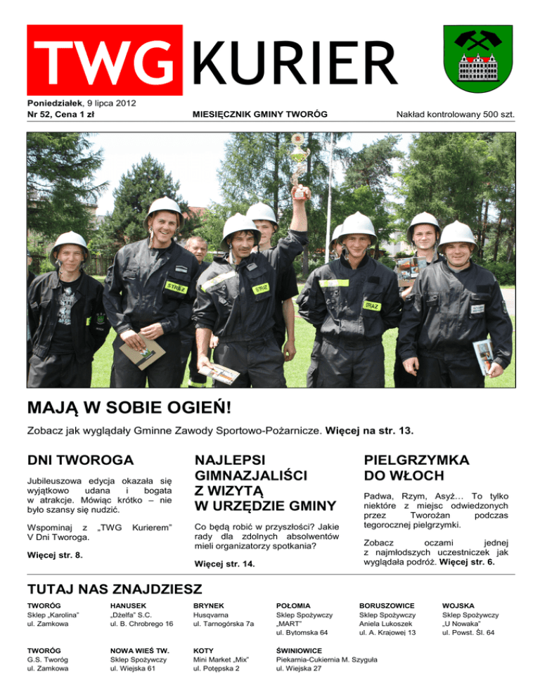 TWG KURIER Poniedziałek, 9 lipca 2012 Nr 52, Cena 1 zł MIESIĘCZNIK GMINY TWORÓG Nakład kontrolowany 500 szt. MAJĄ W SOBIE OGIEŃ! Zobacz jak wyglądały Gminne Zawody Sportowo-Pożarnicze. Więcej na str. 13. DNI TWOROGA Jubileuszowa edycja okazała się wyjątkowo udana i bogata w atrakcje. Mówiąc krótko – nie było szansy się nudzić. Wspominaj z „TWG V Dni Tworoga. Kurierem” NAJLEPSI GIMNAZJALIŚCI Z WIZYTĄ W URZĘDZIE GMINY Co będą robić w przyszłości? Jakie rady dla zdolnych absolwentów mieli organizatorzy spotkania? Więcej str. 8. Więcej str. 14. PIELGRZYMKA DO WŁOCH Padwa, Rzym, AsyżE To tylko niektóre z miejsc odwiedzonych przez Tworożan podczas tegorocznej pielgrzymki. Zobacz oczami jednej z najmłodszych uczestniczek jak wyglądała podróż. Więcej str. 6. TUTAJ NAS ZNAJDZIESZ TWORÓG Sklep „Karolina” ul. Zamkowa HANUSEK „Dżelfa” S.C. ul. B. Chrobrego 16 BRYNEK Husqvarna ul. Tarnogórska 7a POŁOMIA Sklep Spożywczy „MART” ul. Bytomska 64 BORUSZOWICE Sklep Spożywczy Aniela Lukoszek ul. A. Krajowej 13 TWORÓG G.S. Tworóg ul. Zamkowa NOWA WIEŚ TW. Sklep Spożywczy ul. Wiejska 61 KOTY Mini Market „Mix” ul. Potępska 2 ŚWINIOWICE Piekarnia-Cukiernia M. Szyguła ul. Wiejska 27 WOJSKA Sklep Spożywczy „U Nowaka” ul. Powst. Śl. 64 TWG KURIER WSTĘPNIAK OD REDAKCJI SPIS TREŚCI DRODZY MIESZKAŃCY, TABLICA777777777777777777....str.3 SESJA77777777777777777777.str.4 - Niezbędnik Mieszkańca Gminy - Sesja absolutoryjna PRAWNIK777777777777.777777..str.5 - Odpowiedzialność spółki cywilnej - Dotacja na budowę przydomowej oczyszczalni ścieków - Datki mieszkaniowe - Nadzwyczajna sesja HOBBYSTA777777777777.77777..str.6 - W krainie mozzarelli i pomidorów POD LUPĄ77777777777777777.7str.7 - Szlakiem procesji KULTURALNIE777777777777777.7str.8 - Bez szans na nudę, czyli V dni Tworoga - Finał Mini Euro - Przegląd radosnej piosenki - Gdzie sokół ma gniazdo - Brynkowska kopalnia talentów - Dzień Języków Obcych - Chemia w butelkach - Wizyta sąsiadów z Toszka - Pieniądze dla GOK-u - Festyn w Kotach NA BIEŻĄCO7777777777777.777.str.13 - 998, czyli ratujemy i uczymy ratować z OSP w Tworogu - Aktywizując bezrobotnych - Wakacje na „Brzeźnicy” - Coś się kończy, coś zaczyna - „Gdy śmieje się dziecko, śmieje się cały świat” - Wizyta na stadionie Piasta Gliwice - Tworóg w Warszawie - Działki budowlane na sprzedaż - Strażackie zmagania - Zebranie wiejskie – wybór sołtysa i rady sołeckiej Z przyjemnością oddajemy w Wasze ręce odmienionego, kolorowego „TWG Kuriera”. Mamy nadzieję, że nowa okładka spodoba się, a 52 numer miesięcznika stanie się początkiem nowego etapu w naszej działalności. W wakacyjnym numerze wspominamy czerwcowe wydarzenia w gminie. Pokazujemy ołtarze Bożego Ciała, które z wielkim zaangażowaniem przygotowywali mieszkańcy. Przypominamy jak wyglądały V Dni Tworoga, towarzyszymy podczas zawodów strażackich i żegnamy się ze szkołą razem z najlepszymi absolwentami Gimnazjum w Brynku. Piszemy również o ostatniej sesji Rady Gminy, na której udzielono wójtowi absolutorium z tytułu wykonania budżetu za rok 2011. Zobacz jak wyglądają gminne wydatki, dochody i inwestycje. Z kolei amatorzy wodnych szaleństw znajda porady jak bezpiecznie korzystać z letnich atrakcji i jak reagować w sytuacji zagrożenia. Zapraszamy do lektury! www.twg-kurier.pl [email protected] REDAKCJA Marta Kobędza-Krain – redaktor naczelna (wz.) Grażyna Chmiel – redaktor kulturalny Łukasz Frączek – redaktor prawny Ewa Jaruszowic – redaktor terenowy Paulina Kobędza-Sito – korekta KREACJA Łukasz Krain – dyrektor kreatywny MECENAT Grażyna Chmiel – dyrektor Gminnego Ośrodka Kultury GOŚCINNIE Monika Kobędza, Magdalena Michalska, Hanna Pawełczyk, Błażej Śliwiński, Elżbieta Zawartka, Monika Ziob WYDAWCA Gminny Ośrodek Kultury w Tworogu, ul. Zamkowa 1, 42-690 Tworóg, tel. (32) 285 74 92 DRUK Fischer POLIGRAFIA Redakcja zastrzega sobie prawo do redagowania i skracania tekstów przesyłanych do druku. 2 TWG KURIER TABLICA Być może to błahe przykłady. W ostatnim czasie coraz częściej i głośniej słychać o poważniejszych sprawach. Przybywa roszczeń z tytułu odpowiedzialności cywilnej. Przybywa też specjalistów od „skórek od banana” – nie tylko prawników, którzy skutecznie egzekwują coraz wyższe odszkodowania i zadośćuczynienia od winnych zaistniałych szkód majątkowych lub osobowych. W szkodach osobowych są to kwoty na poziomie kilkudziesięciu tysięcy złotych lub wyższych. Może warto rozważyć celowość wydatku kilkudziesięciu złotych za rok dla ochrony całej rodziny od trudnych do przewidzenia skutków zdarzeń, które w naszym mniemaniu nie mogą nam się przytrafić. Przyszłości jednak nie znamy, dlatego warto pamiętać, że ubezpieczenie odpowiedzialności cywilnej w życiu prywatnym chroni nas od szkód wyrządzonych nieumyślnie jak też w skutek rażącego niedbalstwa. Zapraszamy do rozmowy o szczegółach. Zespół AGEUS OC W ŻYCIU PRYWATNYM Kodeks cywilny – zbiór przepisów prawa cywilnego, z którymi każdy z nas już się zetknął. Znajdziemy tu artykuł 415, który mówi: „Kto z winy swej wyrządził drugiemu szkodę, obowiązany jest do jej naprawienia”. OC czyli odpowiedzialność cywilna. Najczęściej zawieramy obowiązkowe ubezpieczenia OC: dla samochodu, zawodowe, medyczne, rolne itd. A co z odpowiedzialnością w życiu prywatnym? Co rozumiemy pod pojęciem – życie prywatne? Otóż – są to czynności, które dotyczą aktywności pozazawodowej i pozostają bez związku z wykonywaniem obowiązków służbowych lub z prowadzoną działalnością gospodarczą. Czy zdarzyło nam się znaleźć w sytuacji, w której ktoś nam wyrządził szkodę i „machnęliśmy ręką”, bo nic wielkiego się nie stało? A może my wyrządziliśmy komuś szkodę i musieliśmy się jakoś z poszkodowanym dogadać? 