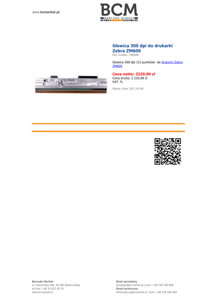 www.bcmarket.pl Głowica 300 dpi do drukarki Zebra ZM600 Part number: 79804M Głowica 300 dpi (12 punktów) do drukarki Zebra ZM600 Cena netto: 2220,99 zł Cena brutto: 2 220,99 zł VAT: % Oferta z dnia: 2017-03-08 Barcode Market ul. Cieszyńska 365, 43-382 Bielsko-Biała tel./fax: +48 33 812 30 79 www.bcmarket.pl Dział sprzedaży [email protected] | kom. +48 726 160 800 Dział techniczny [email protected] | kom. +48 726 160 900
