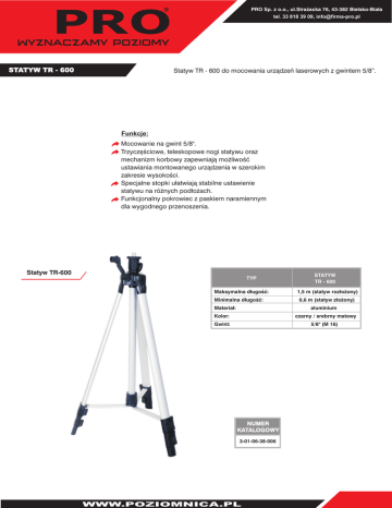PRO Sp. z o.o., ul.Stra¿acka 76, 43-382 Bielsko-Bia³a tel. 33 818 39 09, [email protected] STATYW TR - 600 DALMIERZ LASEROWY DL 70 Statyw TR - 600 do mocowania urz¹dzeñ laserowych z gwintem 5/8”. Funkcje: Mocowanie na gwint 5/8". Trzyczêœciowe, teleskopowe nogi statywu oraz mechanizm korbowy zapewniaj¹ mo¿liwoœæ ustawiania montowanego urz¹dzenia w szerokim zakresie wysokoœci. Specjalne stopki u³atwiaj¹ stabilne ustawienie statywu na ró¿nych pod³o¿ach. Funkcjonalny pokrowiec z paskiem naramiennym dla wygodnego przenoszenia. Statyw TR-600 TYP Maksymalna d³ugoœæ: Minimalna d³ugoœæ: Materia³: STATYW TR - 600 1,5 m (statyw roz³o¿ony) 0,6 m (statyw z³o¿ony) aluminium Kolor: czarny / srebrny matowy Gwint: 5/8" (M 16) NUMER KATALOGOWY 3-01-06-38-006 WWW.POZIOMNICA.PL