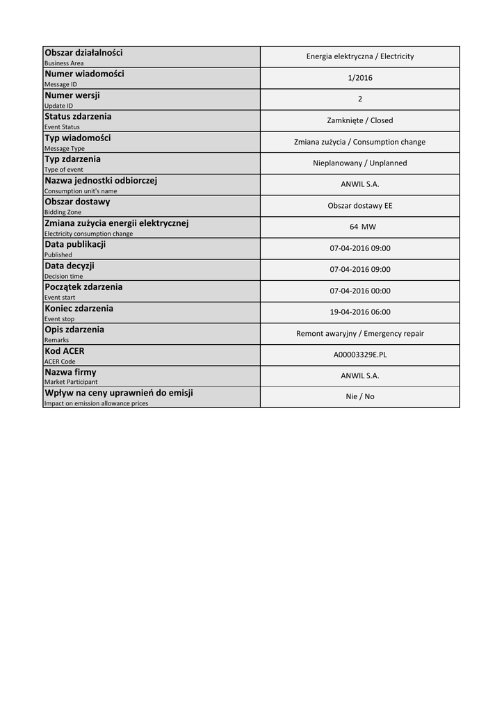 Obszar działalności Business Area Numer wiadomości Message ID Numer wersji Update ID Status zdarzenia Event Status Typ wiadomości Message Type Typ zdarzenia Type of event Nazwa jednostki odbiorczej Consumption unit's name Obszar dostawy Bidding Zone Zmiana zużycia energii elektrycznej Electricity consumption change Data publikacji Published Data decyzji Decision time Początek zdarzenia Event start Koniec zdarzenia Event stop Opis zdarzenia Remarks Kod ACER ACER Code Nazwa firmy Market Participant Wpływ na ceny uprawnień do emisji Impact on emission allowance prices Energia elektryczna / Electricity 1/2016 2 Zamknięte / Closed Zmiana zużycia / Consumption change Nieplanowany / Unplanned ANWIL S.A. Obszar dostawy EE 64 MW 07-04-2016 09:00 07-04-2016 09:00 07-04-2016 00:00 19-04-2016 06:00 Remont awaryjny / Emergency repair A00003329E.PL ANWIL S.A. Nie / No