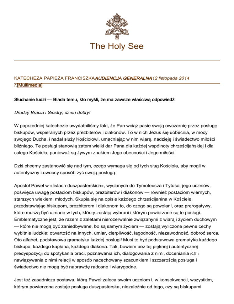 The Holy See KATECHEZA PAPIEŻA FRANCISZKAAUDIENCJA GENERALNA12 listopada 2014 r.[Multimedia] Słuchanie ludzi — Biada temu, kto myśli, że ma zawsze właściwą odpowiedź Drodzy Bracia i Siostry, dzień dobry! W poprzedniej katechezie uwydatniliśmy fakt, że Pan wciąż pasie swoją owczarnię przez posługę biskupów, wspieranych przez prezbiterów i diakonów. To w nich Jezus się uobecnia, w mocy swojego Ducha, i nadal służy Kościołowi, umacniając w nim wiarę, nadzieję i świadectwo miłości bliźniego. Te posługi stanowią zatem wielki dar Pana dla każdej wspólnoty chrześcijańskiej i dla całego Kościoła, ponieważ są żywym znakiem Jego obecności i Jego miłości. Dziś chcemy zastanowić się nad tym, czego wymaga się od tych sług Kościoła, aby mogli w autentyczny i owocny sposób żyć swoją posługą. Apostoł Paweł w «listach duszpasterskich», wysłanych do Tymoteusza i Tytusa, jego uczniów, poświęca uwagę postaciom biskupów, prezbiterów i diakonów — również postaciom wiernych, starszych wiekiem, młodych. Skupia się na opisie każdego chrześcijanina w Kościele, przedstawiając biskupom, prezbiterom i diakonom to, do czego są powołani, oraz prerogatywy, które muszą być uznane w tych, którzy zostają wybrani i którym powierzane są te posługi. Emblematyczne jest, że razem z zaletami nierozerwalnie związanymi z wiarą i życiem duchowym — które nie mogą być zaniedbywane, bo są samym życiem — zostają wyliczone pewne cechy wybitnie ludzkie: otwartość na innych, umiar, cierpliwość, łagodność, niezawodność, dobroć serca. Oto alfabet, podstawowa gramatyka każdej posługi! Musi to być podstawowa gramatyka każdego biskupa, każdego kapłana, każdego diakona. Tak, bowiem bez tej pięknej i autentycznej predyspozycji do spotykania braci, poznawania ich, dialogowania z nimi, doceniania ich i nawiązywania z nimi relacji w sposób nacechowany szacunkiem i szczerością posługa i świadectwo nie mogą być naprawdę radosne i wiarygodne. Jest też zasadnicza postawa, którą Paweł zaleca swoim uczniom i, w konsekwencji, wszystkim, którym powierzona zostaje posługa duszpasterska, niezależnie od tego, czy są biskupami, 2 kapłanami czy diakonami. Apostoł wzywa do nieustannego odnawiania daru, który otrzymali (por. 1 Tm 4, 14; 2 Tm 1, 6). Znaczy to, że zawsze musi być żywa świadomość, iż ci, którzy są biskupami, kapłanami lub diakonami, są nimi nie dlatego, że są bardziej inteligentni, zdolniejsi i lepsi od innych, ale na mocy daru — daru miłości danego przez Boga, w mocy Jego Ducha, dla dobra Jego ludu. Ta świadomość jest naprawdę ważna i jest łaską, o którą należy prosić codziennie! Bowiem pasterz, świadomy tego, że jego posługa wynika wyłącznie z miłosierdzia i z serca Boga, nigdy nie będzie przyjmował postawy autorytarnej, jakby wszyscy byli u jego stóp, a wspólnota była jego własnością, jego osobistym królestwem. Świadomość, że wszystko jest darem, wszystko jest łaską, pomaga pasterzowi również oprzeć się pokusie stawiania siebie w centrum uwagi i polegania tylko na sobie. Są to pokusy próżności, dumy, wystarczalności, pychy. Biada biskupowi, kapłanowi czy diakonowi, którzy by myśleli, że wszystko wiedzą, że mają zawsze właściwą odpowiedź na wszystko i nie potrzebują nikogo. Przeciwnie, świadomość, że on sam jest przedmiotem miłosierdzia i współczucia Boga, powinna skłaniać sługę Kościoła do tego, by był zawsze pokorny i wyrozumiały w stosunku do innych. Ze świadomością, że jest powołany do odważnego strzeżenia depozytu wiary (por. 1 Tm 6, 20), będzie on jednak nastawiony na słuchanie ludzi. Zdaje sobie bowiem sprawę z tego, że zawsze jest coś, czego może się nauczyć, również od tych, którzy mogą być jeszcze daleko od wiary i od Kościoła. Wszystko to musi prowadzić do przyjęcia w stosunku do własnych współbraci nowej postawy, którą cechuje dzielenie się, współodpowiedzialność i jedność. Drodzy przyjaciele, musimy być zawsze wdzięczni Panu, ponieważ w osobach i w posłudze biskupów, kapłanów i diakonów dalej prowadzi i kształtuje swój Kościół, sprawiając, że wzrasta na drodze świętości. Jednocześnie musimy wciąż się modlić, aby pasterze naszych wspólnot byli żywym obrazem komunii i miłości Boga. Apel w sprawie prześladowanych chrześcijanin Z wielkim niepokojem śledzę dramatyczne wydarzenia dotyczące chrześcijan, którzy w różnych częściach świata są prześladowani i zabijani z powodu swojej wiary religijnej. Czuję potrzebę wyrażenia głębokiej bliskości duchowej wspólnotom chrześcijańskim, ciężko doświadczonym przez absurdalną przemoc, która nie ustaje, a pasterzy i wszystkich wiernych zachęcam, by byli silni i żywili niezłomną nadzieję. Jeszcze raz kieruję pełen bólu apel do tych, na których spoczywa polityczna odpowiedzialność na poziomie lokalnym i międzynarodowym, a także do wszystkich osób dobrej woli o szeroko zakrojoną mobilizację sumień na rzecz prześladowanych chrześcijan. Mają oni prawo do tego, by odzyskać w swoich krajach bezpieczeństwo i spokój, wyznając naszą wiarę w wolności. A teraz zachęcam was do odmówienia Ojcze nasz w intencji wszystkich chrześcijan prześladowanych za to, że są chrześcijanami. Do Polaków: 3 Pozdrawiam pielgrzymów polskich. Dzisiaj przypada 25-lecie kanonizacji Brata Alberta — Adama Chmielowskiego. Św. Jan Paweł ii nazwał go «Patronem trudnego przełomu w waszej Ojczyźnie i w Europie». Uczmy się od niego wdrażania w życie miłości miłosiernej wobec najbardziej potrzebujących, niesienia pomocy tym, którzy noszą w sobie obraz Chrystusa — Ecce Homo. Niech dewiza życiowa Brata Alberta: «Być dobrym jak chleb», owocuje w naszym codziennym życiu, w naszej trosce o braci. Z serca wam błogosławię. © Copyright - Libreria Editrice Vaticana