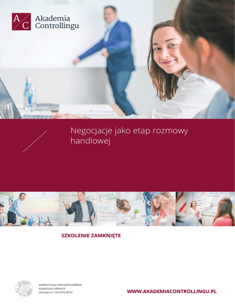 Negocjacje jako etap rozmowy handlowej SZKOLENIE ZAMKNIĘTE AKREDYTACJA WIELKOPOLSKIEGO KURATORA OŚWIATY (Decyzja nr 110.2.870.2015) WWW.AKADEMIACONTROLLINGU.PL Learning by Design Negocjacje jako etap rozmowy handlowej KONTAKT Marta Elimer [email protected] Tel. + 48 61 852 33 53 Fax. + 48 61 666 03 63 TRENERZY dr Paweł Błaszkiewicz Opis szkolenia Dlaczego warto Szkolenie w całości prowadzone jest w formie warsztatowej. Wiedza przekazywana jest na bieżąco w trakcie omawiania doświadczeń. Każde ćwiczenie łączy się z treningiem praktycznych umiejętności negocjowania. Treści szkolenia uzupełniają przykłady z życia, fragmenty filmów oraz testy psychologiczne. Po zakończeniu szkolenia (ok. 3 miesiące) zalecany jest kontakt z trenerem w celu omówienia przełożenia szklenia na rzeczywiste sytuacje (5 godzinne spotkanie). Cele szkolenia - Budowanie i wzmacnianie własnej pozycji w negocjacjach. - Poszerzenie języka perswazji i skutecznego przekonywania. - Przegląd narzędzi i strategii negocjacyjnych. - Poprawa kompetencji w zakresie sprawowania kontroli nad rozmową negocjacyjną. - Doskonalenie umiejętności osobistych (autoprezentacja, asertywność, stanowczość, odporność na stres). - Opracowanie banku przydatnych zwrotów na potrzeby trudnych negocjacji. - Rozpoznanie strategii manipulacji, unikanie ryzykownych decyzji. - Pokonanie oporu przed użyciem metody negocjacyjnej. - Analiza rzeczywistych sytuacji negocjacyjnych. Program NEGOCJACJE JAKO ETAP ROZMOWY HANDLOWEJ: 1. Nawiązanie relacji handlowej.2. Umiejętne otwarcie rozmowy – siła pierwszego Akademia Controllingu Sp. z o.o. ul. Towarowa 35/403A 61-896 Poznań [email protected] www.akademiacontrollingu.pl Tel.: 61 852 33 53 NIP: 7811817052 REGON: 302844320 KRS: 0000526759; Sąd rejonowy w Poznaniu, VII Wydział Gospodarczy KRS, kapitał zakładowy 100 000 PLN 2 2/4 Learning by Design wrażenia.3. Miejsce negocjacji we współpracy z dostawcą.4. Rozpoznanie siły negocjacyjnej potencjalnego partnera.5. Ustalanie stanowisk w procesie obsługi klienta.6. Po co wspólne porozumienie? Cel i istota negocjacji.7. Wartość informacji – sposoby i przyczyny ich pozyskiwania.8. Cele krótko i długoterminowe w relacjach klient – dostawca.9. Pozyskanie lojalności i zaufania w kontaktach handlowych.10. Fakty i mity na temat negocjacji handlowych. PODSTAWOWE POJĘCIA W NEGOCJACJACH W BIZNESIE: 1. Kluczowe rozróżnienie: interesy i stanowiska negocjatorów.2. Zakres możliwego porozumienia, kiedy sukcesem jest zerwanie rozmów.3. Pozycja otwarcia, linia oparcia i dolna linia.4. Zbijanie obiekcji klienta (analiza obiekcji i możliwości zbijania ceny).5. Model BATNA.6. Metody przezwyciężania dysproporcji sił.7. Kryteria oceny wyniku negocjacji. KOMUNIKACJA W NEGOCJACJACH: 1. Najczęstsze problemy komunikacyjne w negocjacjach.2. Wizerunek negocjatora.3. Zdobywanie informacji przy stole/ przez telefon.4. Sposób prezentacji oferty.5. Budowanie wartości dla drugiej strony.6. Podsumowania czyli „przewijanie taśmy”.7. Sposób wyrażania krytyki ofert partnera.8. Trening zachowań asertywnych w negocjacjach.9. Aktywne słuchanie, zadawanie trafnych pytań, parafrazowanie, przeramowanie definicji sytuacji.10. Jak radzić sobie z niepoprawną komunikacją (emocje, litość, manipulacja, blef, agresja)?11. Twój indywidualny styl komunikacji: wady i zalety w negocjacjach. WYBÓR STYLU NEGOCJACYJNEGO: 1. Negocjacje jako strategia rozwiązania problemu.2. Indywidualny styl negocjacyjny.3. Style: miękki, twardy, rzeczowy, taktyka negocjacji etycznych.4. Style negocjacji: dominacja, dostosowanie się, unikanie, kompromis, postawa win-win w negocjacjach.5. Zastosowanie stylu w praktyce: egzekwowanie warunków umowy, stawianie granic, kierowanie rozmowy na możliwości współpracy zamiast na zwalczanie stanowisk, rozmowa o rekompensacie, reklamacja. PRZEBIEG SKUTECZNYCH NEGOCJACJI: 1. Główne fazy negocjacji.2. Wpływ osoby, miejsca i czasu spotkania na przebieg negocjacji.3. Sposoby określania obszarów negocjacyjnych.4. Przygotowania do spotkania negocjacyjnego / rozmowy negocjacyjnej.5. Wyznaczania celu głównego i celów pośrednich.6. Plan spotkania negocjacyjnego.7. Typowe gry negocjacyjne.8. Rozszerzanie wspólnych możliwości poprzez opcje.9. Strategie wychodzenia z impasu.10. Jak ustępować aby nie stracić.11. Finalizacja negocjacji. ZASADY SKUTECZNEGO NEGOCJATORA: 1. Pierwsze 5 minut.2. BATNA indywidualna.3. Rozpoznanie potrzeb klienta.4. Rozumienie emocji i potrzeb, procesów mentalnych.5. Argumenty i asertywność.6. Mocne i słabe strony negocjatora.7. Autodiagnoza i zaplanowanie działań indywidualnych.8. Plan doskonalenia umiejętności negocjacyjnych w praktyce. Sylwetka trenera Dr Paweł Błaszkiewicz KONSULTANT, PRAKTYK ZARZĄDZANIA ZASOBAMI LUDZKIMI. DOKTOR NAUK HUMANISTYCZNYCH W ZAKRESIE PSYCHOLOGII. W PRACY DOKTORSKIEJ ZAJMOWAŁ SIĘ PROBLEMATYKĄ MOTYWACJI DO PRACY POD KIERUNKIEM PROF. JANUSZA CZAPIŃSKIEGO. ABSOLWENT UNIWERSYTETU MIKOŁAJA KOPERNIKA. UKOŃCZYŁ SOCJOLOGIĘ, PODYPLOMOWE STUDIA Z DORADZTWA PERSONALNEGO ORAZ STUDIUM MENEDŻERÓW PERSONALNYCH W GDAŃSKU. Akademia Controllingu Sp. z o.o. ul. Towarowa 35/403A 61-896 Poznań [email protected] www.akademiacontrollingu.pl Tel.: 61 852 33 53 NIP: 7811817052 REGON: 302844320 KRS: 0000526759; Sąd rejonowy w Poznaniu, VII Wydział Gospodarczy KRS, kapitał zakładowy 100 000 PLN 3 3/4 Learning by Design WYKŁADOWCA NA STUDIACH PODYPLOMOWYCH Z ZARZĄDZANIA ZASOBAMI LUDZKIMI NA POLITECHNICE GDAŃSKIEJ, WYŻSZEJ SZKOLE ZARZĄDZANIA W GDAŃSKU ORAZ WYŻSZEJ SZKOLE BANKOWEJ. Zanim rozpoczął pracę jako trener-konsultant, zdobył doświadczenie w pracy w działach personalnych dużych firm produkcyjnych: Philips Consumer Electronics Industries w Kwidzynie oraz Flextronics International w Tczewie. Uczestniczył w transferze najlepszych metod zarządzania zasobami ludzkimi na grunt polskiego przedsiębiorstwa (zarządzanie kompeten