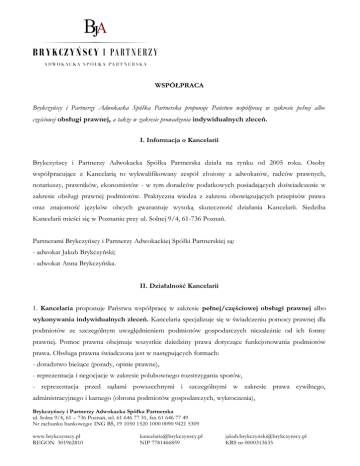 WSPÓŁPRACA Brykczyńscy i Partnerzy Adwokacka Spółka Partnerska proponuje Państwu współpracę w zakresie pełnej albo częściowej obsługi prawnej, a także w zakresie prowadzenia indywidualnych zleceń. I. Informacja o Kancelarii Brykczyńscy i Partnerzy Adwokacka Spółka Partnerska działa na rynku od 2005 roku. Osoby współpracujące z Kancelarią to wykwalifikowany zespół złożony z adwokatów, radców prawnych, notariuszy, prawników, ekonomistów - w tym doradców podatkowych posiadających doświadczenie w zakresie obsługi prawnej podmiotów. Praktyczna wiedza z zakresu obowiązujących przepisów prawa oraz znajomość języków obcych gwarantuje wysoką skuteczność działania Kancelarii. Siedziba Kancelarii mieści się w Poznaniu przy ul. Solnej 9/4, 61-736 Poznań. Partnerami Brykczyńscy i Partnerzy Adwokackiej Spółki Partnerskiej są: - adwokat Jakub Brykczyński; - adwokat Anna Brykczyńska. II. Działalność Kancelarii 1. Kancelaria proponuje Państwu współpracę w zakresie pełnej/częściowej obsługi prawnej albo wykonywania indywidualnych zleceń. Kancelaria specjalizuje się w świadczeniu pomocy prawnej dla podmiotów ze szczególnym uwzględnieniem podmiotów gospodarczych niezależnie od ich formy prawnej. Pomoc prawna obejmuje wszystkie dziedziny prawa dotyczące funkcjonowania podmiotów prawa. Obsługa prawna świadczona jest w następujących formach: - doradztwo bieżące (porady, opinie prawne), - reprezentacja i negocjacje w zakresie polubownego rozstrzygania sporów, - reprezentacja przed sądami powszechnymi i szczególnymi w zakresie prawa cywilnego, administracyjnego i karnego (obrona podmiotów gospodarczych, wykroczenia), Brykczyńscy i Partnerzy Adwokacka Spółka Partnerska ul. Solna 9/4, 61 – 736 Poznań, tel. 61 646 77 31, fax 61 646 77 49 Nr rachunku bankowego: ING BŚ, 19 1050 1520 1000 0090 9421 5309 www.brykczynscy.pl REGON 301962810 [email protected] NIP 7781466859 [email protected] KRS nr 0000313635 - reprezentacja przed urzędami i instytucjami państwowymi w zakresie prawa administracyjnego, - przygotowywanie wszystkich typów umów, uczestnictwo w negocjowaniu umów oraz ocena istniejących umów, - reprezentacja w sprawach windykacyjnych i egzekucyjnych, pomoc w procesie zbywania, nabywania oraz łączenia wszelkich ekonomicznych jednostek istniejących w Polsce, włącznie z przygotowywaniem porozumień i pomocą w negocjacjach, - prowadzenie wszelkich negocjacji i zawieranie porozumień w imieniu lub na rzecz klienta, - doradztwo prawne i wsparcie w ubieganiu się o uzyskanie koncesji, licencji i innych zezwoleń wymaganych przez przepisy prawne; przygotowywanie wniosków do Ministrów i innych organów, - prowadzenie dokumentacji prawnej, - wykonywanie czynności w terenie na każde wezwanie klienta, - sporządzanie ekspertyz audytorskich w zakresie działalności gospodarczej, - działalność prawna na terenie UE. W ramach współpracy z przedsiębiorstwami przeprowadzane są również szkolenia z poszczególnych dziedzin prawa, zarówno dla kadry zarządzającej jak i dla pracowników. 2. Prawnicy współpracujący z Kancelarią specjalizują się w tematyce: - szeroko rozumianego prawa cywilnego, (Kancelaria prowadzi wiele procesów odszkodowawczych), - prawa gospodarczego, w tym prawa karnego – gospodarczego, - prawa spółek handlowych, - prawa rejestrowego. Kancelaria zajmuje się także obsługą prawną podmiotów leczniczych (Kancelaria obsługuje niepubliczne zakłady opieki zdrowotnej w Wielkopolsce) oraz prowadzeniem spraw dotyczących błędów w sztuce lekarskiej oraz reprezentowaniem podmiotów leczniczych w postępowaniach przed Narodowym Funduszem Zdrowia. Brykczyńscy i Partnerzy Adwokacka Spółka Partnerska ul. Solna 9/4, 61 – 736 Poznań, tel. 61 646 77 31, fax 61 646 77 49 Nr rachunku bankowego: ING BŚ, 19 1050 1520 1000 0090 9421 5309 www.brykczynscy.pl REGON 301962810 [email protected] NIP 7781466859 [email protected] KRS nr 0000313635 3. Wykonujemy także zlecenia z zakresu: - prawa karnego, - dochodzenia roszczeń ubezpieczeniowych, - prawa obrotu nieruchomościami, - prawa ochrony środowiska (Kancelaria obsługuje Polski Klub Ekologiczny – Okręg Wielkopolski – Koło w Gnieźnie), - prawa spółdzielczego i mieszkaniowego, - prawa własności przemysłowej i ochrony praw autorskich, - prawa antymonopolowego, - prawa pracy – rozumianego także jako tworzenie prawa pracy wewnątrzzakładowego, - prawa upadłościowego i naprawczego, - prawa międzynarodowego i europejskiego. Forma współpracy oraz wynagrodzenie Kancelarii zawsze dostosowane są do wymagań Klienta. Kancelaria świadczy pomoc prawną w języku polskim, angielskim oraz niemieckim. Kancelaria ponosi pełną odpowiedzialność cywilnoprawną za wykonywanie swoich usług. Suma ubezpieczenia od OC przekracza kwotę 1.250.000 zł. Szczegółowe informacje mogą Państwo uzyskać na stronie internetowej Kancelarii: http://www.brykczynscy.pl/ Z poważaniem, Jakub Brykczyński adwokat Anna Brykczyńska adwokat Brykczyńscy i Partnerzy Adwokacka Spółka Partnerska ul. Solna 9/4, 61 – 736 Poznań, tel. 61 646 77 31, fax 61 646 77 49 Nr rachunku bankowego: ING BŚ, 19 1050 1520 1000 0090 9421 5309 www.brykczynscy.pl REGON 301962810 [email protected] NIP 7781466859 [email protected] KRS nr 0000313635