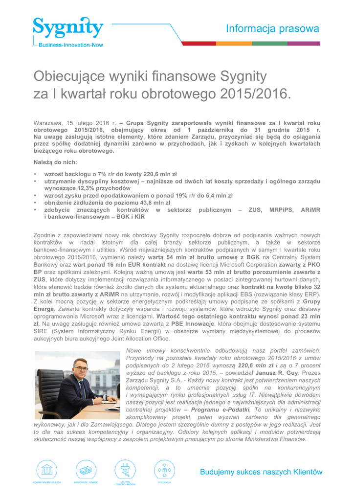 Informacja prasowa Obiecujące wyniki finansowe Sygnity za I kwartał roku obrotowego 2015/2016. Warszawa, 15 lutego 2016 r. – Grupa Sygnity zaraportowała wyniki finansowe za I kwartał roku obrotowego 2015/2016, obejmujący okres od 1 października do 31 grudnia 2015 r. Na uwagę zasługują istotne elementy, które zdaniem Zarządu, przyczyniać się będą do osiągania przez spółkę dodatniej dynamiki zarówno w przychodach, jak i zyskach w kolejnych kwartałach bieżącego roku obrotowego. Należą do nich: • • • • • wzrost backlogu o 7% r/r do kwoty 220,6 mln zł utrzymanie dyscypliny kosztowej – najniższe od dwóch lat koszty sprzedaży i ogólnego zarządu wynoszące 12,3% przychodów wzrost zysku przed opodatkowaniem o ponad 19% r/r do 6,4 mln zł obniżenie zadłużenia do poziomu 43,8 mln zł zdobycie znaczących kontraktów w sektorze publicznym – ZUS, MRPiPS, ARiMR i bankowo-finansowym – BGK i KIR Zgodnie z zapowiedziami nowy rok obrotowy Sygnity rozpoczęło dobrze od podpisania ważnych nowych kontraktów w nadal istotnym dla całej branży sektorze publicznym, a także w sektorze bankowo-finansowym i utilities. Wśród najważniejszych kontraktów podpisanych w samym I kwartale roku obrotowego 2015/2016, wymienić należy wartą 54 mln zł brutto umowę z BGK na Centralny System Bankowy oraz wart ponad 16 mln EUR kontrakt na dostawę licencji Microsoft Corporation zawarty z PKO BP oraz spółkami zależnymi. Kolejną ważną umową jest warte 53 mln zł brutto porozumienie zawarte z ZUS, które dotyczy implementacji rozwiązania informatycznego w postaci zintegrowanej hurtowni danych, która stanowić będzie również źródło danych dla systemu aktuarialnego oraz kontrakt na kwotę blisko 32 mln zł brutto zawarty z ARiMR na utrzymanie, rozwój i modyfikacje aplikacji EBS (rozwiązanie klasy ERP). Z kolei mocną pozycję w sektorze energetycznym podkreślają umowy podpisane ze spółkami z Grupy Energa. Zawarte kontrakty dotyczyły wsparcia i rozwoju systemów, które wdrożyło Sygnity oraz dostawy oprogramowania Microsoft wraz z licencjami. Wartość tego ostatniego kontraktu wynosi ponad 23 mln zł. Na uwagę zasługuje również umowa zawarta z PSE Innowacje, która obejmuje dostosowanie systemu SIRE (System Informatyczny Rynku Energii) w obszarze wymiany międzysystemowej do procesów aukcyjnych biura aukcyjnego Joint Allocation Office. Nowe umowy konsekwentnie odbudowują nasz portfel zamówień. Przychody na pozostałe kwartały roku obrotowego 2015/2016 z umów podpisanych do 2 lutego 2016 wynoszą 220,6 mln zł i są o 7 procent wyższe od backlogu z roku 2015. – powiedział Janusz R. Guy, Prezes Zarządu Sygnity S.A. - Każdy nowy kontrakt jest potwierdzeniem naszych kompetencji, a to umacnia pozycję spółki na konkurencyjnym i wymagającym rynku profesjonalnych usług IT. Niewątpliwie dowodem naszej pozycji jest realizacja jednego z najważniejszych dla administracji centralnej projektów – Programu e-Podatki. To unikalny i niezwykle skomplikowany projekt, pełen wyzwań zarówno dla generalnego wykonawcy, jak i dla Zamawiającego. Dlatego jestem szczególnie dumny z postępów w jego realizacji. Jest to dla nas sukces kompetencyjny i organizacyjny. Odbiory kolejnych aplikacji i modułów potwierdzają skuteczność naszej współpracy z zespołem projektowym pracującym po stronie Ministerstwa Finansów. Budujemy sukces naszych Klientów Informacja prasowa Podpisana w styczniu br. ramowa umowa uzupełniająca o wartości do 80,7 mln zł do systemu e-Podatki świadczy o tym, że jest to ważny projekt dla Zamawiającego i jest cały czas intensywnie rozwijany, a nasza Spółka ma kompetencje jako generalny wykonawca, aby go dalej z sukcesem realizować. – komentuje Prezes Guy. W ostatnim okresie w ramach realizacji projektu e-Podatki Sygnity wdrożyło kolejne funkcjonalności: Portal Podatkowy (grudzień) oraz Kanał Masowy dla Organów Rentowych (styczeń). Obecnie trwają prace nad nowymi elementami programu m.in.: System Informacji Podatkowej w części portalowej (oddanie zaplanowane jest na przełomie lutego i marca), nowe wydanie PFR wzbogacone o PIT-38 i PIT-37 uzupełniony o informacje z organów rentowych poprzez Kanał Masowy dla Organów Rentowych (oddanie zaplanowane na 15 marca) oraz Rejestr Pełnomocnictw Ogólnych (przewidywany termin oddania przypada na lipiec). Sytuacja w sektorze publicznym, który jest najważniejszym źródłem biznesu zarówno dla nas, jak i całej branży IT, nadal jest trudna. Przede wszystkim wciąż nie rozstrzygnięta pozostaje kwestia uruchomienia kolejnej transzy środków unijnych oraz w związku ze zmianą władzy część projektów została wstrzymana lub poddana weryfikacji. Taka sytuacja ma miejsce w przypadku niezwykle istotnego dla Ministerstwa Zdrowia i wszystkich obywateli projektu P1 (e-zdrowie). Sygnity jest jedyną spółką, której nie naliczono kar i dlatego nadal mamy szansę na kontynuację realizacji lub współrealizacji tego projektu w nowej, zmienionej formie. – podsumowuje Prezes Sygnity S.A. WYNIKI 1Q FY 2016. Przychody Grupy Sygnity w I kwartale roku obrotowego 2015/2016 wyniosły 139,8 mln zł (-2,9% r/r). Zysk brutto ze sprzedaży wyniósł 24,6 mln zł (-4,6% r/r), zysk EBITDA 11,1 mln zł (+1,6% r/r), zysk przed opodatkowaniem 6,4 mln zł (+19,4% r/r) a zysk netto 3,4 mln zł (-16,7% r/r). Rentowność EBITDA wyniosła 8,0% (+0,4% r/r), rentowność EBIT wyniosła 4,6% (+0,9% r/r), rentowność netto wyniosła 2,5% (-0,4% r/r) ze względu na wykorzystanie strat podatkowych z lat ubiegłych. Spółka konsekwentnie utrzymuje dyscyplinę kosztową. Koszty ogólnego zarządu w I kwartale roku obrotowego 2015/2016 wyniosły 7,1% przychodów i był to najniższy poziom od wielu kwartałów. Łącznie koszty ogólne (koszty sprzedaży i ogólnego zarządu) wyniosły w tym kwartale 12,3% przychodów i był to najniższy poziom od dwóch lat. Na koniec grudnia