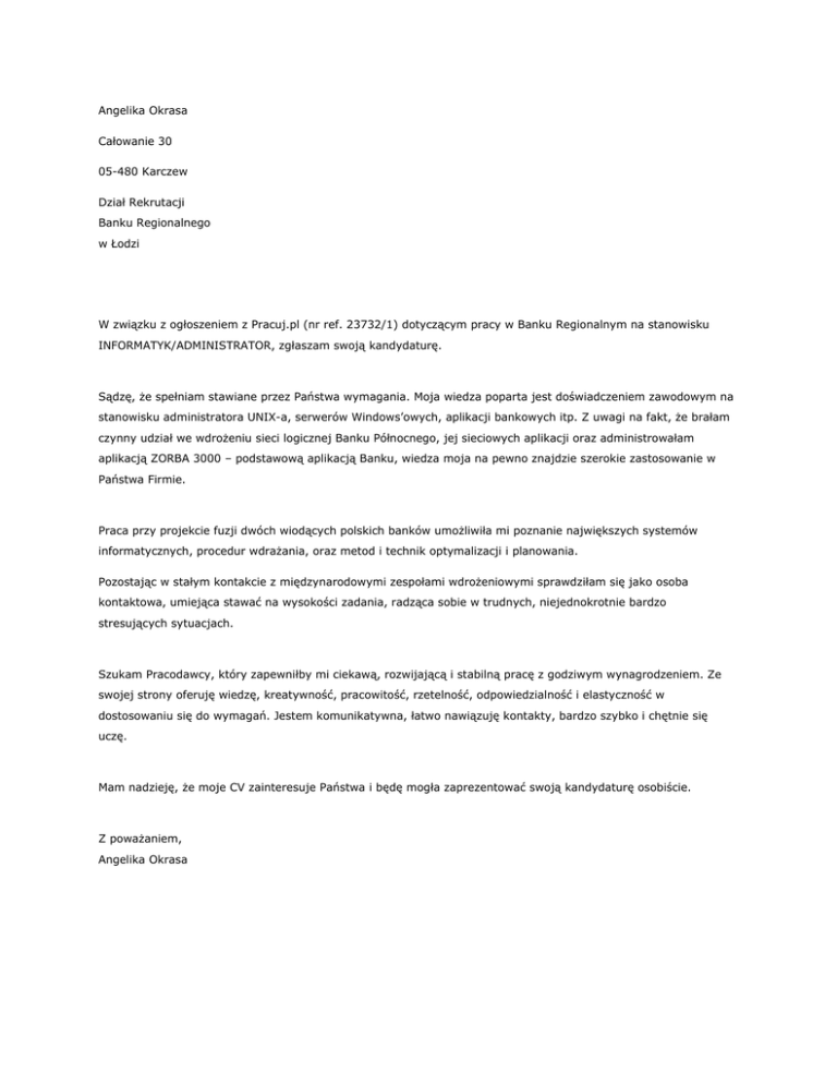 Angelika Okrasa Całowanie 30 05-480 Karczew Dział Rekrutacji Banku Regionalnego w Łodzi W związku z ogłoszeniem z Pracuj.pl (nr ref. 23732/1) dotyczącym pracy w Banku Regionalnym na stanowisku INFORMATYK/ADMINISTRATOR, zgłaszam swoją kandydaturę. Sądzę, że spełniam stawiane przez Państwa wymagania. Moja wiedza poparta jest doświadczeniem zawodowym na stanowisku administratora UNIX-a, serwerów Windows’owych, aplikacji bankowych itp. Z uwagi na fakt, że brałam czynny udział we wdrożeniu sieci logicznej Banku Północnego, jej sieciowych aplikacji oraz administrowałam aplikacją ZORBA 3000 – podstawową aplikacją Banku, wiedza moja na pewno znajdzie szerokie zastosowanie w Państwa Firmie. Praca przy projekcie fuzji dwóch wiodących polskich banków umożliwiła mi poznanie największych systemów informatycznych, procedur wdrażania, oraz metod i technik optymalizacji i planowania. Pozostając w stałym kontakcie z międzynarodowymi zespołami wdrożeniowymi sprawdziłam się jako osoba kontaktowa, umiejąca stawać na wysokości zadania, radząca sobie w trudnych, niejednokrotnie bardzo stresujących sytuacjach. Szukam Pracodawcy, który zapewniłby mi ciekawą, rozwijającą i stabilną pracę z godziwym wynagrodzeniem. Ze swojej strony oferuję wiedzę, kreatywność, pracowitość, rzetelność, odpowiedzialność i elastyczność w dostosowaniu się do wymagań. Jestem komunikatywna, łatwo nawiązuję kontakty, bardzo szybko i chętnie się uczę. Mam nadzieję, że moje CV zainteresuje Państwa i będę mogła zaprezentować swoją kandydaturę osobiście. Z poważaniem, Angelika Okrasa