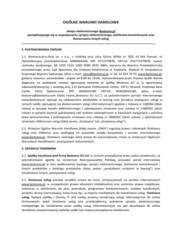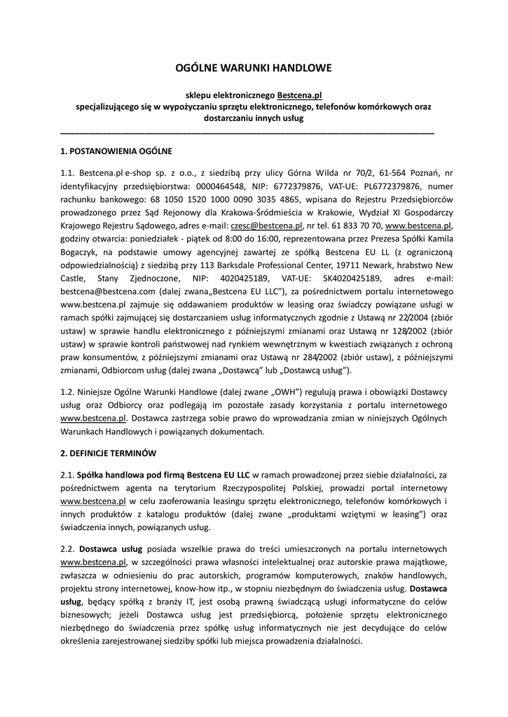 OGÓLNE WARUNKI HANDLOWE sklepu elektronicznego Bestcena.pl specjalizującego się w wypożyczaniu sprzętu elektronicznego, telefonów komórkowych oraz dostarczaniu innych usług ________________________________________________________________________________ 1. POSTANOWIENIA OGÓLNE 1.1. Bestcena.pl e-shop sp. z o.o., z siedzibą przy ulicy Górna Wilda nr 70/2, 61-564 Poznań, nr identyfikacyjny przedsiębiorstwa: 0000464548, NIP: 6772379876, VAT-UE: PL6772379876, numer rachunku bankowego: 68 1050 1520 1000 0090 3035 4865, wpisana do Rejestru Przedsiębiorców prowadzonego przez Sąd Rejonowy dla Krakowa-Śródmieścia w Krakowie, Wydział XI Gospodarczy Krajowego Rejestru Sądowego, adres e-mail: [email protected], nr tel. 61 833 70 70, www.bestcena.pl, godziny otwarcia: poniedziałek - piątek od 8:00 do 16:00, reprezentowana przez Prezesa Spółki Kamila Bogaczyk, na podstawie umowy agencyjnej zawartej ze spółką Bestcena EU LL (z ograniczoną odpowiedzialnością) z siedzibą przy 113 Barksdale Professional Center, 19711 Newark, hrabstwo New Castle, Stany Zjednoczone, NIP: 4020425189, VAT-UE: SK4020425189, adres e-mail: [email protected] (dalej zwana„Bestcena EU LLC”), za pośrednictwem portalu internetowego www.bestcena.pl zajmuje się oddawaniem produktów w leasing oraz świadczy powiązane usługi w ramach spółki zajmującej się dostarczaniem usług informatycznych zgodnie z Ustawą nr 22/2004 (zbiór ustaw) w sprawie handlu elektronicznego z późniejszymi zmianami oraz Ustawą nr 128/2002 (zbiór ustaw) w sprawie kontroli państwowej nad rynkiem wewnętrznym w kwestiach związanych z ochroną praw konsumentów, z późniejszymi zmianami oraz Ustawą nr 284/2002 (zbiór ustaw), z późniejszymi zmianami, Odbiorcom usług (dalej zwana „Dostawcą” lub „Dostawcą usług”). 1.2. Niniejsze Ogólne Warunki Handlowe (dalej zwane „OWH”) regulują prawa i obowiązki Dostawcy usług oraz Odbiorcy oraz podlegają im pozostałe zasady korzystania z portalu internetowego www.bestcena.pl. Dostawca zastrzega sobie prawo do wprowadzania zmian w niniejszych Ogólnych Warunkach Handlowych i powiązanych dokumentach. 2. DEFINICJE TERMINÓW 2.1. Spółka handlowa pod firmą Bestcena EU LLC w ramach prowadzonej przez siebie działalności, za pośrednictwem agenta na terytorium Rzeczypospolitej Polskiej, prowadzi portal internetowy www.bestcena.pl w celu zaoferowania leasingu sprzętu elektronicznego, telefonów komórkowych i innych produktów z katalogu produktów (dalej zwane „produktami wziętymi w leasing”) oraz świadczenia innych, powiązanych usług. 2.2. Dostawca usług posiada wszelkie prawa do treści umieszczonych na portalu internetowych www.bestcena.pl, w szczególności prawa własności intelektualnej oraz autorskie prawa majątkowe, zwłaszcza w odniesieniu do prac autorskich, programów komputerowych, znaków handlowych, projektu strony internetowej, know-how itp., w stopniu niezbędnym do świadczenia usług. Dostawca usług, będący spółką z branży IT, jest osobą prawną świadczącą usługi informatyczne do celów biznesowych; jeżeli Dostawca usług jest przedsiębiorcą, położenie sprzętu elektronicznego niezbędnego do świadczenia przez spółkę usług informatycznych nie jest decydujące do celów określenia zarejestrowanej siedziby spółki lub miejsca prowadzenia działalności. 2.3. Odbiorca usług jest osobą fizyczną posiadającą pełną zdolność do czynności prawnych lub osobą prawną, która za pośrednictwem portalu internetowego www.bestcena.pl korzysta z bezpłatnych, podstawowych usług świadczonych przez Dostawcę lub zamawia płatne usługi oferowane przez Dostawcę i zawiera z nim umowę o leasing produktów i świadczenie powiązanych usług określonych w punkcie 2.6. niniejszych OWH (dalej zwana „Umową”). Przyjmuje się, że Odbiorca jest Odbiorcą niezarejestrowanym, Odbiorcą zarejestrowanym lub Odbiorcą zarejestrowanym z opłaconym dostępem. Odbiorca usług może być konsumentem w rozumieniu art. 2, lit. a) Ustawy nr 250/2007 (zbiór ustaw) o ochronie praw konsumentów, z późniejszymi zmianami, oraz zmianach do Ustawy nr 372/1990 (zbiór ustaw) Rady Narodowej Republiki Słowackiej w sprawie przestępstw, z późniejszymi zmianami, lub przedsiębiorcą w rozumieniu art. 2, pkt. 2 Ustawy nr 513/1991 (zbiór ustaw) Kodeks handlowy, z późniejszymi zmianami. Przed rozpoczęciem korzystania z usług Odbiorca usług jest zobowiązany zapoznać się z treścią OWH oraz wyrazić zgodę na OWH albo w sposób dorozumiany poprzez rozpoczęcie korzystania z usług (włączając w to wszystkie bezpłatne, powszechnie dostępne treści) w przypadku Odbiorców niezarejestrowanych, albo w sposób wyraźny w procesie rejestracji w przypadku Odbiorcy zarejestrowanego. Osoba, która nie wyraża zgody na OWH, ma obowiązek zaprzestać korzystania z usług, włączając w to bezpłatne, powszechnie dostępne treści portalu internetowego www.bestcena.pl. 2.4. Odbiorca usług - konsument, w rozumieniu art. 2, lit. a) Ustawy nr 250/2007 (zbiór ustaw) o ochronie praw konsumentów, z późniejszymi zmianami, oraz zmianach do Ustawy nr 372/1990 (zbiór ustaw) Rady Narodowej Republiki Słowackiej w sprawie przestępstw, z późniejszymi zmianami, to osoba fizyczna lub prawna, która korzysta z usług na użytek osobisty lub na użytek swojego gospodarstwa domowego i w związku z tym w chwili zawierania Umowy nie działa w charakterze przedsiębiorcy zgodnie z art. 2, pkt. 2 Ustawy nr 513/1991 (zbiór ustaw) Kodeks handlowy, z późniejszymi zmianami. 2.5. Odbiorca usług - przedsiębiorca to, zgodnie z art. 2, pkt. 2 Ustawy nr 513/1991 (zbiór ustaw) Kodeks handlowy, osoba zarejestrowana w Rejestrze Przedsiębiorców; osoba, która prowadzi działalność gospodarczą na podstawie zezwolenia na prowadzenie działalności; osoba, która prowadzi działalność na podstawie innej niż zezwolenie zgodnie z odrębnymi przepi
