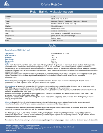 Oferta Rejsów Rejs - Bałtyk - wakacje marzeń Symbol 10LB Termin 26.08.2017 - 02.09.2017 Trasa Gdańsk - Olandia - Karlskrona - Bornholm - Gdańsk Jacht Bavaria Cruiser 45 (2010) - s/y Lady Kapitan Michał Olszewski Opis ceny Cena Bałtyk Duchy Rodzaj rejsu stażowo - szkoleniowy Staż staż morski na stopnie PZŻ, 60-110 godzin Wyżywienie pełne, posiłki przygotowuje załoga Transport Dojazd własny Cena 1 9001 767 PLN Jacht Bavaria Cruiser 45 (2010) s/y Lady Typ jachtu: Bavaria Cruiser 45 (2010) Rok produkcji: 2010 Długość: 14.27 m Szerokość: 4.35 m Zanurzenie: 2.10 m Żagle: 107 m2 Opis: Jacht Bavaria Cruiser 45 to jacht, który niezwykle przypadł nam do gustu już po pierwszych dniach żeglugi. Nie bez powodu jednostka została nominowana do prestiżowej nagrody Yacht of The Year 2011. Tym jachtem pływa się szybko, komfortowo i bezpiecznie. A to trzy najważniejsze cechy dobrego jachtu. Jesteśmy pewni, że również i Wy docenicie emocje, jakie daje żeglująca pod pełnymi żaglami Lady. Wygodne wnętrze z przestronną i jasną mesą oraz komfortowymi kabinami pozwala spokojnie odpocząć w dobrych warunkach. Lady wyposażona jest w komplet nowoczesnych żagli: dużą, rolowaną na sztywnym sztagu genuę oraz rolowanego do masztu grota. System rolowania pozwala na niezwykle łatwe i elastyczne dostosowanie powieżchni żegli do aktualnych warunków atmosferycznych. Silnik: Lady napędzana jest mocnym stacjonarnym silnikiem Volvo Penta o mocy 55 koni mechanicznych. Zbiornik paliwa o pojemności 210 litrów zapewnia około 100 godzin ekonomicznej żeglugi. Wyposażenie: Wyposażenie nawigacyjne: GPS z kolorowym chartplotterem w kokpicie, radar, dziobowy ster strumieniowy, radio VHF DSC, log, sonda, wiatromierz, namiernik, aktualne mapy nawigacyjne, locje i almanachy. Wyposażenie bezpieczeństwa: pneumatyczna tratwa ratunkowa, pirotechnika, automatyczne pneumatyczne kamizelki ratunkowe z szelkami bezpieczeństwa, aldis, tyfon. Wyposażenie hotelowe: kuchenka gazowa z piekarnikiem, kuchenka mikrofalowa, lodówka z zamrażalnikiem, dwie toalety, dwa prysznice, ogrzewanie, ciepła woda, radio z CD. Korzystanie z ciepłej wody i lodówki możliwe jest w trakcie pracy silnika lub postoju jachtu w porcie. Ilość słodkiej wody w trakcie żeglugi jest ograniczona. Wnętrze: Bavaria Cruiser 45 to jacht niezwykle przemyślany i funkcjonalny. Jego wnętrze oferuje bardzo wygodne warunki mieszkalne dla całej załogi. Wnętrze jest jasne, estetyczne, nowoczesne i bardzo przyjazne. Jacht posiada cztery dwuosobowe kabiny z płaskimi kojami oraz miejsce dla skippera w mesie. W kabinach znajdziecie mnóstwo szafeczek i schowków przemyślanych tak, aby pomieścić cały bagaż. Do Waszej dyspozycji są trzy kabiny sanitarne, w których znajdują się dwie toalety i dwa prysznice z ciepłą wodą (ogrzewaną elektrycznie w porcie lub z silnika). Wzdłuż lewej burty w mesie ciągnie się bardzo funkcjonalny kambuz z dużym zlewem, dwiema lodówkami, kuchenką gazową z piekarnikiem. Przestronna i doświetlona dziennym światłem mesa wygodnie pomieści całą załogę w trakcie posiłków. Jesteśmy pewni, że docenicie Agencja Żeglarska KUBRYK - Wojciech Czerwiński siedziba: 05 - 830 Stara Wieś, ul. Piękna 21, biuro i adres korespondencyjny: 05 - 830 Stara Wieś, ul. Piękna 21 tel.: 22 810 00 42, fax: 22 201 07 38, email: [email protected] www.kubryk.pl strona 1/5 Oferta Rejsów nie tylko emocje żeglarskie jakich przysparza ten jacht, ale również wygodę jaką oferuje załodze. Bavaria Cruiser 45 z rocznika 2010. Nie są to zdjęcia s/y Lady. Zdjęcia przedstawiają jacht typu Trasa Gdańsk - Olandia - Karlskrona - Bornholm - Gdańsk Morze daje nieograniczone możliwości. Gdy tylko wsłuchamy się w jego rytm i zaakceptujemy jego prawa, odkryje przed nami całe swoje piękno i sprawi, że rejs stanie się niezapomnianą przygodą. Nie zwlekaj. Pozwól sobie na realizację marzeń już dziś. Dołącz do załgoi Kubryka i płyń w rejs! Dzień pierwszy W sobotę o 16:00 spotykamy się na kei w Marinie Gdańsk tuż przy starówce. Nasz skipper przywita Was i zaprosi na pokład jachtu. Po pierwszym zapoznaniu z jachtem przyjdzie czas na rozpakowanie własnych rzeczy w kabinach i mesie oraz sztauowanie prowiantu. Przed wypłynięciem skipper przeprowadzi obowiązkowe szkolenie z zasad bezpieczeństwa i z obsługi jachtu, podzieli załogę na wachty, omówi plan rejsu i aktualną prognozę pogody. Po szkoleniu będzie czas na wieczór integracyjny lub jeżeli Neptun będzie sprzyjał, wypłynięcie w pierwszy etap rejsu. Dokąd popłynemy... Tygodniowy rejs rozpoczynający się i kończący w Gdańsku ma niezliczoną możliwość konfiguracji. Bornholm, Christianso i Karlskrona lub Karlskrona, Kalmar i Olandia ewentualnie Olandia, Kłajpeda i Lipawa. Wszystko zależy od tego, z jakiego kierunku i z jaką siłą powieje nam wiatr. Po drodze jest wiele marin i porcików, które swoim urokiem zachwycą nawet najbardziej zatwardziałych. Żeglarstwo morskie rządzi się swoimi prawami. Uzależnione jest od warunków atmosferycznych. Zdarza się, że wiatr i morze mają inne niż my plany i nie udaje się zrealizować założonej wcześniej trasy. Jednak Bałtyk jest tak ciekawym akwenem, że niezależnie w którą stronę popłyniemy, to trafimy do miejsc wyjątkowych i przeżywając niezapomnianą przygodę, zakosztujemy prawdziwego żeglarstwa. KUBRYKOWY PRZEWODNIK Bornholm Bornholm to niezwykle piękna i spokojna duńska wyspa, która ze względu na bliskość polskiego wybrzeża jest popularnym celem naszych rejsów. Kształt i położenie Bornholmu są dla żeglarzy bardzo ważne. Niezależnie od kierunku wiatru, wyspa zawsze daje bardzo dobrą osłonę od fal po swojej zawietrznej stronie. Na wchodnim wybrzeżu wyspy możemy odwiedzić Nexø, Svaneke, Gudhjem, Allinge ale przede wszystkim niezwykłą wysepkę Christianso. Nexø Nexø to drugie pod względem wielkości miasto na w