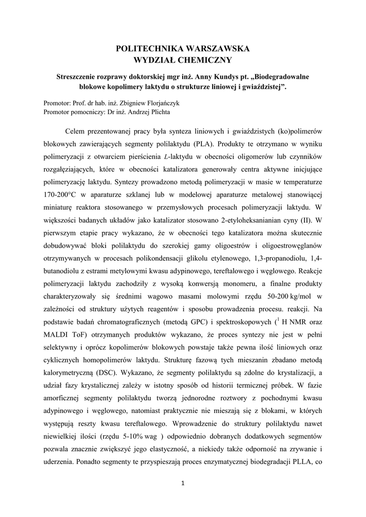 POLITECHNIKA WARSZAWSKA WYDZIAŁ CHEMICZNY Streszczenie rozprawy doktorskiej mgr inż. Anny Kundys pt. „Biodegradowalne blokowe kopolimery laktydu o strukturze liniowej i gwiaździstej”. Promotor: Prof. dr hab. inż. Zbigniew Florjańczyk Promotor pomocniczy: Dr inż. Andrzej Plichta Celem prezentowanej pracy była synteza liniowych i gwiaździstych (ko)polimerów blokowych zawierających segmenty polilaktydu (PLA). Produkty te otrzymano w wyniku polimeryzacji z otwarciem pierścienia L-laktydu w obecności oligomerów lub czynników rozgałęziających, które w obecności katalizatora generowały centra aktywne inicjujące polimeryzację laktydu. Syntezy prowadzono metodą polimeryzacji w masie w temperaturze 170-200°C w aparaturze szklanej lub w modelowej aparaturze metalowej stanowiącej miniaturę reaktora stosowanego w przemysłowych procesach polimeryzacji laktydu. W większości badanych układów jako katalizator stosowano 2-etyloheksanianian cyny (II). W pierwszym etapie pracy wykazano, że w obecności tego katalizatora można skutecznie dobudowywać bloki polilaktydu do szerokiej gamy oligoestrów i oligoestrowęglanów otrzymywanych w procesach polikondensacji glikolu etylenowego, 1,3-propanodiolu, 1,4butanodiolu z estrami metylowymi kwasu adypinowego, tereftalowego i węglowego. Reakcje polimeryzacji laktydu zachodziły z wysoką konwersją monomeru, a finalne produkty charakteryzowały się średnimi wagowo masami molowymi rzędu 50-200 kg/mol w zależności od struktury użytych reagentów i sposobu prowadzenia procesu. reakcji. Na podstawie badań chromatograficznych (metodą GPC) i spektroskopowych (1 H NMR oraz MALDI ToF) otrzymanych produktów wykazano, że proces syntezy nie jest w pełni selektywny i oprócz kopolimerów blokowych powstaje także pewna ilość liniowych oraz cyklicznych homopolimerów laktydu. Strukturę fazową tych mieszanin zbadano metodą kalorymetryczną (DSC). Wykazano, że segmenty polilaktydu są zdolne do krystalizacji, a udział fazy krystalicznej zależy w istotny sposób od historii termicznej próbek. W fazie amorficznej segmenty polilaktydu tworzą jednorodne roztwory z pochodnymi kwasu adypinowego i węglowego, natomiast praktycznie nie mieszają się z blokami, w których występują reszty kwasu tereftalowego. Wprowadzenie do struktury polilaktydu nawet niewielkiej ilości (rzędu 5-10% wag ) odpowiednio dobranych dodatkowych segmentów pozwala znacznie zwiększyć jego elastyczność, a niekiedy także odporność na zrywanie i uderzenia. Ponadto segmenty te przyspieszają proces enzymatycznej biodegradacji PLLA, co 1 stwarza możliwość wykorzystania otrzymanych materiałów w systemach kontrolowanego uwalniania leków. Najwyższy wzrost szybkości biodegradacji obserwowano dla materiałów z wbudowanymi pochodnymi kwasu adypinowego. Późniejsze bardziej szczegółowe badania przeprowadzone dla polimerów z wbudowanym poli(adypinianem butylenu) miały na celu sprawdzić czy do ich syntezy można użyć jako katalizatory acetyloacetoniany Li, Mg, Ca, Zn, Fe oraz Zr, które według danych literaturowych charakteryzują się znacznie mniejszą toksycznością niż stosowany powszechnie 2-etyloheksanianian cyny (II). Okazało się, że rodzaj użytego metalu ma istotny wpływ nie tylko na wydajność procesu i masy molowe produktów, ale także na proces racemizacji segmentów polilaktydu i związaną z tym ich zdolnością do krystalizacji i biodegradacji. Udział procesów racemizacji zwiększa się wraz ze wzrostem elektroujemności metalu stanowiącego centrum katalityczne. Z punktu widzenia praktycznego najbardziej atrakcyjne wydaje się użycie pochodnych cyrkonu i cynku, których aktywność jest praktycznie taka sama lub nieznacznie mniejsza niż katalizatorów cynowych. W ostatnim etapie pracy podjęto próbę otrzymania rozgałęzionych form PLA na drodze polimeryzacji L-LA w obecności czynników rozgałęziających zawierających w swojej strukturze od 3 do 25 grup hydroksylowych. Tego typu modyfikacja miała na celu otrzymanie pochodnych, które można wykorzystać do obniżania lepkości klasycznych liniowych odmian polilaktydu. Jako czynniki rozgałęziające użyto: trimetylolopropan, glicerol, pentaerytryt, dipentaerytryt, myo-inozytol oraz hiperrozgałęziony poliglicerol zawierający średnio 8, 13, 18 i 25 grup hydroksylowych. W tym wypadku proces także nie był w pełni selektywny i oprócz polimerów rozgałęzionych powstawały także cząsteczki o budowie liniowej i cyklicznej. Najbardziej efektywnym czynnikiem rozgałęziającym okazał się dipentaerytryt, w obecności którego można było otrzymywać materiały o wagowo średnich masach molowych przekraczających 200 kg/mol i współczynniku dyspersyjności poniżej 2. Wstępne obserwacje wskazują, że polimery te mają wyraźnie lepsze właściwości mechaniczne niż dostępne na rynku odmiany polilaktydu. Istotnym problemem w tych procesach jest słaba rozpuszczalność większości czynników rozgałęziających w monomerze, kłopotliwa procedura ich osuszania, a w niektórych wypadkach także niewielka reaktywność II rzędowych grup hydroksylowych. Wykazałam, że problemy te można stosunkowo łatwo rozwiązać poprzez reakcję związków rozgałęziających z węglanem etylenu w obecności węglanu potasu jako katalizatora. Taka modyfikacja prowadzi do wprowadzenia do struktury koinicjtora, pewnej ilości merów oksyetylenowych i węglanowych, które nadają produktom bardziej hydrofobowy charakter. Ponadto w wyniku reakcji dochodzi do wytworzenia grup końcowych, w których grupy hydroksylowe połączone są wyłącznie z grupami metylenowymi i dzięki temu mogą być 2 skutecznie wykorzystane do łączenia z segmentami polilaktydu. Badania prowadzone techniką GPC oraz analiza parametrów reologicznych w mini-wytłaczarce laboratoryjnej jednoznacznie wykazały, że otrzymane makrocząsteczki o budowie rozgałęzionej charakteryzują się 