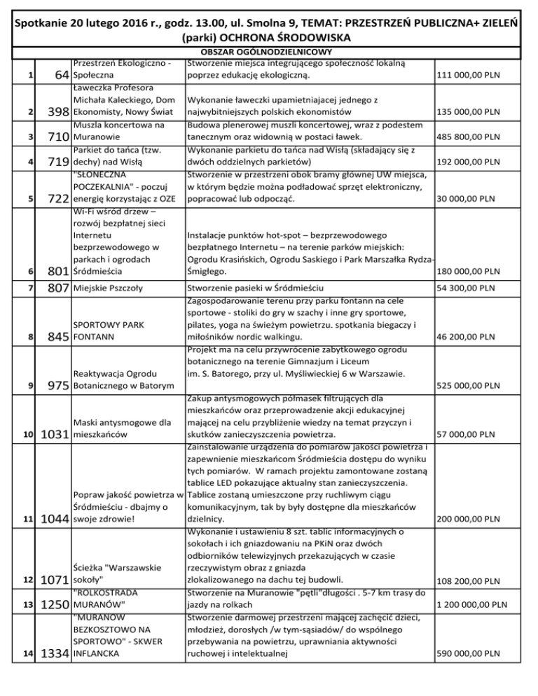 Spotkanie 20 lutego 2016 r., godz. 13.00, ul. Smolna 9, TEMAT: PRZESTRZEŃ PUBLICZNA+ ZIELEŃ (parki) OCHRONA ŚRODOWISKA 1 64 2 398 3 710 4 719 5 722 Przestrzeń Ekologiczno Społeczna Ławeczka Profesora Michała Kaleckiego, Dom Ekonomisty, Nowy Świat Muszla koncertowa na Muranowie Parkiet do tańca (tzw. dechy) nad Wisłą "SŁONECZNA POCZEKALNIA" - poczuj energię korzystając z OZE Wi-Fi wśród drzew – rozwój bezpłatnej sieci Internetu bezprzewodowego w parkach i ogrodach Śródmieścia 7 801 807 Miejskie Pszczoły 8 845 SPORTOWY PARK FONTANN 975 Reaktywacja Ogrodu Botanicznego w Batorym 6 9 10 1031 11 1044 12 1071 13 1250 14 1334 OBSZAR OGÓLNODZIELNICOWY Stworzenie miejsca integrującego społeczność lokalną poprzez edukację ekologiczną. Wykonanie ławeczki upamietniajacej jednego z najwybitniejszych polskich ekonomistów Budowa plenerowej muszli koncertowej, wraz z podestem tanecznym oraz widownią w postaci ławek. Wykonanie parkietu do tańca nad Wisłą (składający się z dwóch oddzielnych parkietów) Stworzenie w przestrzeni obok bramy głównej UW miejsca, w którym będzie można podładować sprzęt elektroniczny, popracować lub odpocząć. 111 000,00 PLN 135 000,00 PLN 485 800,00 PLN 192 000,00 PLN 30 000,00 PLN Instalacje punktów hot-spot – bezprzewodowego bezpłatnego Internetu – na terenie parków miejskich: Ogrodu Krasińskich, Ogrodu Saskiego i Park Marszałka RydzaŚmigłego. 180 000,00 PLN Stworzenie pasieki w Śródmieściu Zagospodarowanie terenu przy parku fontann na cele sportowe - stoliki do gry w szachy i inne gry sportowe, pilates, yoga na świeżym powietrzu. spotkania biegaczy i miłośników nordic walkingu. Projekt ma na celu przywrócenie zabytkowego ogrodu botanicznego na terenie Gimnazjum i Liceum im. S. Batorego, przy ul. Myśliwieckiej 6 w Warszawie. Zakup antysmogowych półmasek filtrujących dla mieszkańców oraz przeprowadzenie akcji edukacyjnej Maski antysmogowe dla mającej na celu przybliżenie wiedzy na temat przyczyn i mieszkańców skutków zanieczyszczenia powietrza. Zainstalowanie urządzenia do pomiarów jakości powietrza i zapewnienie mieszkańcom Śródmieścia dostępu do wyniku tych pomiarów. W ramach projektu zamontowane zostaną tablice LED pokazujące aktualny stan zanieczyszczenia. Popraw jakość powietrza w Tablice zostaną umieszczone przy ruchliwym ciągu Śródmieściu - dbajmy o komunikacyjnym, tak by były dostępne dla mieszkańców swoje zdrowie! dzielnicy. Wykonanie i ustawieniu 8 szt. tablic informacyjnych o sokołach i ich gniazdowaniu na PKiN oraz dwóch odbiorników telewizyjnych przekazujących w czasie Ścieżka "Warszawskie rzeczywistym obraz z gniazda sokoły" zlokalizowanego na dachu tej budowli. "ROLKOSTRADA Stworzenie na Muranowie "pętli"długości . 5-7 km trasy do MURANÓW" jazdy na rolkach "MURANÓW Stworzenie darmowej przestrzeni mającej zachęcić dzieci, BEZKOSZTOWO NA młodzież, dorosłych /w tym-sąsiadów/ do wspólnego SPORTOWO" - SKWER przebywania na powietrzu, uprawniania aktywności INFLANCKA ruchowej i intelektualnej 54 300,00 PLN 46 200,00 PLN 525 000,00 PLN 57 000,00 PLN 200 000,00 PLN 108 200,00 PLN 1 200 000,00 PLN 590 000,00 PLN Pomnik Krzysztofa Kamila Baczynskiego 15 1482 16 1498 Pij, Warszawo 17 1501 3 razy 10 metrów kwadratowych przestrzeni publicznej. Parklety na Śródmieściu. 1586 19 1934 20 2079 21 2111 22 2295 2413 Przystań Czerniaków 24 25 2554 2619 15 000,00 PLN 164 000,00 PLN Parklet to instalacja wykorzystująca fragment przestrzeni ulicy, który dotychczas wykorzystywany był do parkowania. Dzięki parkletom można stworzyć namiastkę przestrzeni publicznej 100 000,00 PLN Hydepark - strefa wolnego słowa - ma za zadanie stworzyć miejsce, gdzie różne grupy polityczne, zawodowe czy osoby prywatne będą mogły wyrażać swoje opinie czy organizować Hyde Park - strefa wolnego spotkania w trakcie, których będą mogły wyrażać swoje słowa niezadowolenie czy aprobatę w dowolnych sprawach. 4 000,00 PLN Informowanie mieszkańców kiedy powinni unikać aktywności fizycznej na powietrzu. W ramach projektu Tablica LED informująca o powstanie tablica LED pokazująca aktualny stan poziomie zanieczyszczenia zanieczyszczenia powietrza. powietrza w Śródmieściu 70 000,00 PLN Rewitalizujemy Park Wyeksponowanie Osi Stanisławowskiej w Parku Agrykola Agrykola na Osi poprzez zagospodarowanie zielenią Skarpy Ujazdowskiej i jej Stanisławowskiej podnóża 140 000,00 PLN Atrakcyjne, publicznie dostępne miejsce kultury i sportu zlokalizowane w unikalnej przestrzeni przy stacji PKP Powiśle. Estetyczna, bezpieczna i nietypowa przestrzeń, która promuje przyjazne relacje między osobami w każdym Skwer Powiśle wieku. 1 490 000,00 PLN Projekt zakłada wbudowanie pięciu trampolin w chodniki Miejskie Trampoliny bulwaru wiślanego. 25 000,00 PLN 18 23 Budowa pomnika na Placu Teatralnym w Warszawie Projekt obejmuje ustawienie na ulicach dzielnicy kranów/źródełek z wodą pitną podłączonych do miejskiej sieci wodociągowej. Odtworzenie gazowego oświetlenia na ul. Starej na Nowym Miescie w Warszawie Przywróćmy 2 fontanny pod platanami na Placu Defilad Instalacja pływającej, sezonowej przystani wodniackiej. 300 000,00 PLN Oświetlenie ciągu spacerowego ul. Starej realizowane byłoby przez 10 latarni gazowych 415 000,00 PLN Przywrócenie pierwotnej funkcji fontann w ważnym dla Warszawy miejscu. 500 000,00 PLN