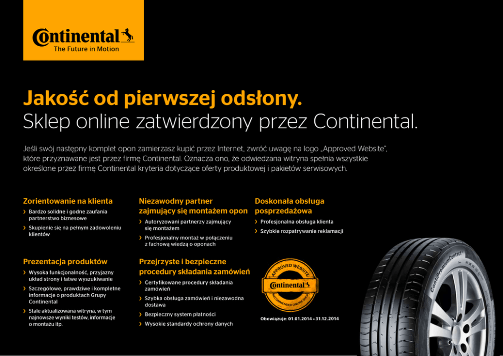 Jakość od pierwszej odsłony. Sklep online zatwierdzony przez Continental. Jeśli swój następny komplet opon zamierzasz kupić przez Internet, zwróć uwagę na logo „Approved Website”, Zorientowanie na klienta Bardzo solidne i godne zaufania partnerstwo biznesowe Skupienie się na pełnym zadowoleniu klientów Prezentacja produktów Wysoka funkcjonalność, przyjazny układ strony i łatwe wyszukiwanie Szczegółowe, prawdziwe i kompletne informacje o produktach Grupy Continental Stale aktualizowana witryna, w tym najnowsze wyniki testów, informacje o montażu itp. Niezawodny partner Doskonała obsługa zajmujący się montażem opon posprzedażowa Autoryzowani partnerzy zajmujący się montażem Profesjonalna obsługa klienta Szybkie rozpatrywanie reklamacji Profesjonalny montaż w połączeniu z fachową wiedzą o oponach Przejrzyste i bezpieczne procedury składania zamówień zamówień Szybka obsługa zamówień i niezawodna dostawa Bezpieczny system płatności Wysokie standardy ochrony danych Obowiązuje: 01.01.2014 – 31.12.2014 31.12.