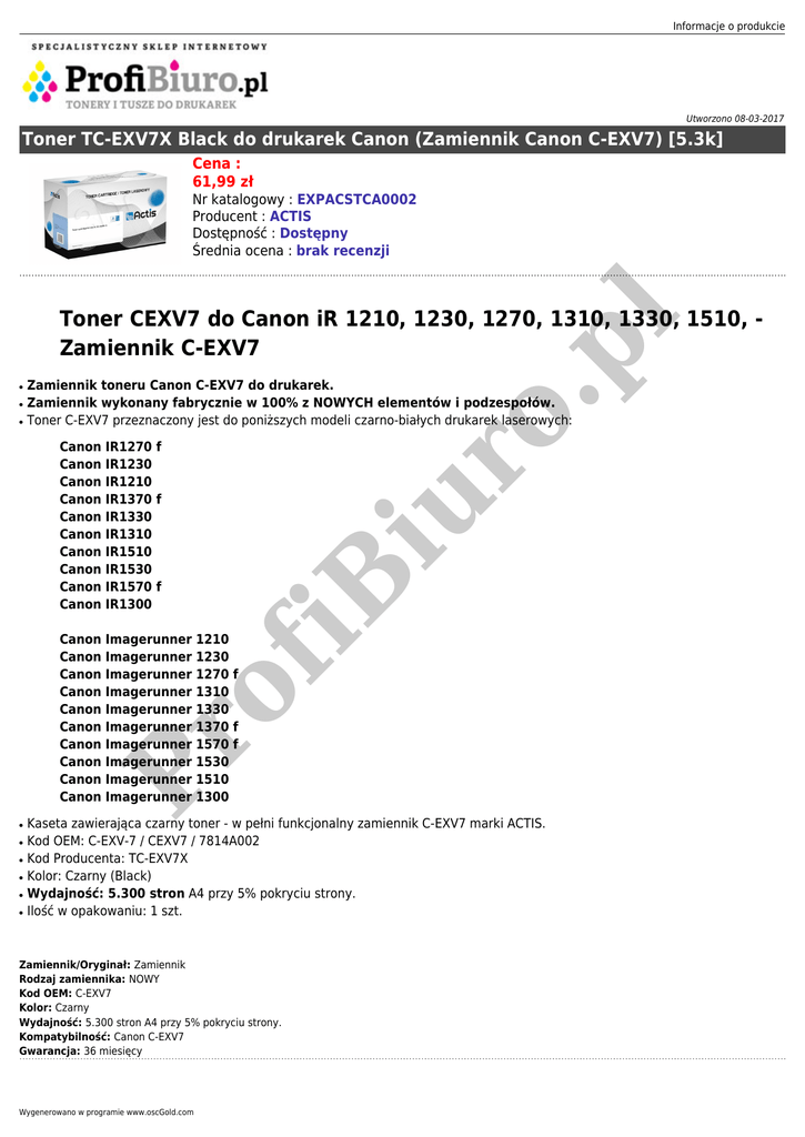 Informacje o produkcie Utworzono 08-03-2017 Toner TC-EXV7X Black do drukarek Canon (Zamiennik Canon C-EXV7) [5.3k] Cena : 61,99 zł Nr katalogowy : EXPACSTCA0002 Producent : ACTIS Dostępność : Dostępny Średnia ocena : brak recenzji ● ● ● ● ● ● IR1270 f IR1230 IR1210 IR1370 f IR1330 IR1310 IR1510 IR1530 IR1570 f IR1300 Canon Canon Canon Canon Canon Canon Canon Canon Canon Canon Imagerunner Imagerunner Imagerunner Imagerunner Imagerunner Imagerunner Imagerunner Imagerunner Imagerunner Imagerunner iu r Canon Canon Canon Canon Canon Canon Canon Canon Canon Canon iB ● Zamiennik toneru Canon C-EXV7 do drukarek. Zamiennik wykonany fabrycznie w 100% z NOWYCH elementów i podzespołów. Toner C-EXV7 przeznaczony jest do poniższych modeli czarno-białych drukarek laserowych: 1210 1230 1270 f 1310 1330 1370 f 1570 f 1530 1510 1300 of ● Pr ● o. pl Toner CEXV7 do Canon iR 1210, 1230, 1270, 1310, 1330, 1510, Zamiennik C-EXV7 Kaseta zawierająca czarny toner - w pełni funkcjonalny zamiennik C-EXV7 marki ACTIS. Kod OEM: C-EXV-7 / CEXV7 / 7814A002 Kod Producenta: TC-EXV7X Kolor: Czarny (Black) Wydajność: 5.300 stron A4 przy 5% pokryciu strony. Ilość w opakowaniu: 1 szt. Zamiennik/Oryginał: Zamiennik Rodzaj zamiennika: NOWY Kod OEM: C-EXV7 Kolor: Czarny Wydajność: 5.300 stron A4 przy 5% pokryciu strony. Kompatybilność: Canon C-EXV7 Gwarancja: 36 miesięcy Wygenerowano w programie www.oscGold.com
