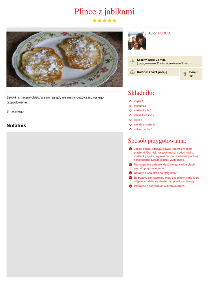 Plince z jabłkami Autor: PLOCIA Łączny czas: 23 min. ( przygotowanie 20 min. oczekiwanie 3 min. ) Kalorie: kcal/1 porcję Szybki i smaczny obiad, w sam raz gdy nie mamy dużo czasu na jego przygotowanie. Porcji: 12 Składniki: mąka 1 mleko 0,5 Smacznego! maślanka 0,5 jabłka kwaśne 2 jajko 1 Notatnik olej do smażenia 1 cukier puder 1 Sposób przygotowania: Jabłka obrać, odszypułkować i pokroić w małe plasterki. Do miski wsypać mąkę, dodać mleko, maślankę i jajka, wymieszać do uzyskania gładkiej konsystencji. Dodać jabłka i wymieszać. Na rozgrzaną patelnię kłaść nie za wielkie placki i piec do przyrumienienia. Smażyć z obu stron na złoty kolor. By pozbyć się nadmiaru oleju z placków kładę je po zdjęciu z patelni na chwilę na ręcznik papierowy. Podawać z posypanym cukrem pudrem.