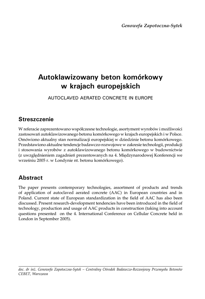 Genowefa Zapotoczna-Sytek Autoklawizowany beton komórkowy w krajach europejskich AUTOCLAVED AERATED CONCRETE IN EUROPE Streszczenie W referacie zaprezentowano współczesne technologie, asortyment wyrobów i możliwości zastosowań autoklawizowanego betonu komórkowego w krajach europejskich i w Polsce. Omówiono aktualny stan normalizacji europejskiej w dziedzinie betonu komórkowego. Przedstawiono aktualne tendencje badawczo-rozwojowe w zakresie technologii, produkcji i stosowania wyrobów z autoklawizowanego betonu komórkowego w budownictwie (z uwzględnieniem zagadnień prezentowanych na 4. Międzynarodowej Konferencji we wrześniu 2005 r. w Londynie nt. betonu komórkowego). Abstract The paper presents contemporary technologies, assortment of products and trends of application of autoclaved aerated concrete (AAC) in European countries and in Poland. Current state of European standardization in the field of AAC has also been discussed. Present research-development tendencies have been introduced in the field of technology, production and usage of AAC products in construction (taking into account questions presented on the 4. International Conference on Cellular Concrete held in London in September 2005). doc. dr inż. Genowefa Zapotoczna-Sytek – Centralny Ośrodek Badawczo-Rozwojowy Przemysłu Betonów CEBET, Warszawa