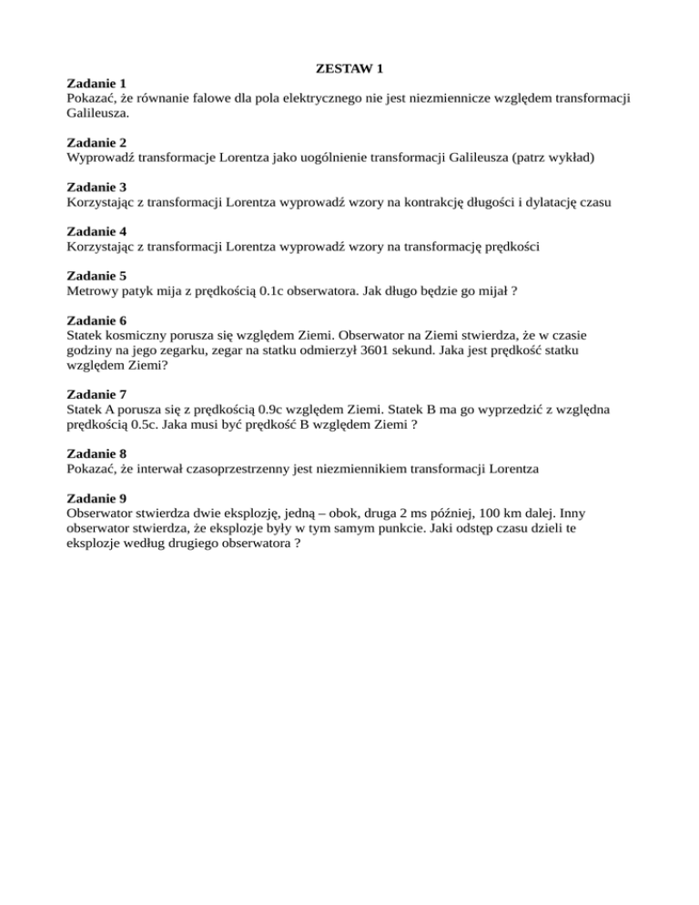 ZESTAW 1 Zadanie 1 Pokazać, że równanie falowe dla pola elektrycznego nie jest niezmiennicze względem transformacji Galileusza. Zadanie 2 Wyprowadź transformacje Lorentza jako uogólnienie transformacji Galileusza (patrz wykład) Zadanie 3 Korzystając z transformacji Lorentza wyprowadź wzory na kontrakcję długości i dylatację czasu Zadanie 4 Korzystając z transformacji Lorentza wyprowadź wzory na transformację prędkości Zadanie 5 Metrowy patyk mija z prędkością 0.1c obserwatora. Jak długo będzie go mijał ? Zadanie 6 Statek kosmiczny porusza się względem Ziemi. Obserwator na Ziemi stwierdza, że w czasie godziny na jego zegarku, zegar na statku odmierzył 3601 sekund. Jaka jest prędkość statku względem Ziemi? Zadanie 7 Statek A porusza się z prędkością 0.9c względem Ziemi. Statek B ma go wyprzedzić z względna prędkością 0.5c. Jaka musi być prędkość B względem Ziemi ? Zadanie 8 Pokazać, że interwał czasoprzestrzenny jest niezmiennikiem transformacji Lorentza Zadanie 9 Obserwator stwierdza dwie eksplozję, jedną – obok, druga 2 ms później, 100 km dalej. Inny obserwator stwierdza, że eksplozje były w tym samym punkcie. Jaki odstęp czasu dzieli te eksplozje według drugiego obserwatora ?