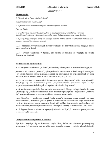 20.12.2015 4. Niedziela w adwencie Grzegorz Olek Tekst: Flp 4,4-7 Tłumaczenie: 4. Cieszcie się w Panu w każdej chwili! Jeszcze raz mówię: cieszcie się! 5. Wyrozumiałość wasza niech będzie znana wszystkim ludziom. Pan jest blisko. 6. O żadną rzecz się [nie] troszczcie, lecz w każdej [sprawie], w modlitwie i prośbie [modlitewnej], niech z wdzięcznością prośby wasze będą przedstawiane przed Bogiem. 7. A pokój Boży, który jest lepszy od każdego rozumu, będzie czuwać w Chrystusie Jezusie nad sercami waszymi i myślami waszymi. […] – oznaczają wyrazy, których nie ma w tekście, ale przy tłumaczeniu na język polski należy/można je dodać (…) – wyrazy występują w tekście, ale można je pominąć ze względu na polską składnię (są zbędne) Komentarz do tłumaczenia: w. 4. en kyrio – dosłownie „w Panu”, należałoby odczytywać w znaczeniu relacyjnym pantote – nie oznacza „zawsze”, tylko podkreśla zachowanie w konkretnych sytuacjach i w użyciu takiego słowa można dopatrzeć się nawiązania do wspomnianych w liście określonych i trudnych doświadczeń adresatów (np. Flp 1,29). w. 5. to epieikes – najczęściej tłumaczone przez „łagodność” albo „uprzejmość”, decyduję się na tłumaczenie przez „wyrozumiałość”, ponieważ lepiej oddaje to przyjazny stosunek do innych niż ogólne określenie „łagodność”. w. 6. merimnaoo – posiada dwa aspekty znaczeniowe i dlatego najlepiej oddać je przez „troszczyć się”, które również może mieć znaczenie pozytywne i negatywne. „Martwić się” jest nacechowane w języku polskim wyłącznie negatywnie. gnooridzesthoo – dosłownie „niech będą znane”, tłumaczę przez „niech … będą przedstawiane”, ponieważ jest to jeden z aspektów znaczeniowych tego czasownika i w tym fragmencie pasuje znacznie lepiej niż ogólne tłumaczenie, podkreślając akt przedstawiania próśb Bogu w modlitwie, a nie tylko kwestię informowania Go o nich. w. 7. hyperechousa – słowo to występuje również w Flp 2,3 i oznacza przewyższanie w jakości bądź wartości. Umiejscowienie fragmentu w księdze: Flp 4,4-7 znajduje się w końcowej części listu, która ma charakter parenetyczny (pouczający). Nawiązuje ona do głównych tematów pisma – radości chrześcijańskiej 1 20.12.2015 4. Niedziela w adwencie Grzegorz Olek nawet w obliczu prześladowań, relacji zboru do otoczenia oraz do podziałów, jakie dokonały się wśród wierzących w Filippi. Fragment zawiera trzy wyraźnie oddzielone imperatywy, których nie należy ze sobą łączyć – to wezwanie do radości (4,4), do wyrozumiałości (4,5) i porzucenia troski (4,6). Takie asyndetyczne, bezspójnikowe konstrukcje są charakterystyczne dla pouczających części listów, które zawierają zbiory różnorodnych napomnień. Komentarz: w. 4. List do Filipian jest jedynym z listów Apostoła Pawła, w którym pisze on tak dużo o radości – samych form czasownikowych jest aż dziewięć! Chairete bywało w listach zwyczajowym pożegnaniem, w tym fragmencie jest to jednak połączenie tradycyjnego zwrotu pożegnania z wezwaniem do radości ze względu na przywilej szczególnej więzi z Bogiem w Chrystusie. Warto podkreślić, że Paweł kieruje to wezwanie do chrześcijan w Filippi w czasie, kiedy sam siedzi w więzieniu (Flp 1,12-14). Temat radości w obliczu cierpień i prześladowań (m.in. 1,29-30) oraz w obliczu problemów z jednością wśród wierzących (m.in. 1,27 i 2,1-4) jest w tym liście bardzo istotny i przy interpretacji należy to uwzględnić. Flp 4,4 jest powtórzeniem wezwania z 3,1, przy użyciu dwóch czasowników w trybie rozkazującym. Podstawą wezwania do radości jest Jezus Chrystus, Pan i objawiona w Nim sprawiedliwość (Flp 1,21-24; 3,7-12). Dzięki temu wezwanie do radości w życiu chrześcijanina nie jest zależne od uwarunkowań zewnętrznych i stanowi według Pawła jedną z cech charakterystycznych chrześcijanina (Rzym 12,12; 14,17) oraz owoc Ducha Świętego (Ga 5,22-23; por. I Tes 1,6). w. 5. Werset 5. nie jest gramatycznie powiązany z wersetem 4. to epieikes jest postępowaniem wobec ludzi nacechowanym łagodnością i wyrozumiałością, przeciwieństwem do bezlitosnego przestrzegania litery prawa i zasad. Uosobieniem tej pozytywnej postawy był Chrystus, a adresaci są wezwani do naśladowania jego postawy (w podobnym tonie 2,5-11). Tłumaczenie przez „wyrozumiałość” lepiej podkreśla to, że ma to być postawa wobec wszystkich, również tych, którzy są wrogo do chrześcijan w Filippi nastawieni i tak wobec nich postępują. Stwierdzenie „Pan jest blisko” pojawia się nagle i nie jest powiązane gramatycznie z poprzedzającym je zdaniem. Można to stwierdzenie rozumieć dwojako, w zależności od interpretacji przysłówka engys – odczytanie przestrzenne oznaczałoby realną obecność Pana wśród wierzących, a czasowe wskazywałoby na oczekiwanie jego powtórnego przyjścia w najbliższej przyszłości. Najczęściej interpretuje się ten przysłówek w znaczeniu czasowym, jako uzasadnienie postawy wyrozumiałości, choć niewykluczone jest przyjęcie obu znaczeń jednocześnie. Wtedy Apostoł przypominałby adresatom, że Pan jest zarówno obecny, jak i wkrótce przyjdzie w pełni widoczny sposób. Dzięki temu adresaci mogą być tym bardziej łaskawi nawet dla ludzi wrogo do nich usposobionych. W liście Jakuba 5,7-8 czytamy o podobnej motywacji do przyjęcia określonej postawy przez adresatów listu. w. 6. Przypomnienie o bliskości Pana można również interpretować jako wprowadzenie wersetu 6., który podejmuje kwestię szkodliwej troski. merimnate w języku greckim oznacza zarówno „dbałość o kogoś, zabieganie o coś” (tak o Tymoteuszu w Flp 2,20), jak i „zmartwienie, utrapienie, uczucie niepokoju”. Polskie słowo „troska” ma również 2 20.12.2015 4. Niedziela w adwencie Grzegorz Olek oba odcienie znaczeniowe