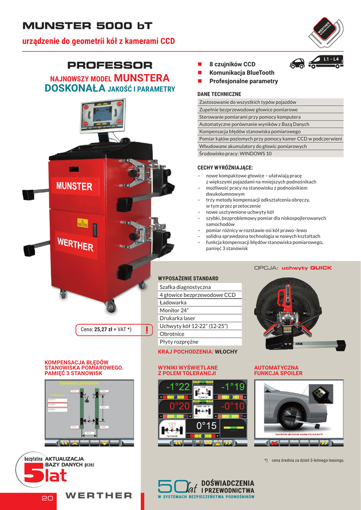 munster 5000 bT urządzenie do geometrii kół z kamerami CCD professor najnowszy model MUNSTERA doskonała jakość i parametry 8 czujników CCD Komunikacja BlueTooth Profesjonalne parametry Dane techniczne Zastosowanie do wszystkich typów pojazdów Zupełnie bezprzewodowe głowice pomiarowe Sterowanie pomiarami przy pomocy komputera Automatyczne porównanie wyników z Bazą Danych Kompensacja błędów stanowiska pomiarowego Pomiar kątów poziomych przy pomocy kamer CCD w podczerwieni Wbudowane akumulatory do głowic pomiarowych Środowisko pracy: WINDOWS 10 Cechy wyróżniające: – – – – – – – – nowe kompaktowe głowice – ułatwiają pracę z większymi pojazdami na mniejszych podnośnikach możliwość pracy na stanowisku z podnośnikiem dwukolumnowym trzy metody kompensacji odkształcenia obręczy, w tym przez przetoczenie nowe usztywnione uchwyty kół szybki, bezproblemowy pomiar dla niskospojlerowanych samochodów pomiar różnicy w rozstawie osi kół prawo–lewo solidna sprawdzona technologia w nowych kształtach funkcja kompensacji błędów stanowiska pomiarowego, pamięć 3 stanowisk OPCJA: uchwyty QUICK Wyposażenie standard Cena: 25,27 zł + VAT *) Szafka diagnostyczna 4 głowice bezprzewodowe CCD Ładowarka Monitor 24” Drukarka laser Uchwyty kół 12-22” (12-25”) Obrotnice Płyty rozprężne Kraj pochodzenia: WŁOCHY Kompensacja błędów stanowiska pomiarowego. Pamięć 3 stanowisk Wyniki wyświetlane z polem tolerancji Automatyczna funkcja SPOILER *) cena średnia za dzień 3-letniego leasingu 20 werther