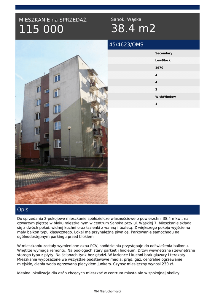 MIESZKANIE na SPRZEDAŻ 115 000 Sanok, Wąska 38.4 m2 45/4623/OMS Secondary LowBlock 1970 4 4 2 WithWindow 1 Opis Do sprzedania 2-pokojowe mieszkanie spółdzielcze własnościowe o powierzchni 38,4 mkw., na czwartym piętrze w bloku mieszkalnym w centrum Sanoka przy ul. Wąskiej 7. Mieszkanie składa się z dwóch pokoi, widnej kuchni oraz łazienki z wanną i toaletą. Z większego pokoju wyjście na mały balkon typu klasycznego. Lokal ma przynależną piwnicę. Parkowanie samochodu na ogólnodostępnym parkingu przed blokiem. W mieszkaniu zostały wymienione okna PCV, spółdzielnia przystępuje do odświeżenia balkonu. Wnętrze wymaga remontu. Na podłogach stary parkiet i linoleum. Drzwi wewnętrzne i zewnętrzne starego typu z płyty. Na ścianach tynk bez gładzi. W łazience i kuchni brak glazury i terakoty. Mieszkanie wyposażone we wszystkie podstawowe media: prąd, gaz, centralne ogrzewanie miejskie, ciepła woda ogrzewana piecykiem junkers. Czynsz miesięczny wynosi 230 zł. Idealna lokalizacja dla osób chcących mieszkać w centrum miasta ale w spokojnej okolicy. MM Nieruchomości Wszędzie blisko. W sąsiedztwie szkoły, przedszkole, urzędy, przychodnia, szpital, galeria handlowa, park, komunikacja miejska. Zapraszam serdecznie do obejrzenia nieruchomości. Nr oferty w Biurze 45/4623/OMS. Joanna Skrzypińska Agent ds. nieruchomości MM Nieruchomości tel. 502 477 701 Oddział Sanok: ul. Szopena 10 tel. +48 13 492 41 61 +48 881-799-704 e-mail.: [email protected] MM Nieruchomości oddział w Sanoku tel. +48 13 492 41 61 +48 881-799-704 ZAPŁACISZ TYLKO WTEDY, KIEDY OKAŻEMY SIĘ SKUTECZNI! MM 360 tel. +48 881 799 704; +48 13 492 41 61 email: [email protected] MM Nieruchomości Powered by TCPDF (www.tcpdf.org)