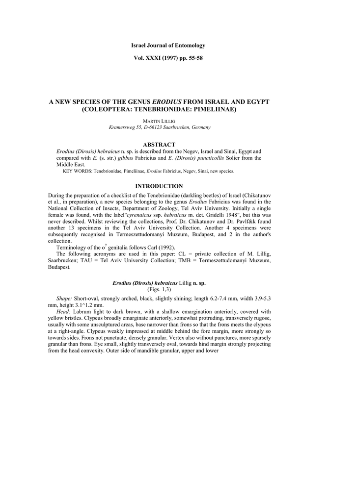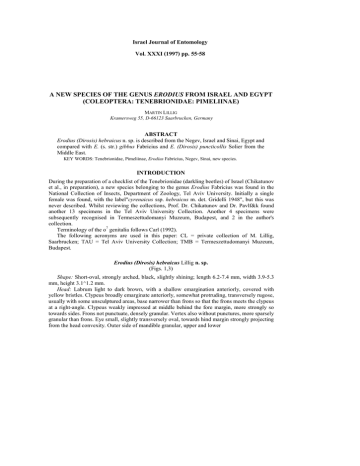 Israel Journal of Entomology Vol. XXXI (1997) pp. 55-58 A NEW SPECIES OF THE GENUS ERODIUS FROM ISRAEL AND EGYPT (COLEOPTERA: TENEBRIONIDAE: PIMELIINAE) MARTIN LILLIG Kramersweg 55, D-66123 Saarbrucken, Germany ABSTRACT Erodius (Dirosis) hebraicus n. sp. is described from the Negev, Israel and Sinai, Egypt and compared with E. (s. str.) gibbus Fabricius and E. (Dirosis) puncticollis Solier from the Middle East. KEY WORDS: Tenebrionidae, Pimeliinae, Erodius Fabricius, Negev, Sinai, new species. INTRODUCTION During the preparation of a checklist of the Tenebrionidae (darkling beetles) of Israel (Chikatunov et al., in preparation), a new species belonging to the genus Erodius Fabricius was found in the National Collection of Insects, Department of Zoology, Tel Aviv University. Initially a single female was found, with the label"cyrenaicus ssp. hebraicus m. det. Gridelli 1948", but this was never described. Whilst reviewing the collections, Prof. Dr. Chikatunov and Dr. Pavlf&k found another 13 specimens in the Tel Aviv University Collection. Another 4 specimens were subsequently recognised in Termeszettudomanyi Muzeum, Budapest, and 2 in the author's collection. Terminology of the o7 genitalia follows Carl (1992). The following acronyms are used in this paper: CL = private collection of M. Lillig, Saarbrucken; TAU = Tel Aviv University Collection; TMB = Termeszettudomanyi Muzeum, Budapest. Erodius (Dirosis) hebraicus Lillig n. sp. (Figs. 1,3) Shape: Short-oval, strongly arched, black, slightly shining; length 6.2-7.4 mm, width 3.9-5.3 mm, height 3.1^1.2 mm. Head: Labrum light to dark brown, with a shallow emargination anteriorly, covered with yellow bristles. Clypeus broadly emarginate anteriorly, somewhat protruding, transversely rugose, usually with some unsculptured areas, base narrower than frons so that the frons meets the clypeus at a right-angle. Clypeus weakly impressed at middle behind the fore margin, more strongly so towards sides. Frons not punctuate, densely granular. Vertex also without punctures, more sparsely granular than frons. Eye small, slightly transversely oval, towards hind margin strongly projecting from the head convexity. Outer side of mandible granular, upper and lower