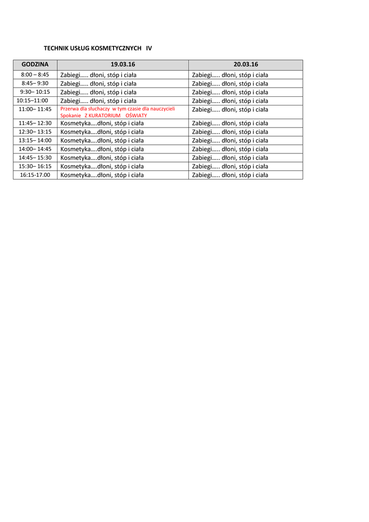 TECHNIK USŁUG KOSMETYCZNYCH IV GODZINA 8:00 – 8:45 8:45– 9:30 9:30– 10:15 10:15–11:00 11:00– 11:45 11:45– 12:30 12:30– 13:15 13:15– 14:00 14:00– 14:45 14:45– 15:30 15:30– 16:15 16:15-17.00 19.03.16 Zabiegi….. dłoni, stóp i ciała Zabiegi….. dłoni, stóp i ciała Zabiegi….. dłoni, stóp i ciała Zabiegi….. dłoni, stóp i ciała Przerwa dla słuchaczy w tym czasie dla nauczycieli Spokanie Z KURATORIUM OŚWIATY Kosmetyka….dłoni, stóp i ciała Kosmetyka….dłoni, stóp i ciała Kosmetyka….dłoni, stóp i ciała Kosmetyka….dłoni, stóp i ciała Kosmetyka….dłoni, stóp i ciała Kosmetyka….dłoni, stóp i ciała Kosmetyka….dłoni, stóp i ciała 20.03.16 Zabiegi….. dłoni, stóp i ciała Zabiegi….. dłoni, stóp i ciała Zabiegi….. dłoni, stóp i ciała Zabiegi….. dłoni, stóp i ciała Zabiegi….. dłoni, stóp i ciała Zabiegi….. dłoni, stóp i ciała Zabiegi….. dłoni, stóp i ciała Zabiegi….. dłoni, stóp i ciała Zabiegi….. dłoni, stóp i ciała Zabiegi….. dłoni, stóp i ciała Zabiegi….. dłoni, stóp i ciała Zabiegi….. dłoni, stóp i ciała