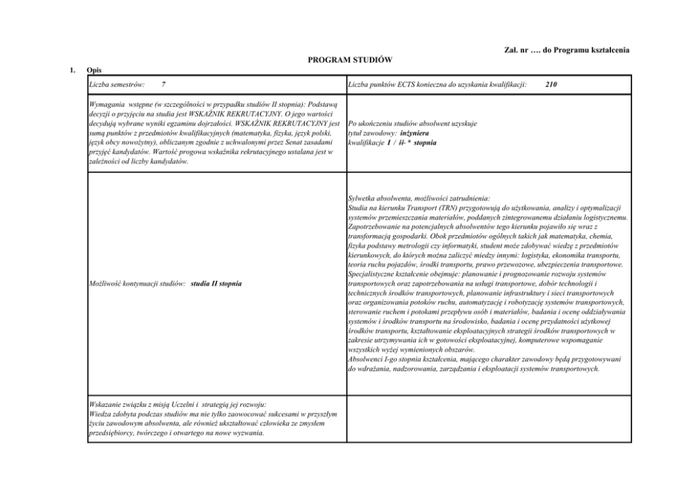 Zał. nr …. do Programu kształcenia PROGRAM STUDIÓW 1. Opis Liczba semestrów: 7 Liczba punktów ECTS konieczna do uzyskania kwalifikacji: 210 Wymagania wstępne (w szczególności w przypadku studiów II stopnia): Podstawą decyzji o przyjęciu na studia jest WSKAŹNIK REKRUTACYJNY. O jego wartości decydują wybrane wyniki egzaminu dojrzałości. WSKAŹNIK REKRUTACYJNY jest sumą punktów z przedmiotów kwalifikacyjnych (matematyka, fizyka, język polski, język obcy nowożytny), obliczanym zgodnie z uchwalonymi przez Senat zasadami przyjęć kandydatów. Wartość progowa wskaźnika rekrutacyjnego ustalana jest w zależności od liczby kandydatów. Po ukończeniu studiów absolwent uzyskuje tytuł zawodowy: inżyniera kwalifikacje I / II * stopnia Możliwość kontynuacji studiów: studia II stopnia Sylwetka absolwenta, możliwości zatrudnienia: Studia na kierunku Transport (TRN) przygotowują do użytkowania, analizy i optymalizacji systemów przemieszczania materiałów, poddanych zintegrowanemu działaniu logistycznemu. Zapotrzebowanie na potencjalnych absolwentów tego kierunku pojawiło się wraz z transformacją gospodarki. Obok przedmiotów ogólnych takich jak matematyka, chemia, fizyka podstawy metrologii czy informatyki, student może zdobywać wiedzę z przedmiotów kierunkowych, do których można zaliczyć miedzy innymi: logistyka, ekonomika transportu, teoria ruchu pojazdów, środki transportu, prawo przewozowe, ubezpieczenia transportowe. Specjalistyczne kształcenie obejmuje: planowanie i prognozowanie rozwoju systemów transportowych oraz zapotrzebowania na usługi transportowe, dobór technologii i technicznych środków transportowych, planowanie infrastruktury i sieci transportowych oraz organizowania potoków ruchu, automatyzację i robotyzację systemów transportowych, sterowanie ruchem i potokami przepływu osób i materiałów, badania i ocenę oddziaływania systemów i środków transportu na środowisko, badania i ocenę przydatności użytkowej środków transportu, kształtowanie eksploatacyjnych strategii środków transportowych w zakresie utrzymywania ich w gotowości eksploatacyjnej, komputerowe wspomaganie wszystkich wyżej wymienionych obszarów. Absolwenci I-go stopnia kształcenia, mającego charakter zawodowy będą przygotowywani do wdrażania, nadzorowania, zarządzania i eksploatacji systemów transportowych. Wskazanie związku z misją Uczelni i strategią jej rozwoju: Wiedza zdobyta podczas studiów ma nie tylko zaowocować sukcesami w przyszłym życiu zawodowym absolwenta, ale również ukształtować człowieka ze zmysłem przedsiębiorcy, twórczego i otwartego na nowe wyzwania. 2. Dziedziny nauki i dyscypliny naukowe, do których odnoszą się efekty kształcenia: Budowa i eksploatacja maszyn (dyscyplina wiodąca), Mechanika, Inżynieria produkcji 3. Zwięzła analiza zgodności zakładanych efektów kształcenia z potrzebami rynku pracy Efekty kształcenia odnoszą się nie tylko do transportu, ale również ze względu na wymagania nowoczesnego przemysłu do mechaniki, automatyki i robotyki, mechatroniki oraz informatyki i technologii informatycznych. Uzyskanie zakładanych efektów kształcenia pozwoli absolwentowi na znalezienie atrakcyjnej i ciekawej pracy we wszystkich gałęziach przemysłu, jak również na uruchomienie własnej działalności gospodarczej. Prace nad efektami kształcenia były referowane i dyskutowane na zebraniach Konwentu Wydziału Mechanicznego, w skład którego wchodzą między innymi przedstawiciele zakładów przemysłowych z Polski, ze szczególnym uwzględnieniem Dolnego Śląska i województw sąsiednich. 4. Lista modułów kształcenia: 4.1. Lista modułów obowiązkowych: 4.1.1 Lista modułów kształcenia ogólnego 4.1.1.1 Moduł Przedmioty humanistyczno-menedżerskie (min. 1 pkt. ECTS): L.p. Kod kursu/ grupy kursów Nazwa kursu/grupy kursów (grupę kursów oznaczyć symbolem GK) Tygodniowa liczba godzin w ć l p s ZZU Liczba pkt. ECTS 2 Forma Sposób Kurs/grupa kursów 3 kursu/ o zajęć grupy zalicze- ogólnocharakt. rodzaj6 typ7 CNPS łączna 4 1 kursów nia ucz. 5 BK Liczba godzin Symbol kierunkowego efektu kształcenia Prakt. 1. TRM031011W Podstawy zarządzania 1 Razem 4.1.1.2 Moduł L.p. Kod kursu/ grupy kursów K1TR_W02, K1TR_W21, K1TR_K05 1 0 0 0 0 15 30 1 0,6 15 30 1 0,6 T z KO Ob. Języki obce (min. ...... pkt. ECTS): Nazwa kursu/grupy kursów (grupę kursów oznaczyć symbolem GK) Tygodniowa liczba godzin w ć l p s ZZU Liczba pkt. ECTS 2 Forma Sposób Kurs/grupa kursów 3 kursu/ o zajęć grupy zalicze- ogólnocharakt. rodzaj6 typ7 CNPS łączna 4 1 kursów nia ucz. 5 BK Liczba godzin Symbol kierunkowego efektu kształcenia Prakt. Razem 4.1.1.3 Moduł L.p. Kod kursu/ grupy kursów 0 0 0 0 0 0 0 0 0 Zajęcia sportowe (min. ...... pkt. ECTS): Nazwa kursu/grupy kursów (grupę kursów oznaczyć symbolem GK) Tygodniowa liczba godzin w ć l p s ZZU Liczba pkt. ECTS Forma2 Sposób Kurs/grupa kursów 3 kursu/ o zajęć grupy zalicze- ogólnocharakt. rodzaj6 typ7 CNPS łączna 4 1 kursów nia ucz. 5 BK Liczba godzin Symbol kierunkowego efektu kształcenia Prakt. Razem 4.1.1.4 Moduł L.p. Kod kursu/ grupy kursów 0 0 0 0 0 0 0 0 0 Technologie informacyjne (min. 2 pkt. ECTS): Nazwa kursu/grupy kursów (grupę kursów oznaczyć symbolem GK) Tygodniowa liczba godzin w ć l p s ZZU Liczba pkt. ECTS Forma2 Sposób Kurs/grupa kursów 3 kursu/ o zajęć grupy zalicze- ogólnocharakt. rodzaj6 typ7 CNPS łączna 4 1 kursów nia ucz. 5 BK Liczba godzin Symbol kierunkowego efektu kształcenia Prakt. 1. TRM031003W Technologie informacyjne K1TR_W05, K1TR_W12, K1TR_W16, K1TR_W20, K1TR_K09 2 Razem 2 0 0 0 0 30 60 2 1,2 30 60 2 1,2 T z Razem dla modułów kształcenia ogólnego Łączna liczba godzin w 3 ć 0 l 0 p 0 s 0 Łączna liczba godzin ZZU Łączna liczba godzin CNPS Łączna liczba punktów ECTS Liczba punktów ECTS zajęć BK1 45 90 3 1,8 PD Ob. 4.1.2 Lista modułów z zakresu nauk podstawowych